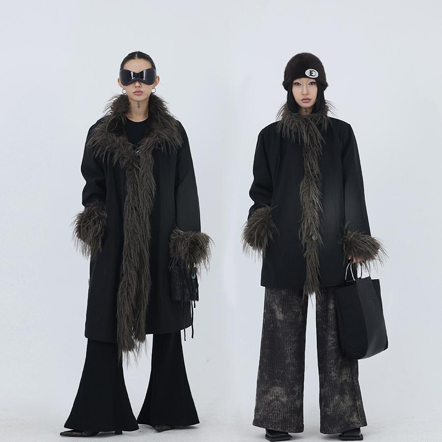 FUZZYKON original design plush lining stand-up collar raw edge black cotton jacket length/midi