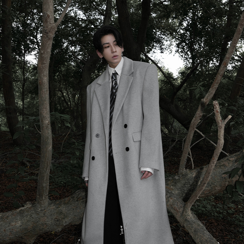 Tweed coat, men's gray autumn/winter mid-length thickened loose over the knee trench coat, men's Korean version of woolen blazer