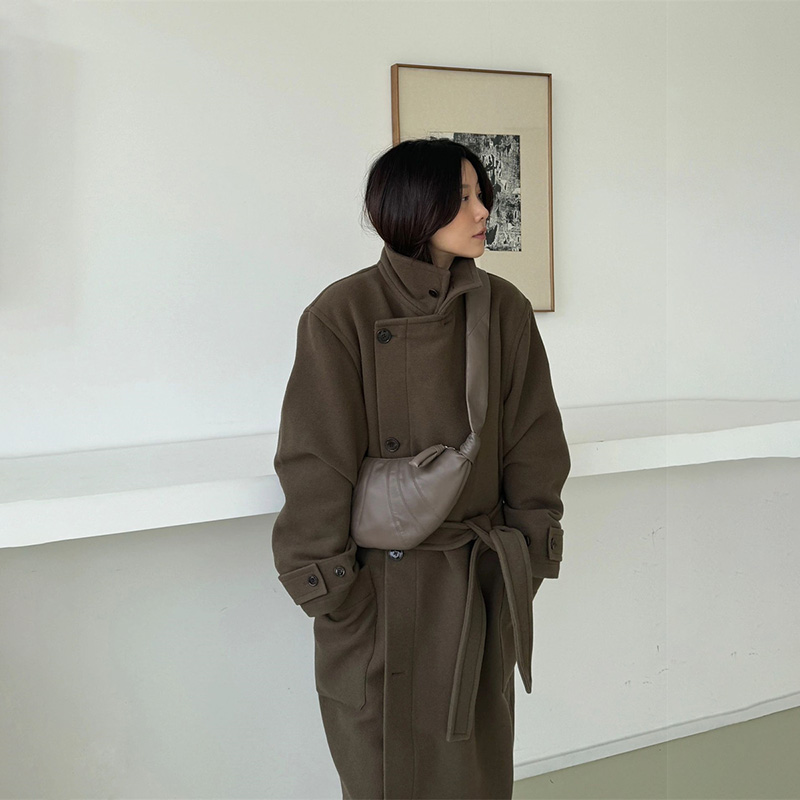 Oclin silhouette wool lapel coat blend wool midi length hidden breast placket brown inside 50% wool