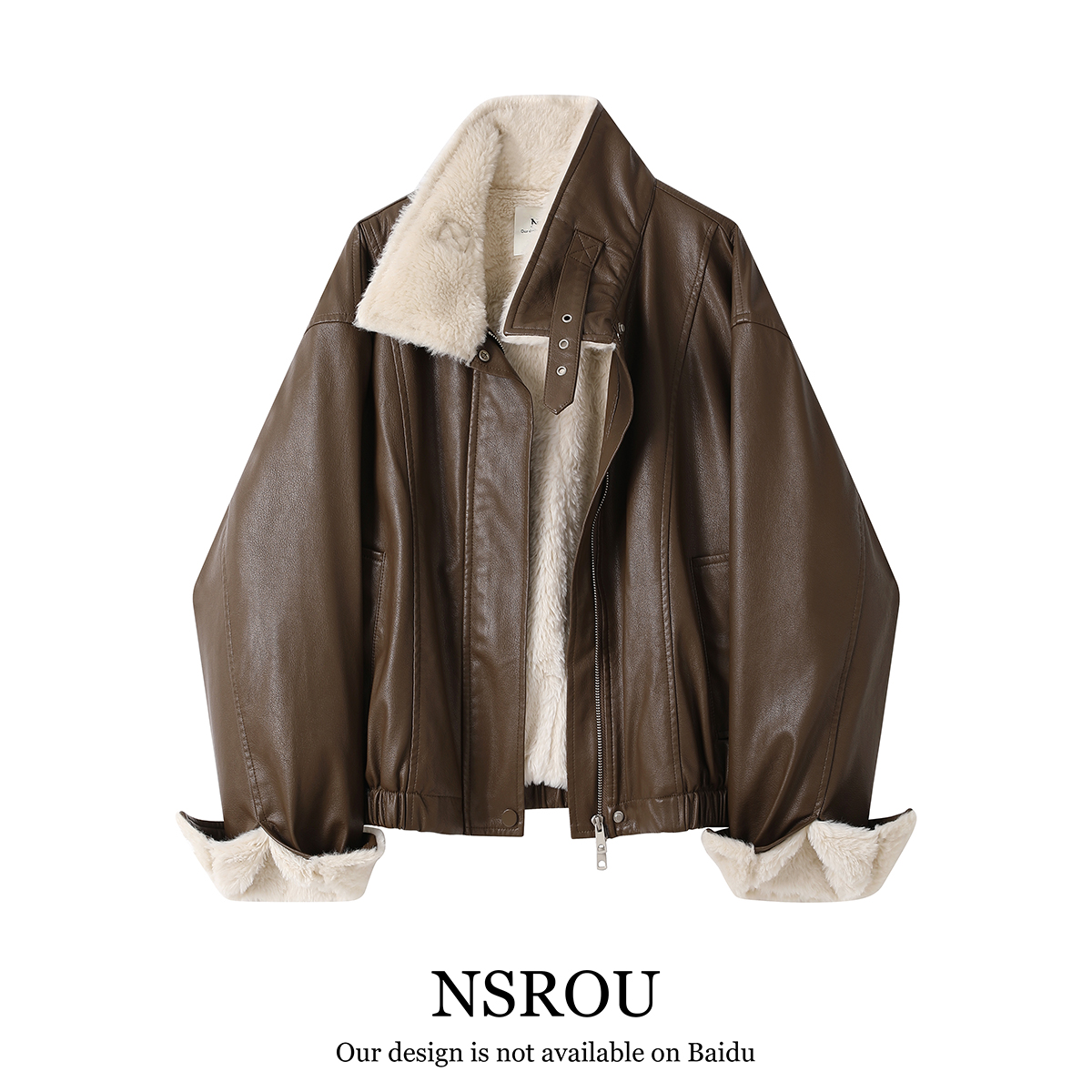 NSROU vintage Maillard plus fleece stand-up collar cropped leather jacket women's winter American motorcycle lambswool jacket