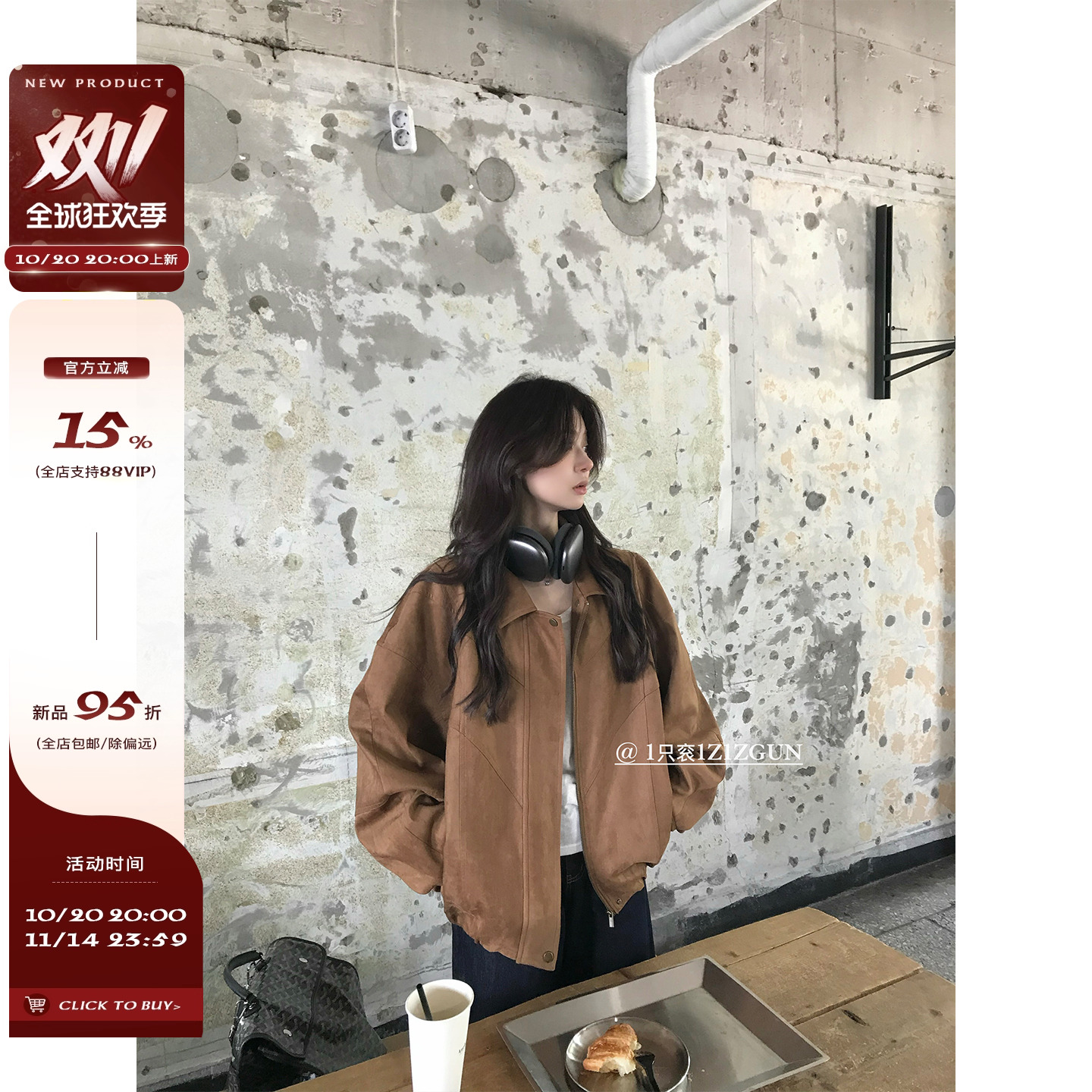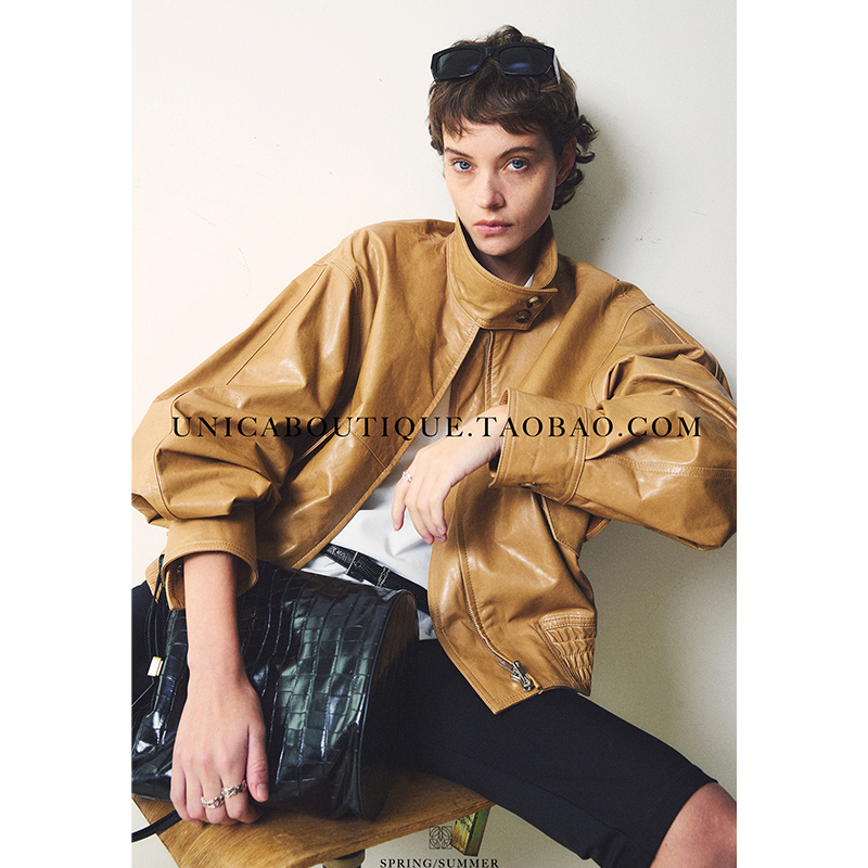 Maillard brown motorcycle leather jacket women's autumn American retro loose jacket amber