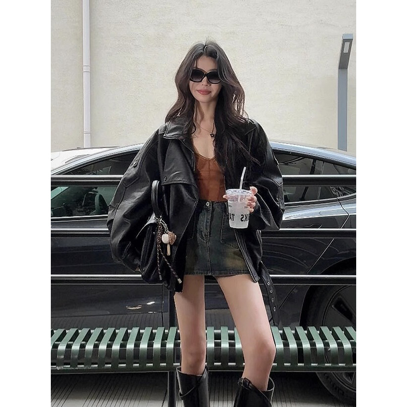 Leather jacket women's 2025 autumn new black cool sassy loose PU motorcycle American fleece thickened leather jacket