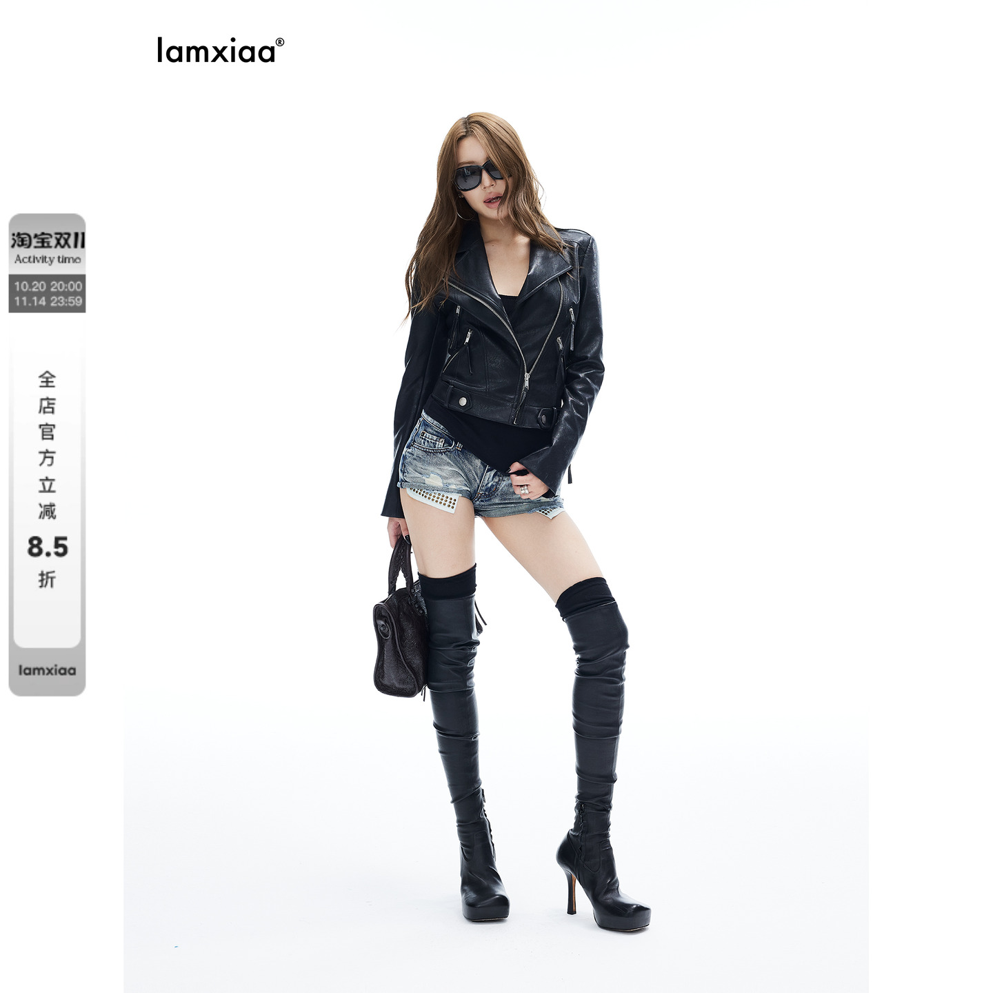 iamxiaa* eco-friendly leather heavy work matte notch lapel cool zipper functional functional style slim fit cropped leather jacket