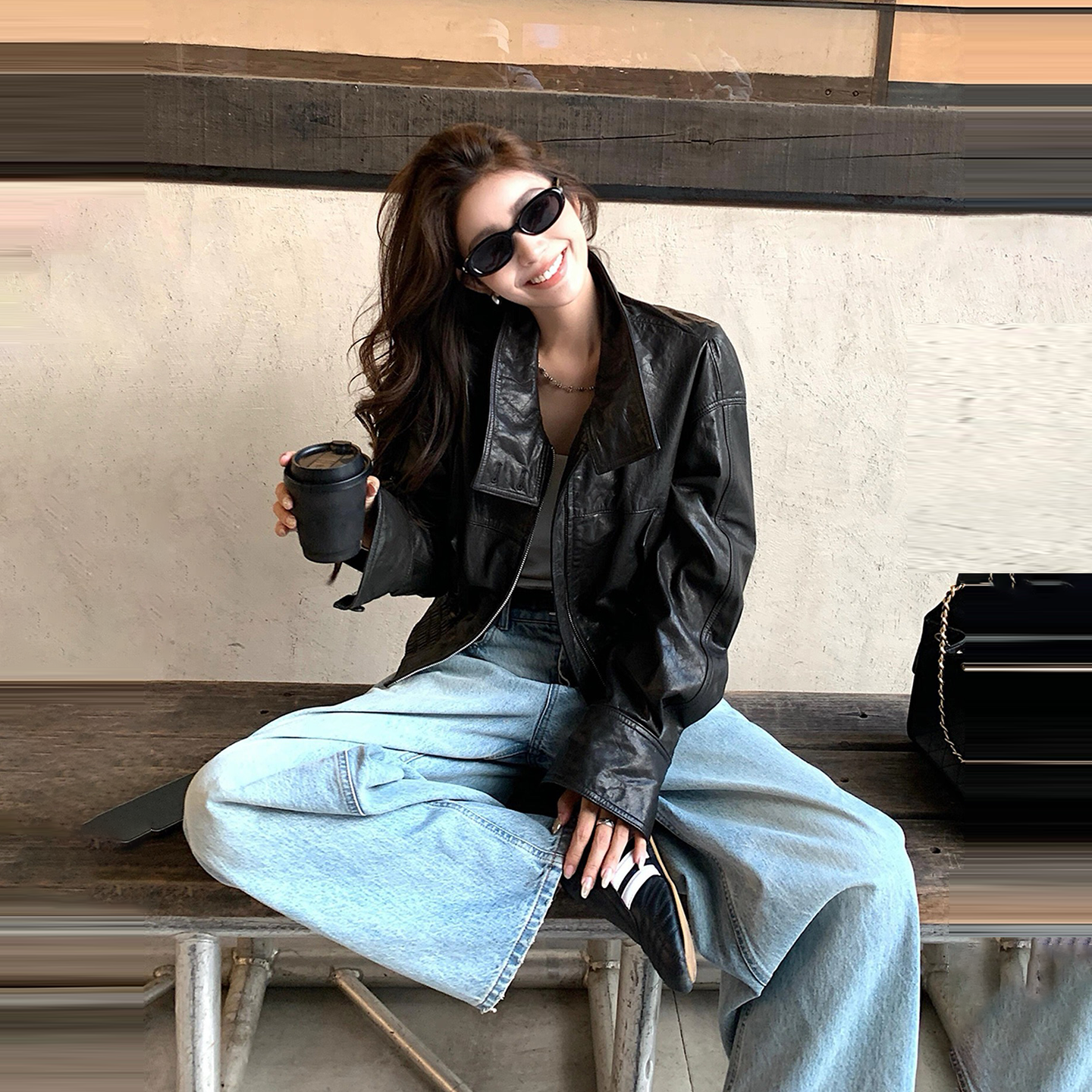 2025 black retro leather jacket women's autumn new leather jacket cool sassy style small motorcycle suit top