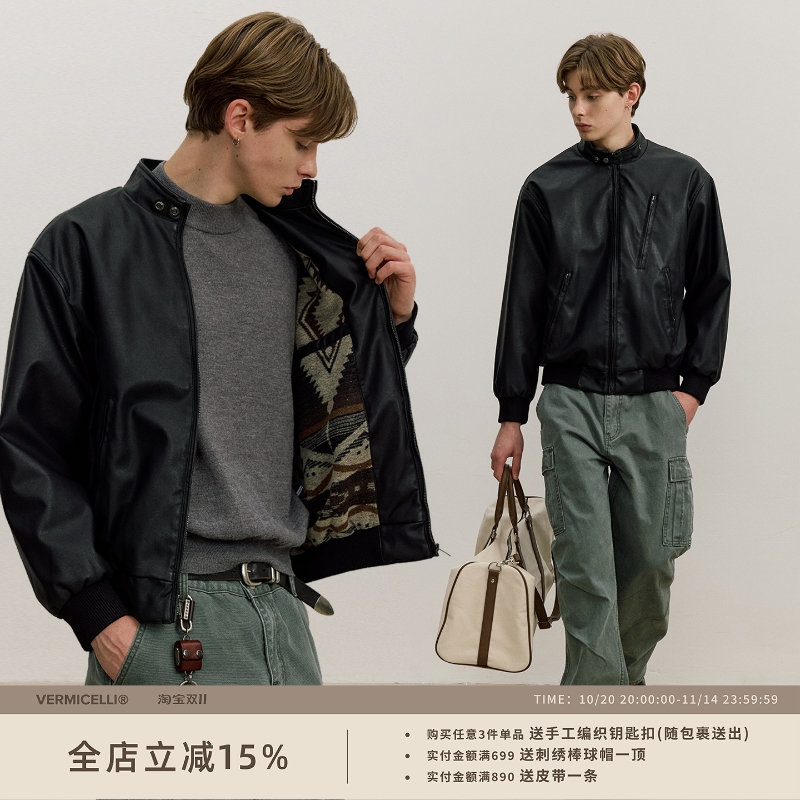 VMCL Vintage Stand Collar Venom Leather Jacket Wool Lined PU Leather Motorcycle Leather Jacket Men's 25AW vermicelli