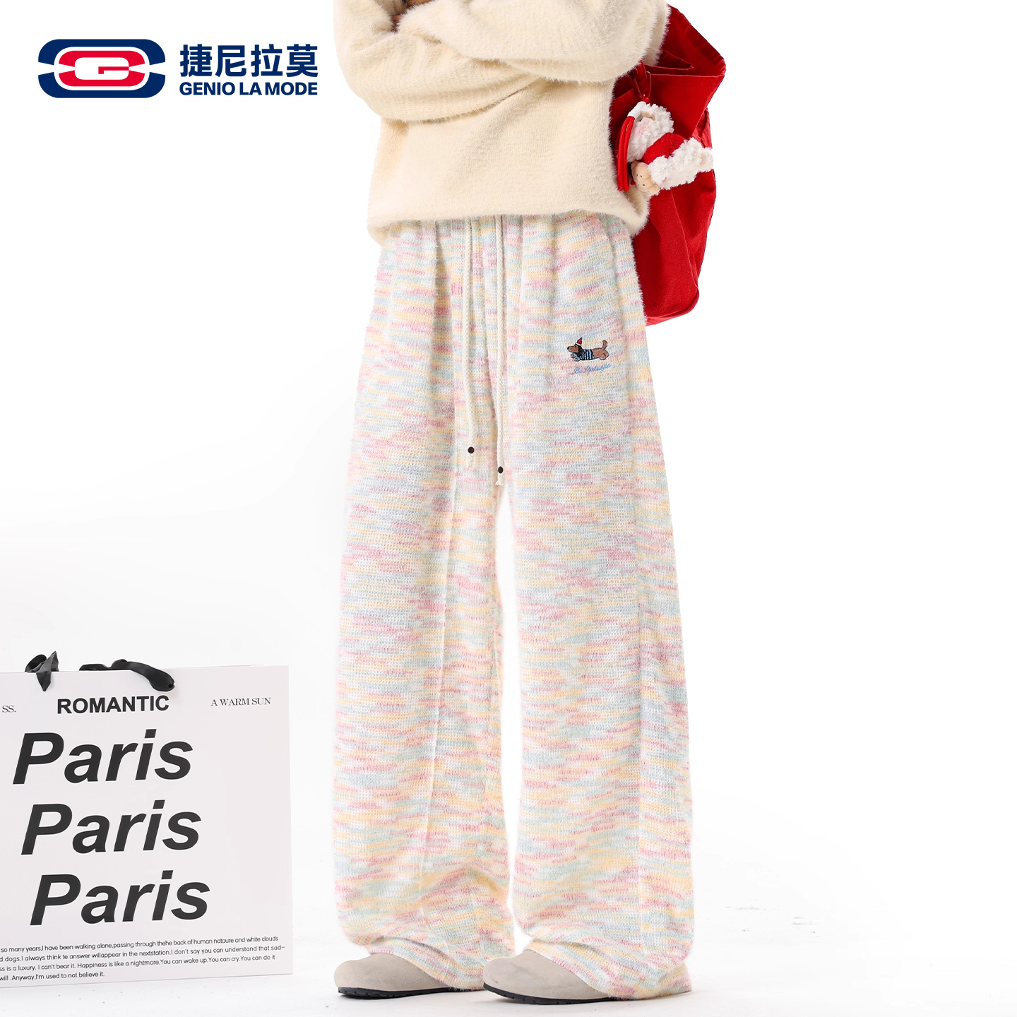 GENIOLAMODE embroidered rainbow dachshund casual pants for men and women with fleece in autumn and winter