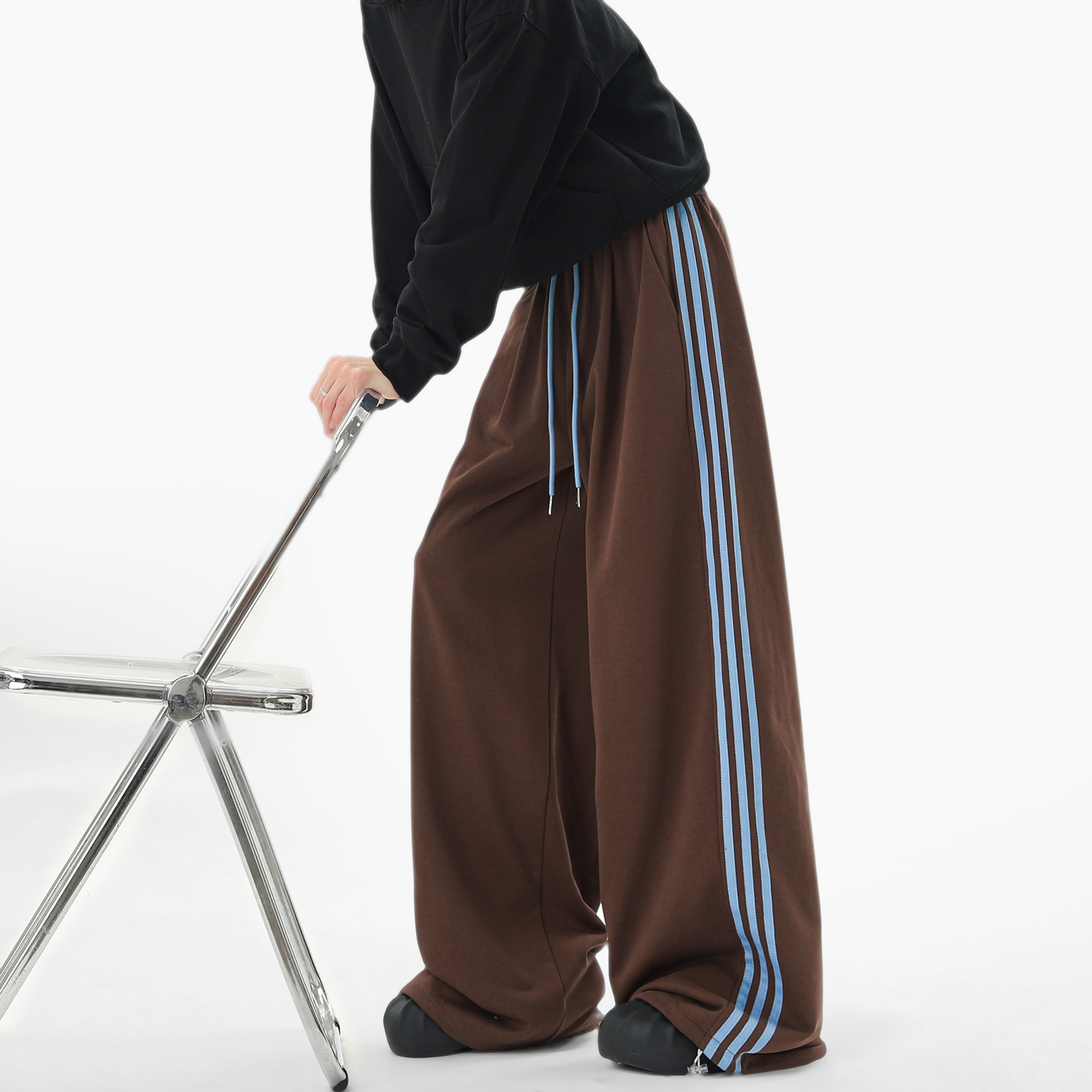 American retro three-bar stripe contrasting wide-leg scimitar pants women's fleece autumn and winter loose design sports sweatpants
