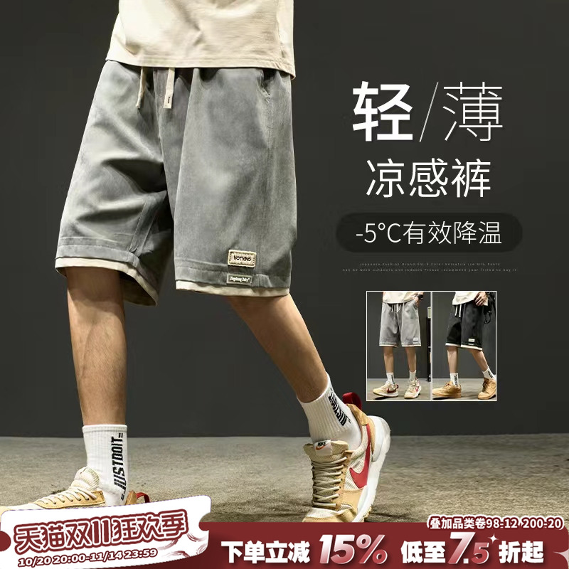 Ice silk shorts, men's summer thin quick-drying loose sports shorts, American trendy brand fake two new cropped pants