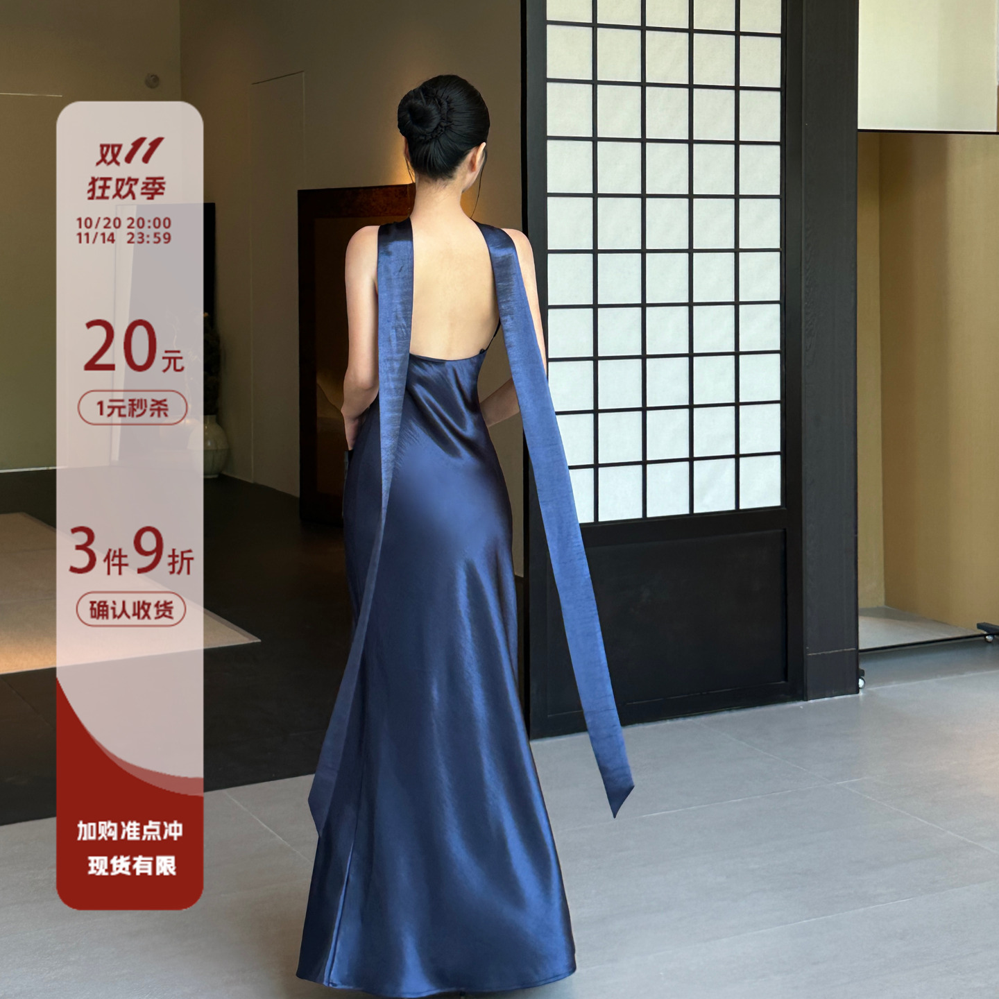 VENUIE French temperament party slip light dress dress female niche birthday evening dress halterneck long skirt