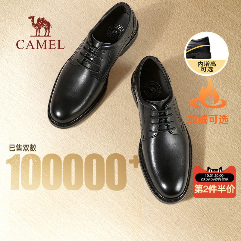 Camel 2025 winter fleece business leather shoes men's wedding groom leather heightened soft sole father shoes derby shoes