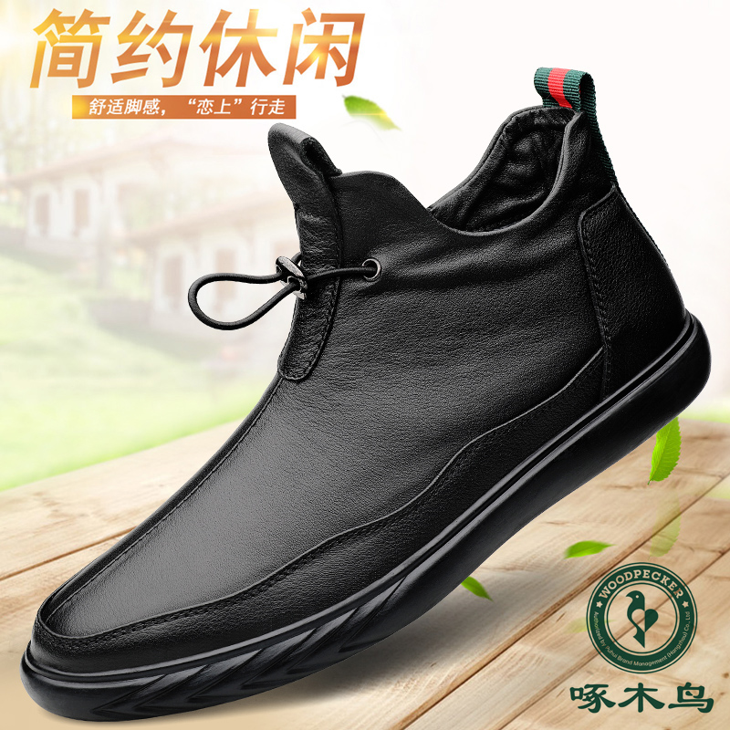 Woodpecker men's shoes, winter business leather high-top leather shoes, men's wool fleece warm short leather boots, dad cotton shoes