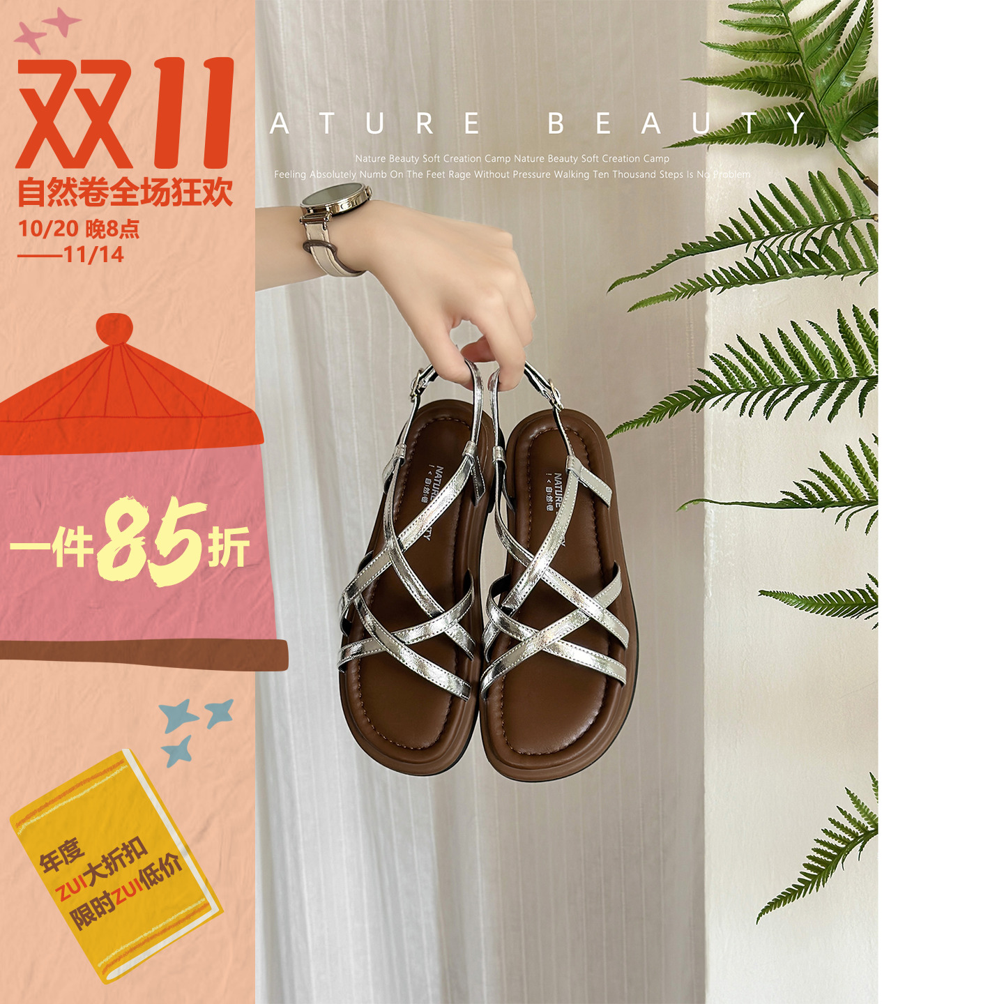 Natural roll flat casual strappy temperament Roman sandals 2025 summer new open-toe vacation fairy beach shoes