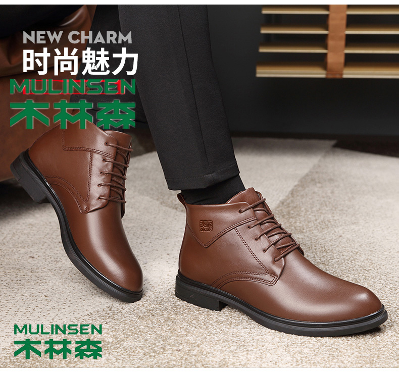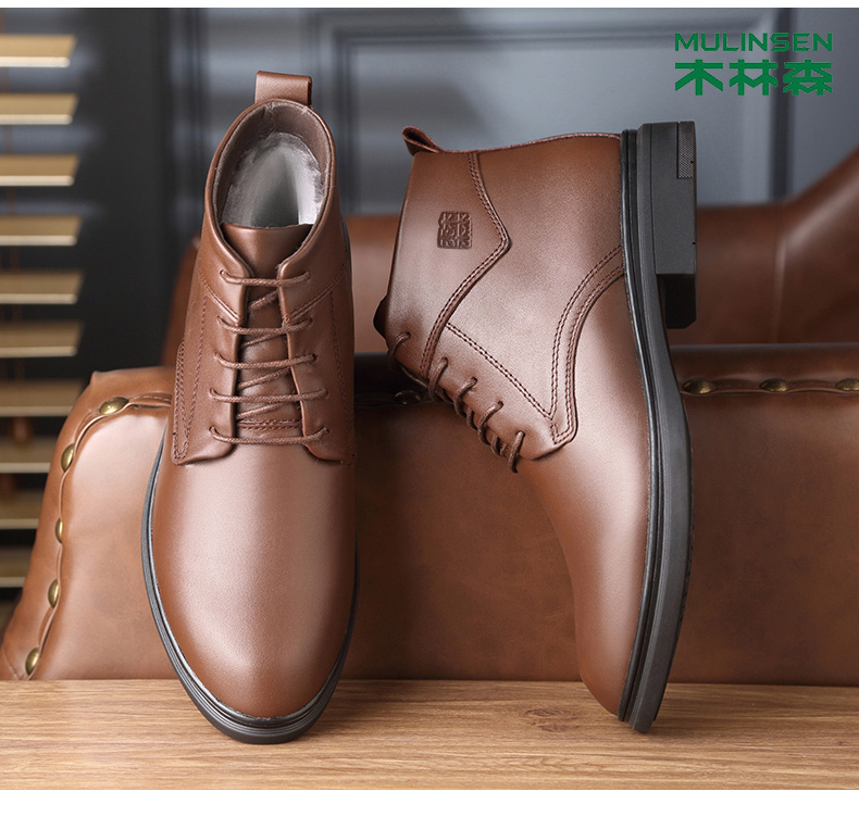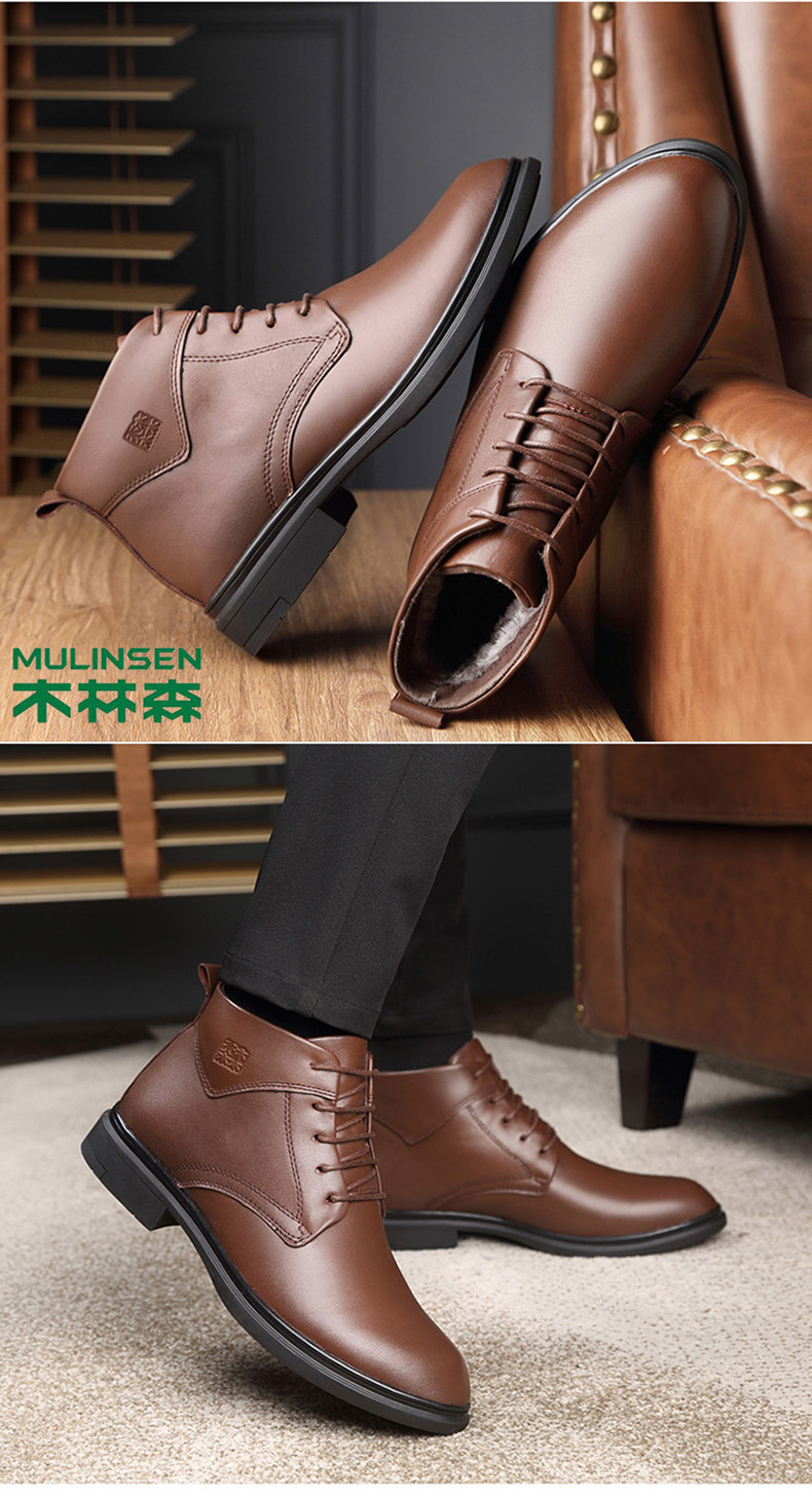 Mulinsen Men's Shoes Winter Warm Fleece-Lined Cotton Shoes Business Casual High-Top Leather Shoes Men's Genuine Leather Short Boots Martin Boots