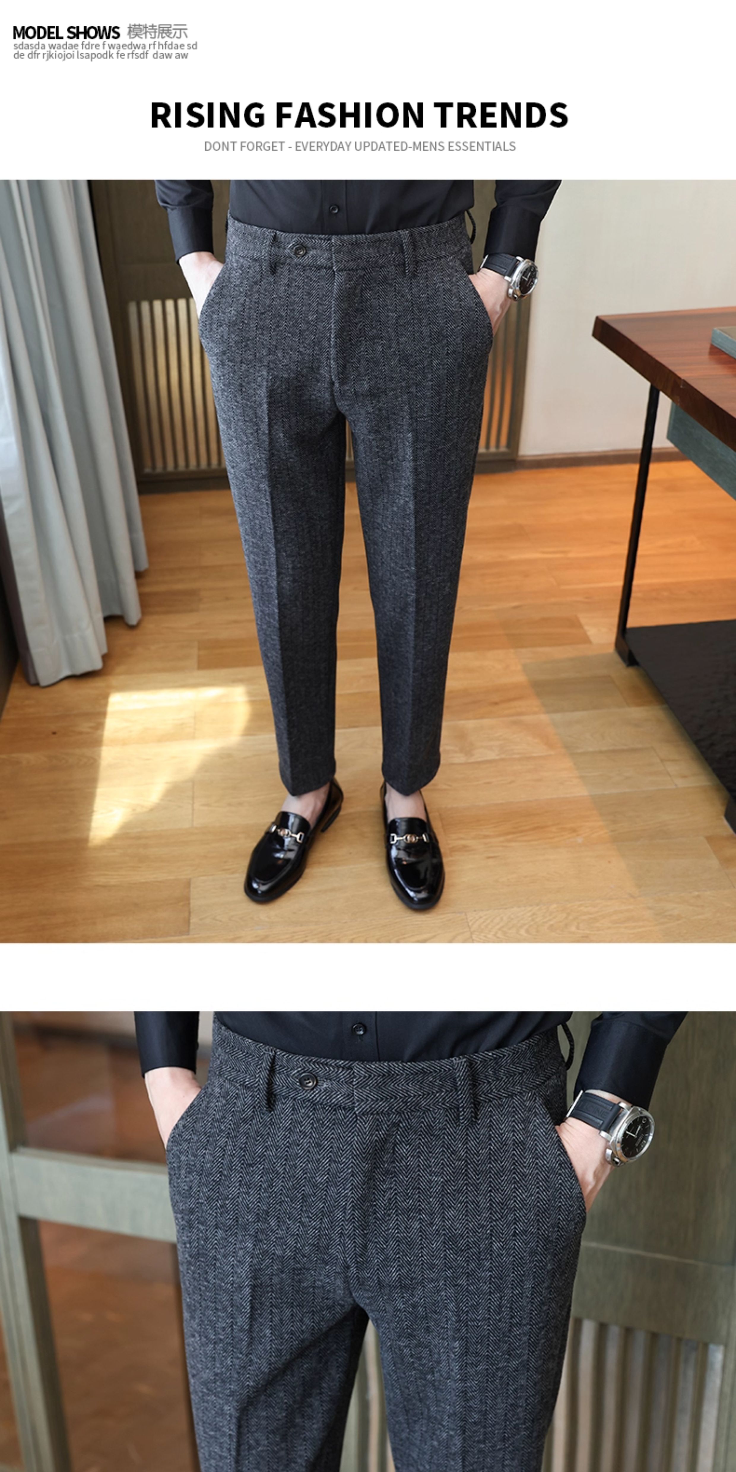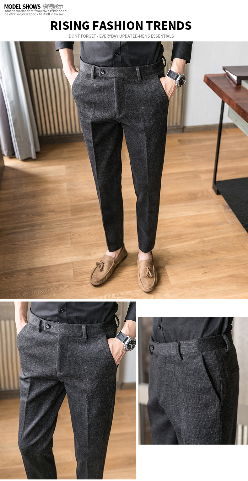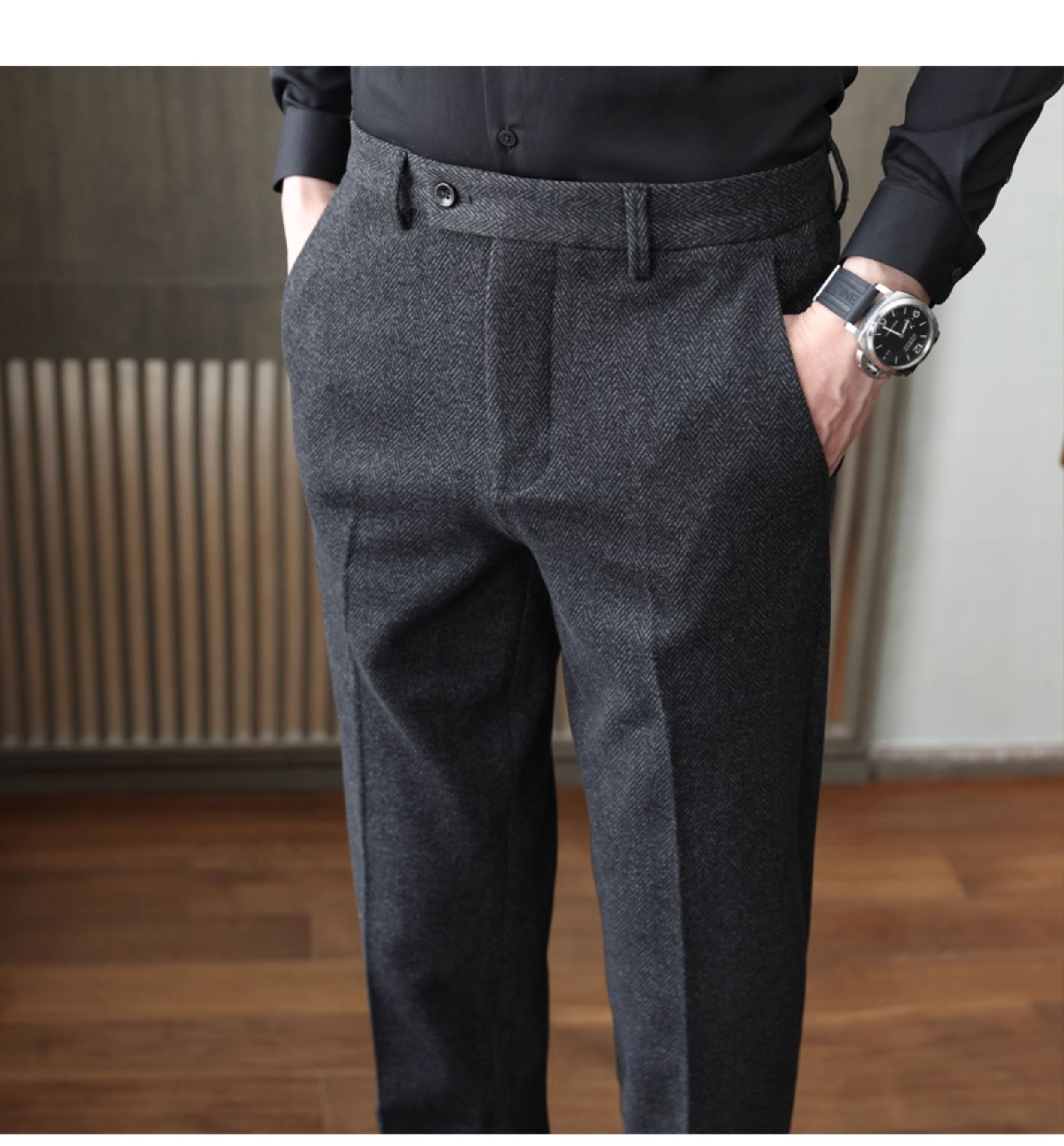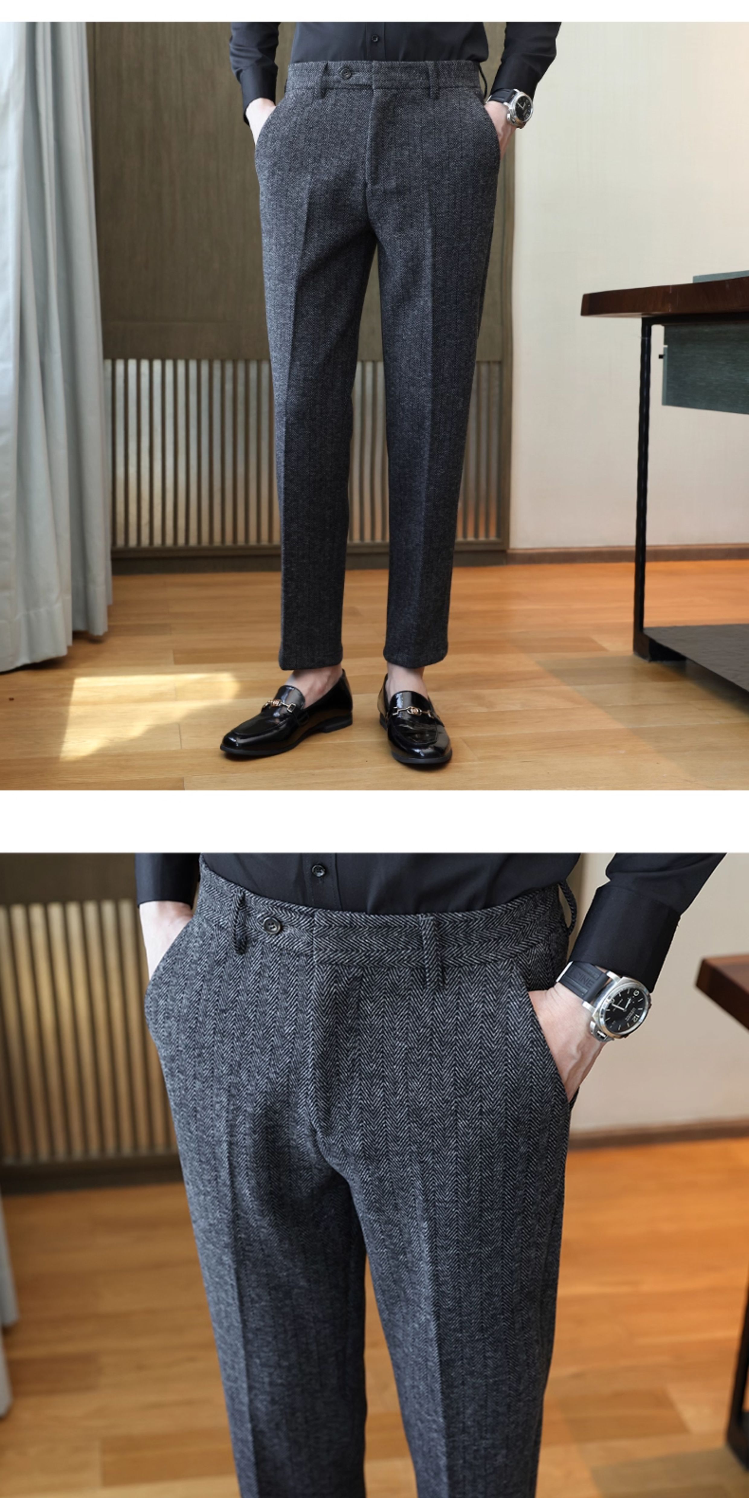 Autumn and Winter Woolen Material Trousers for Men, Winter Herringbone Pattern Woolen Men's Casual Pants, Brushed Business Suit Trousers for Men