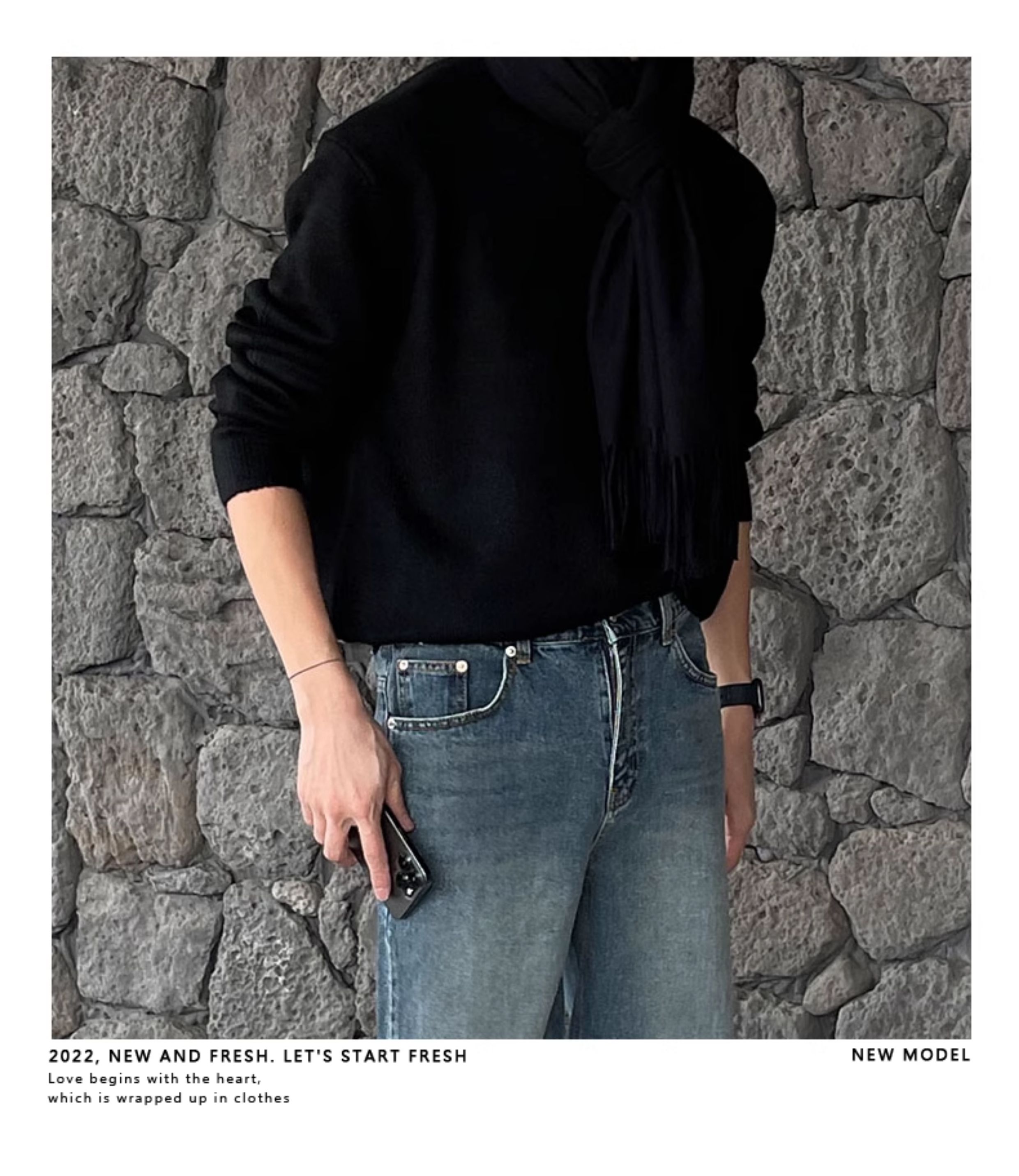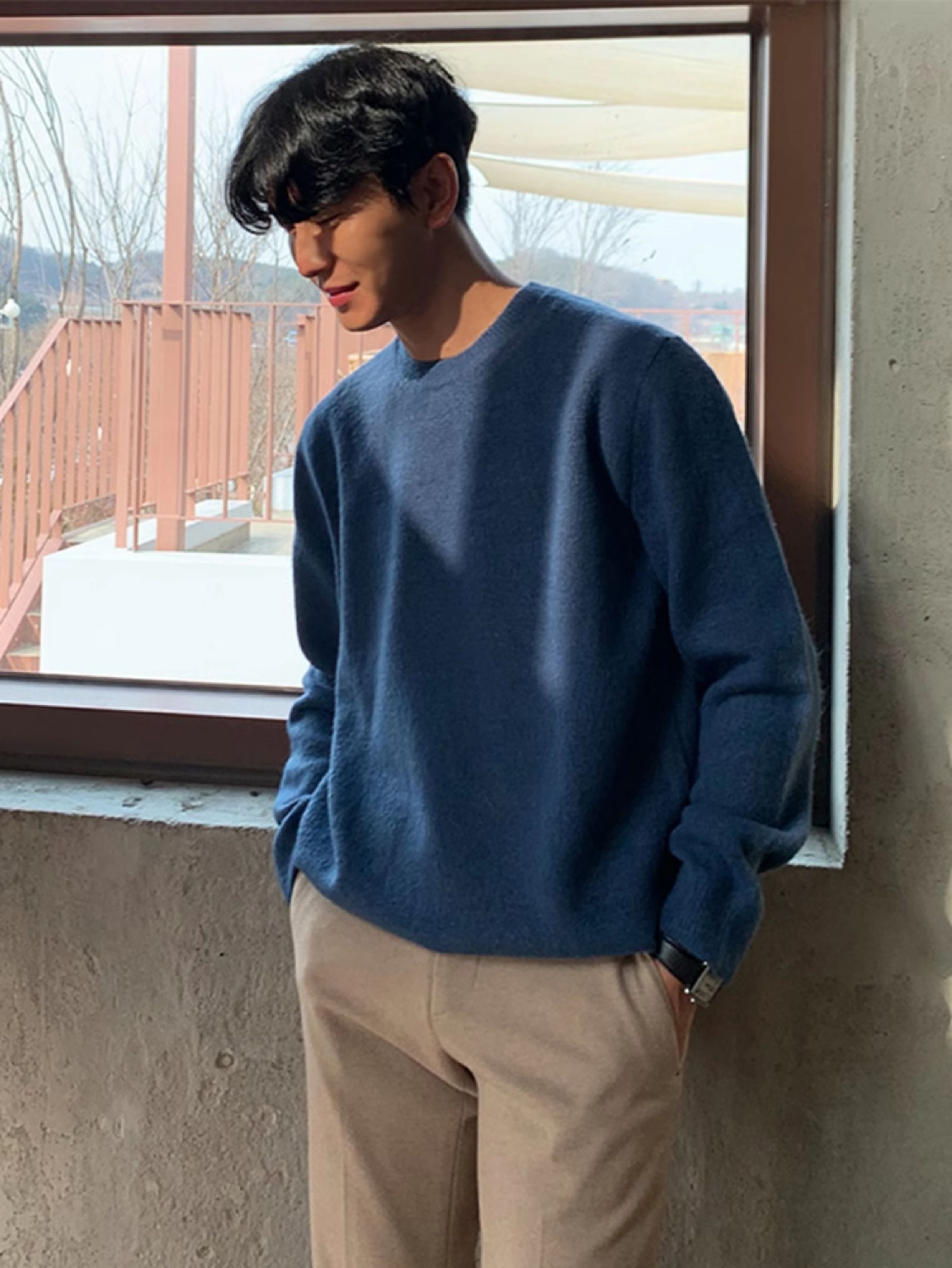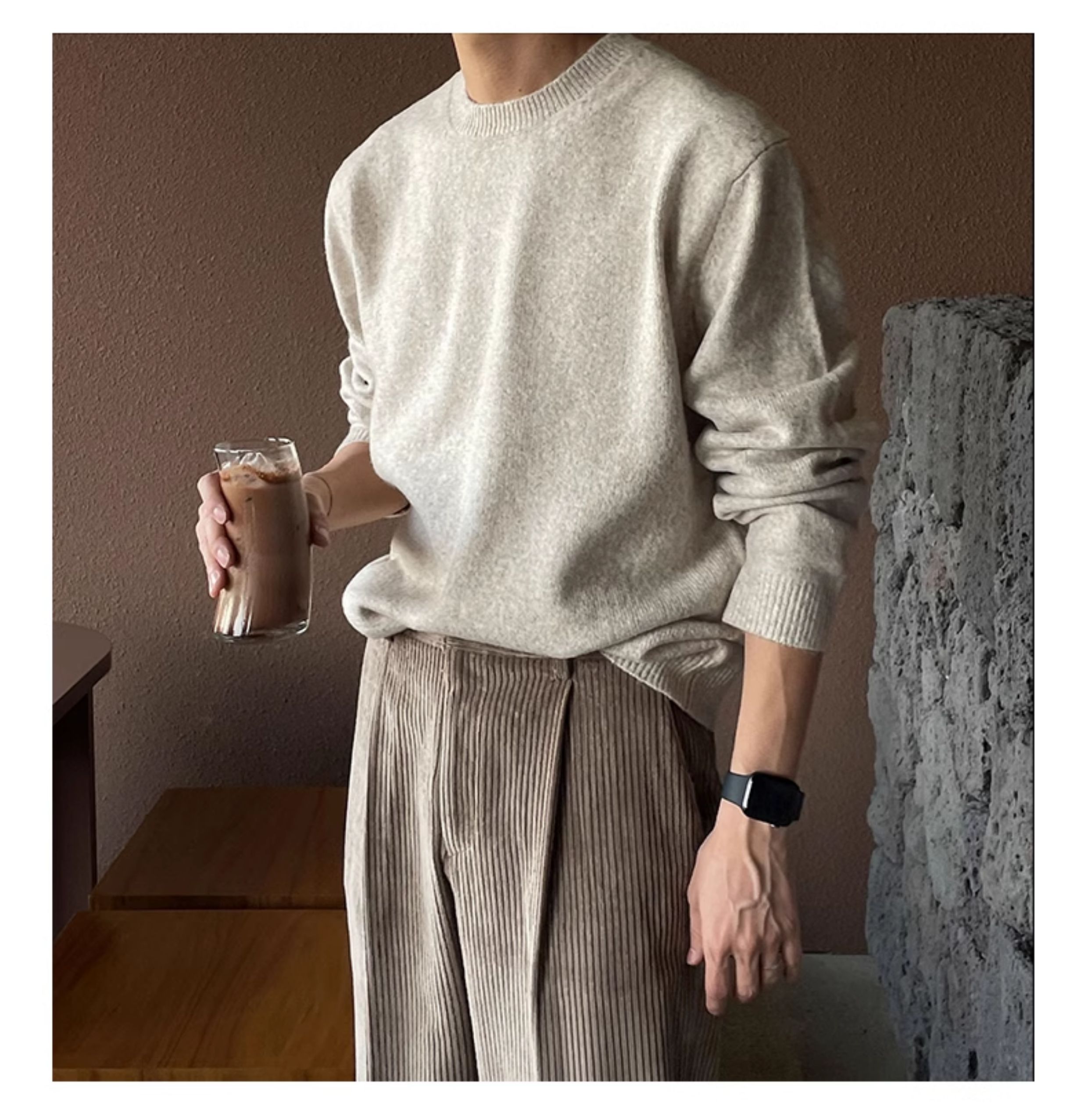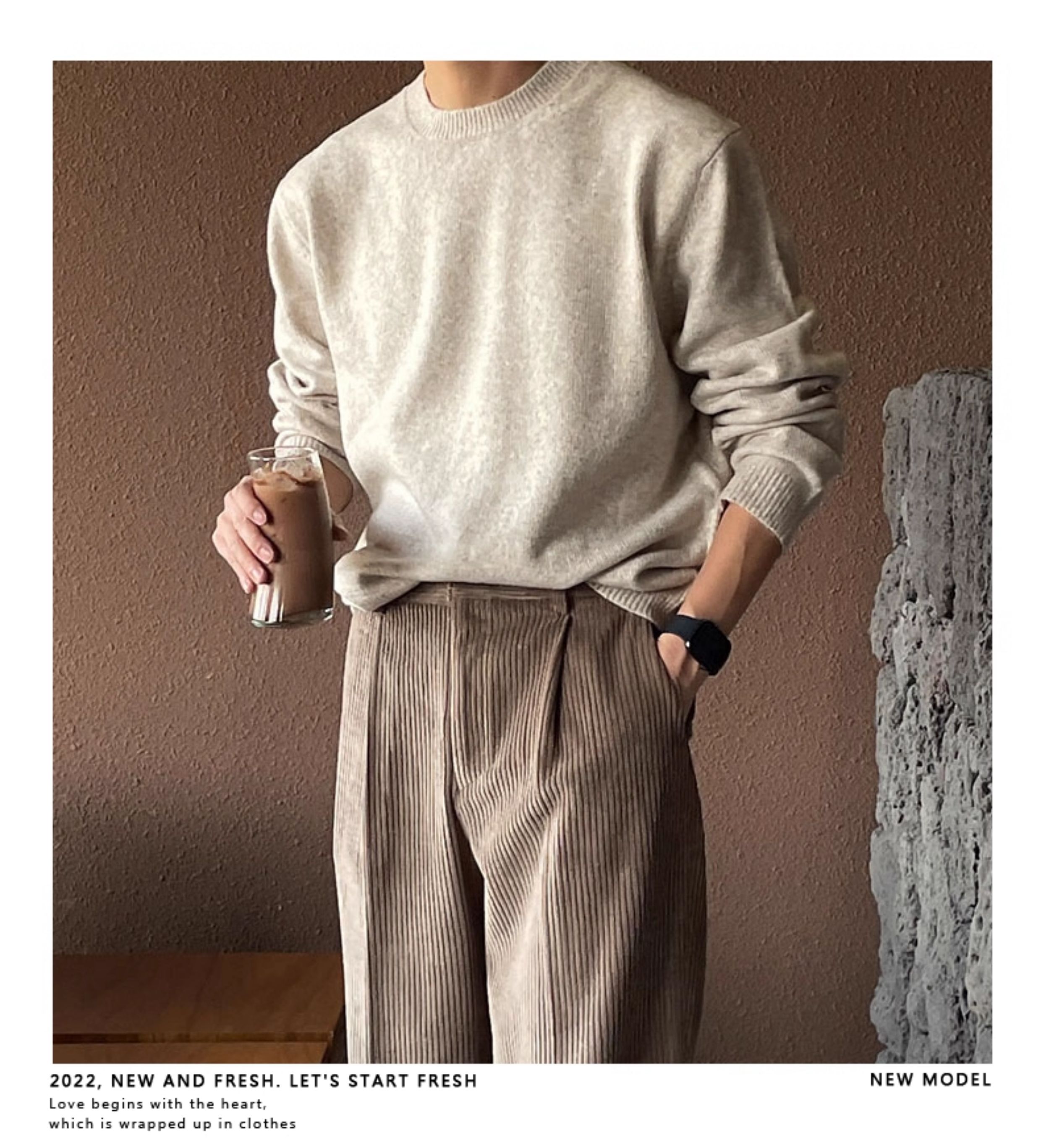 Khaki Sweater for Men, Spring and Autumn, Round Neck, Knitted Long-Sleeve Base Shirt, Vintage, Loose, Casual, Thickened Top