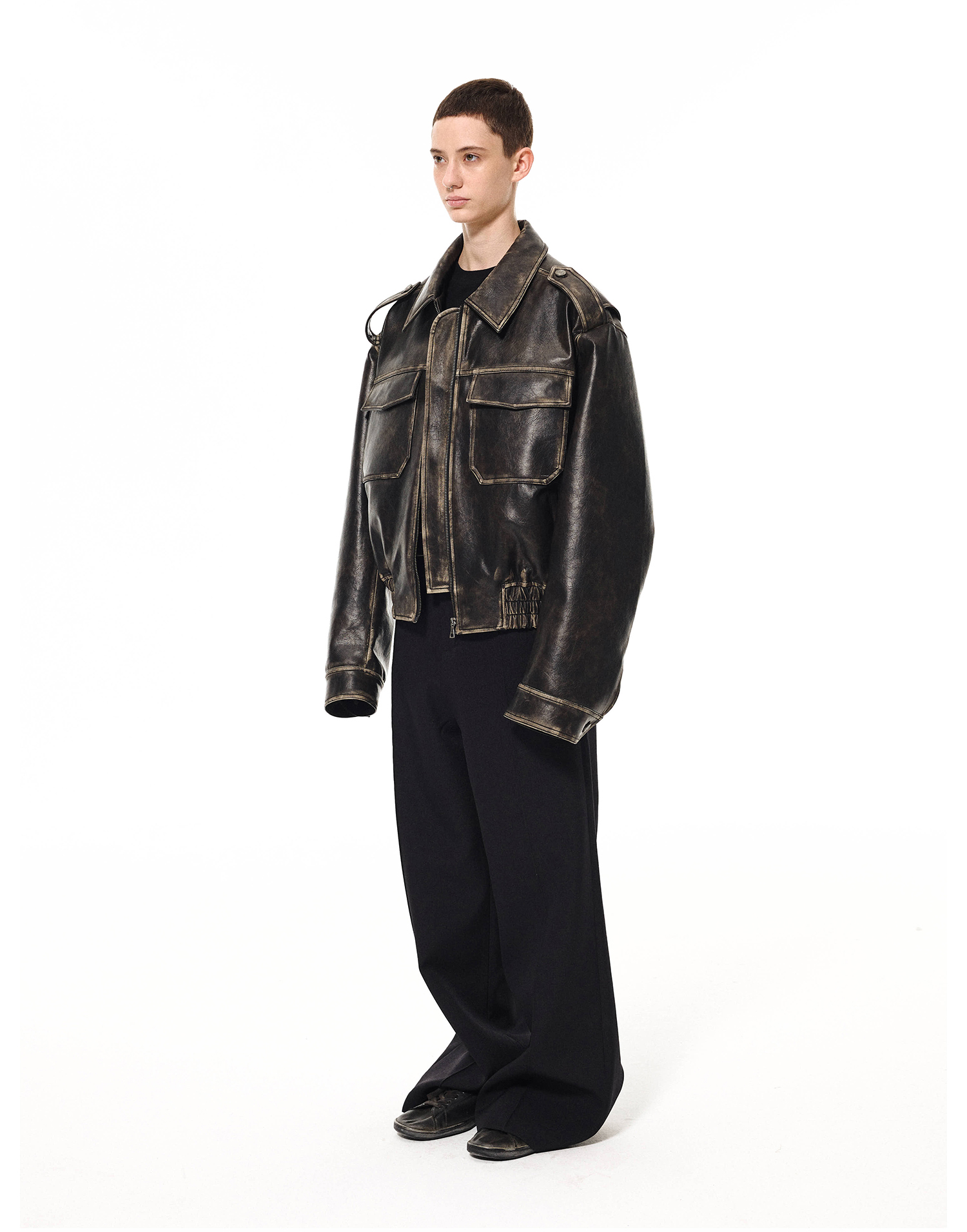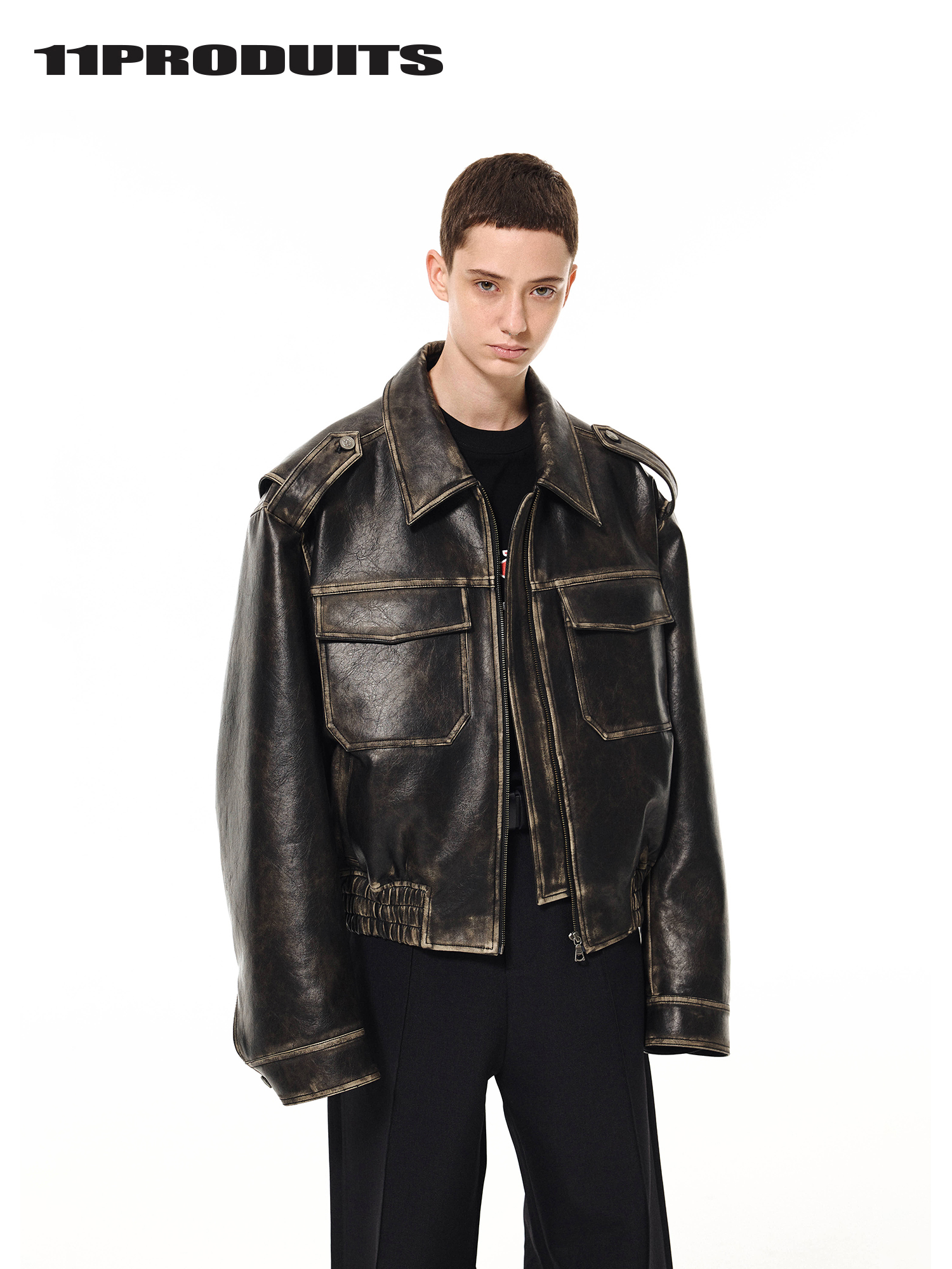 11Produits Heavy-Duty Eco-Friendly Leather Silhouette Distressed Color-Washed Elastic Hem Padded Leather Jacket