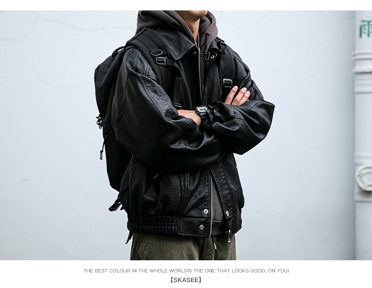 American Retro Lychee Pattern Biker Short Leather Jacket for Men, Autumn and Winter Loose Fit Black Lapel Leather Jacket Trendy