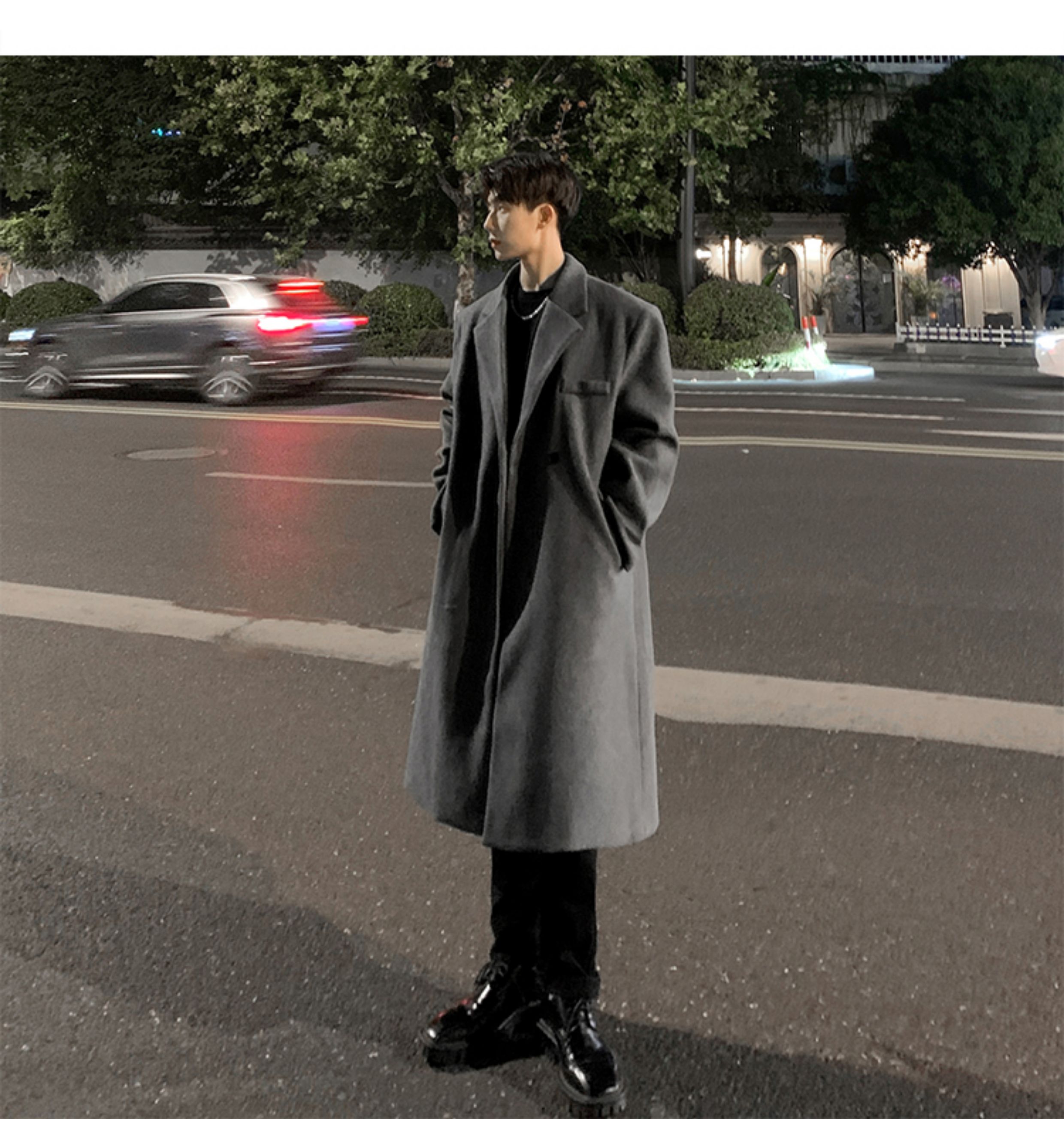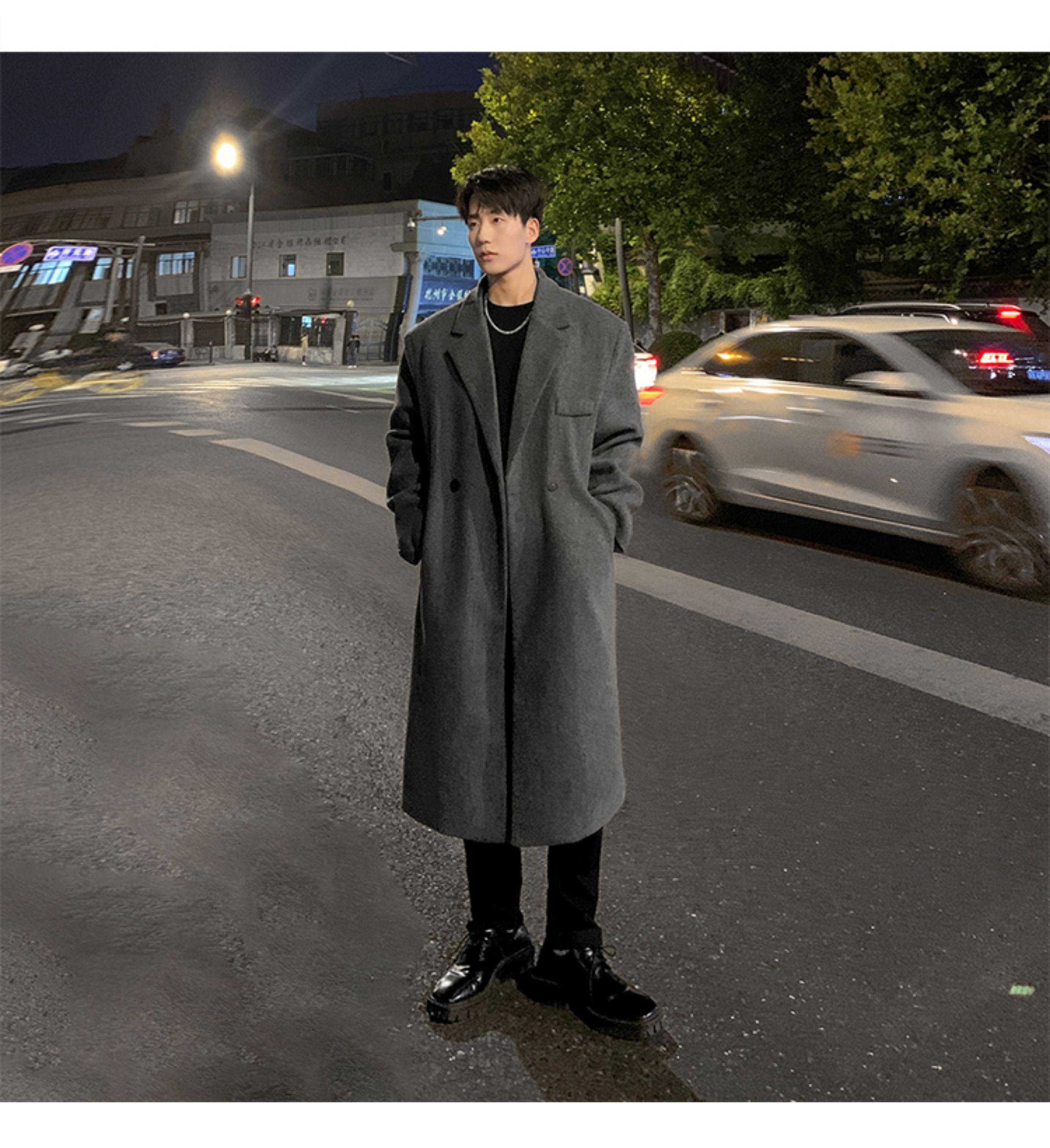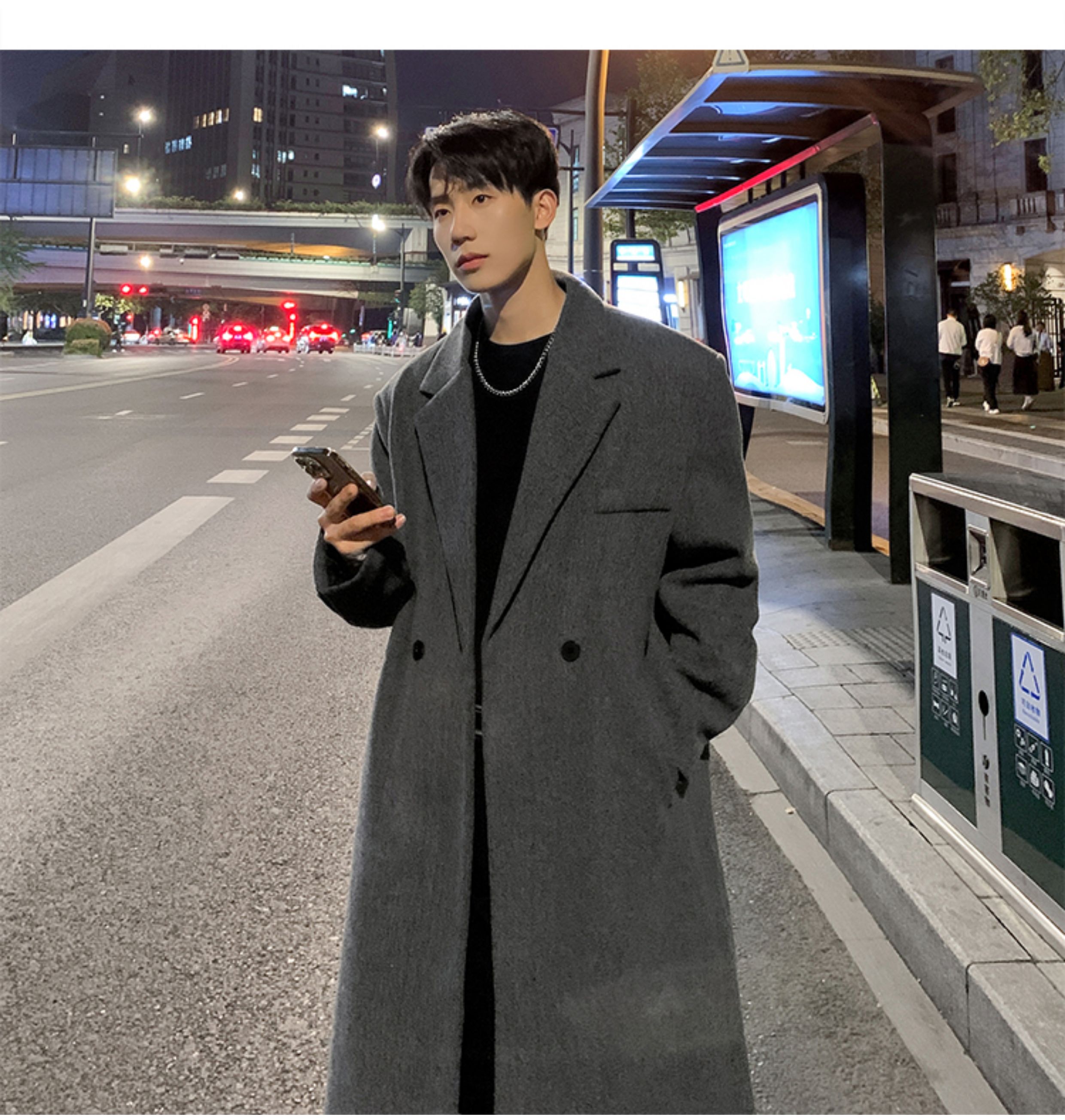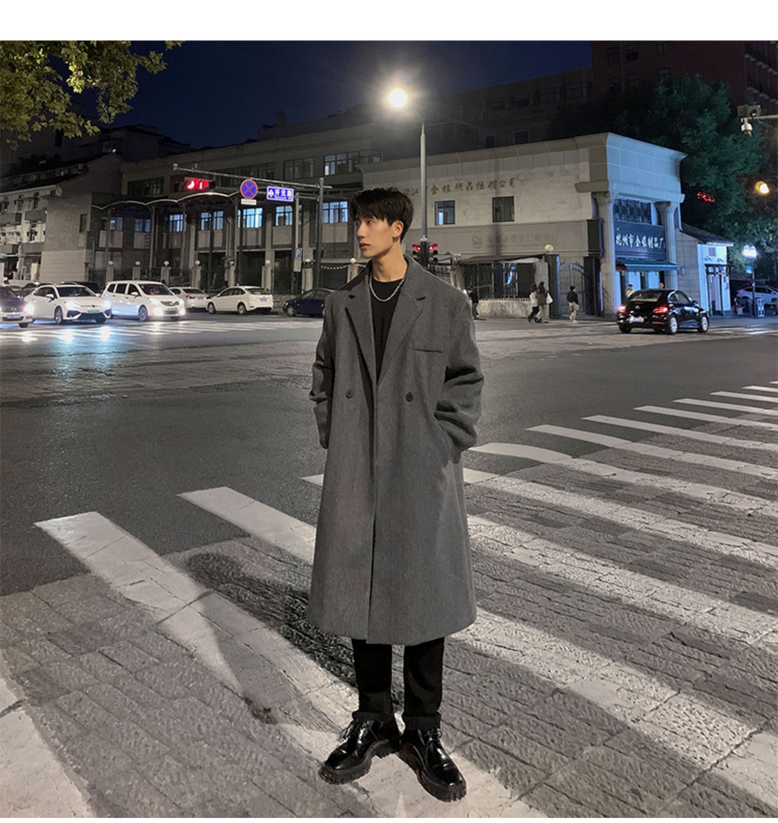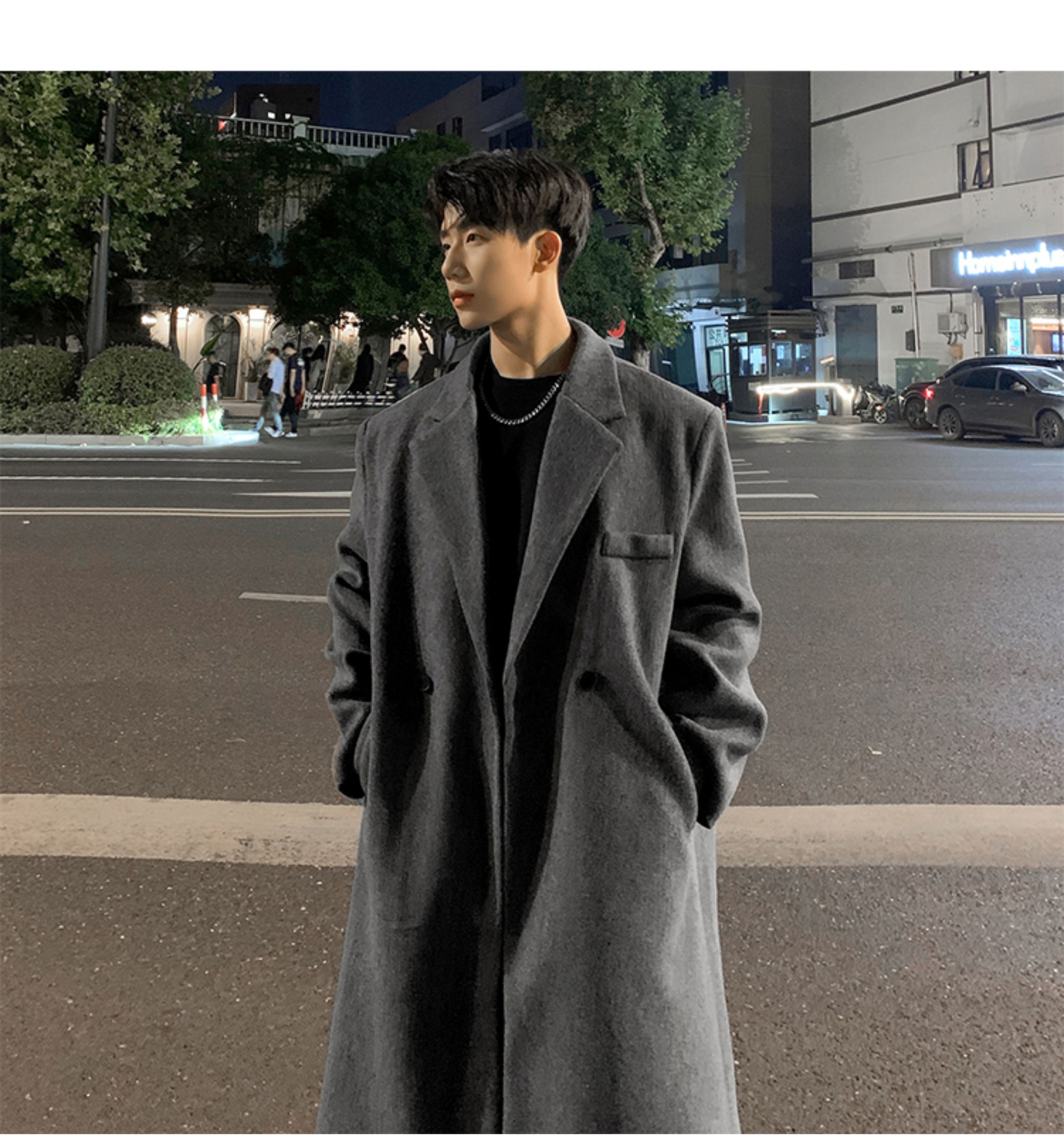 Woolen Coat for Men, Gray, Autumn and Winter, Mid-Length, Thickened, Loose, Over-The-Knee Trench Coat, Korean Style Woolen Suit Jacket