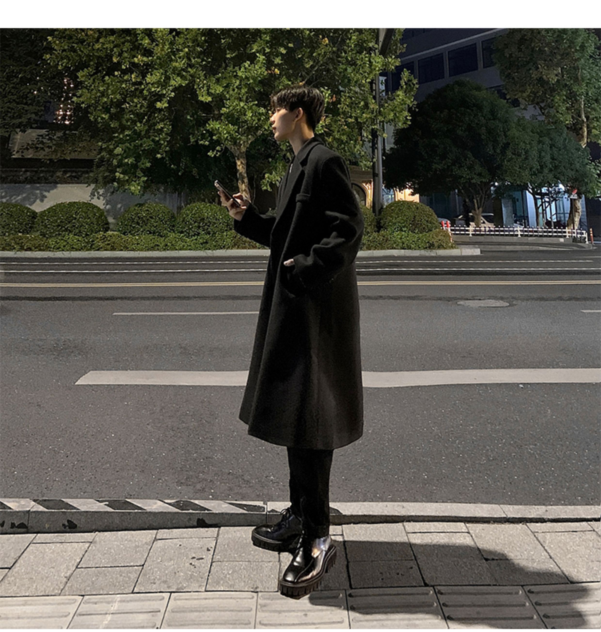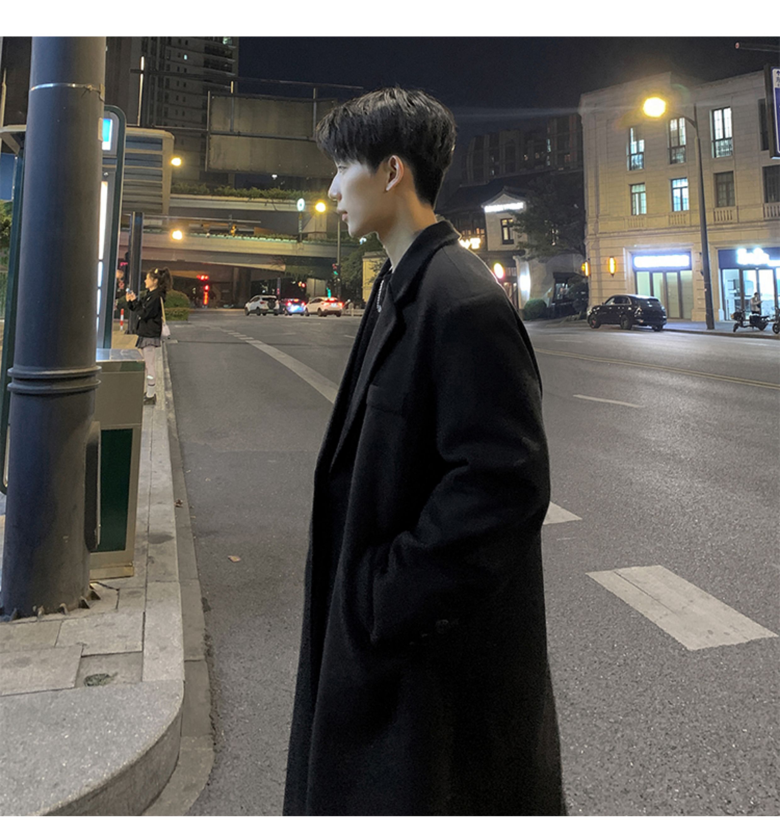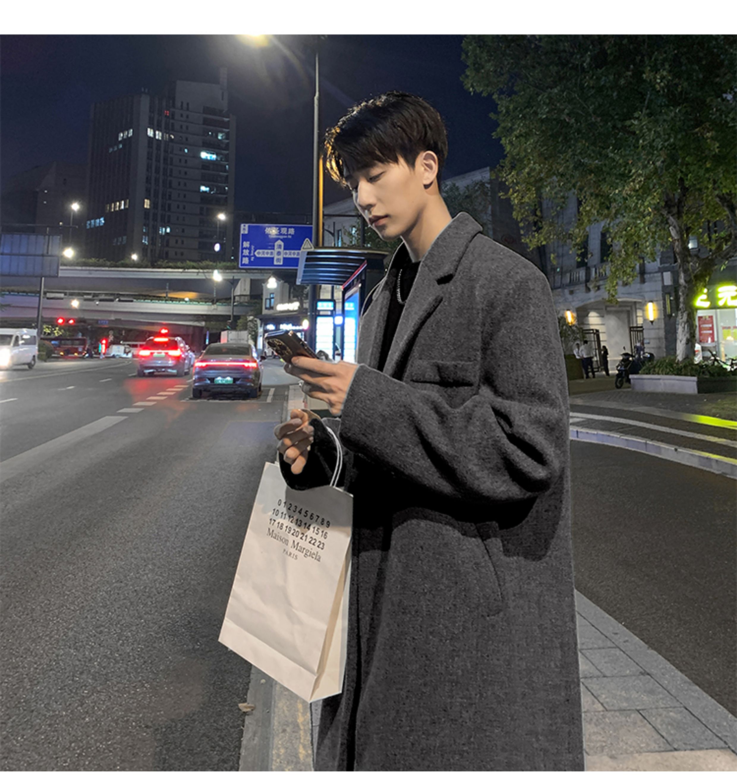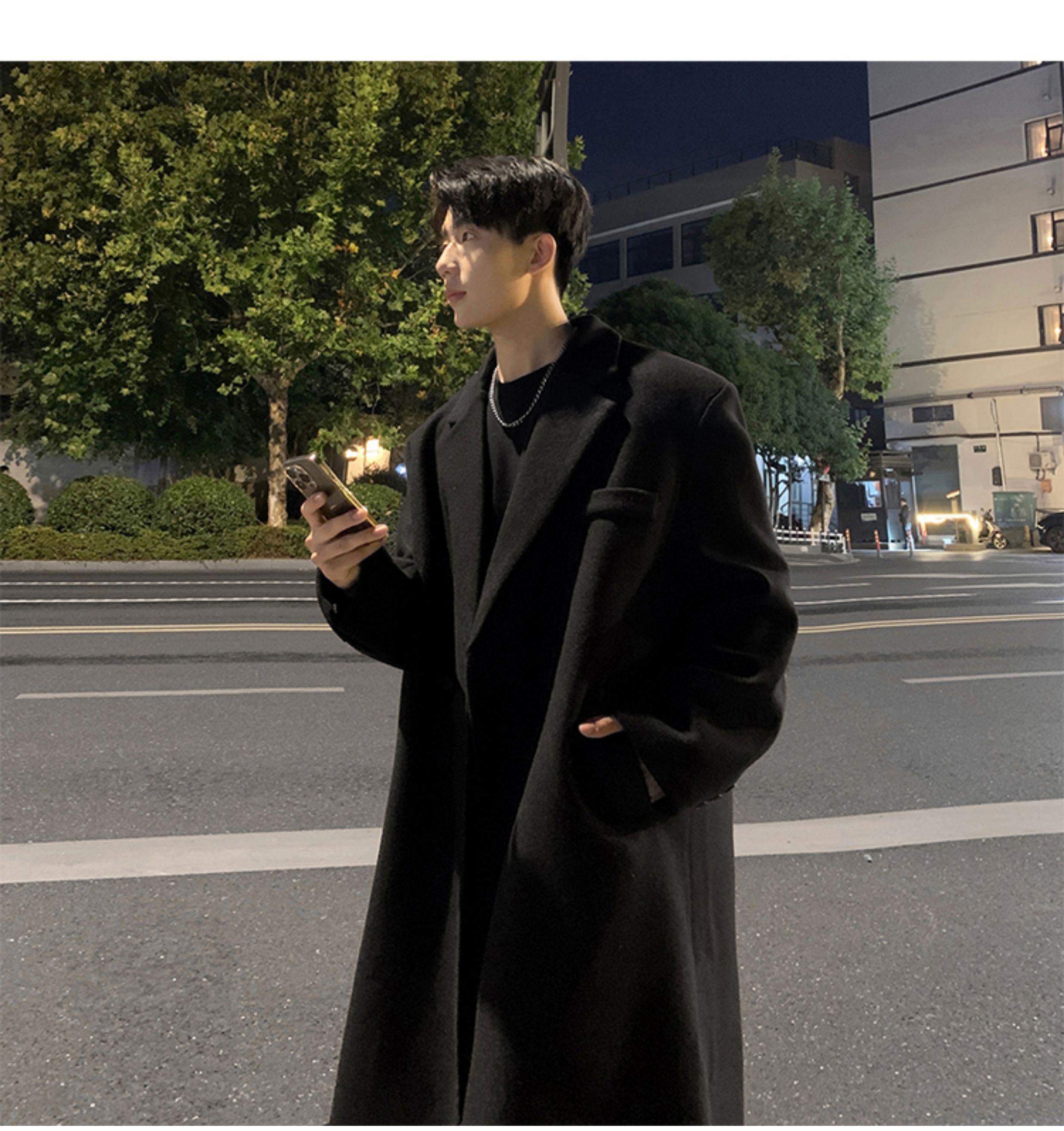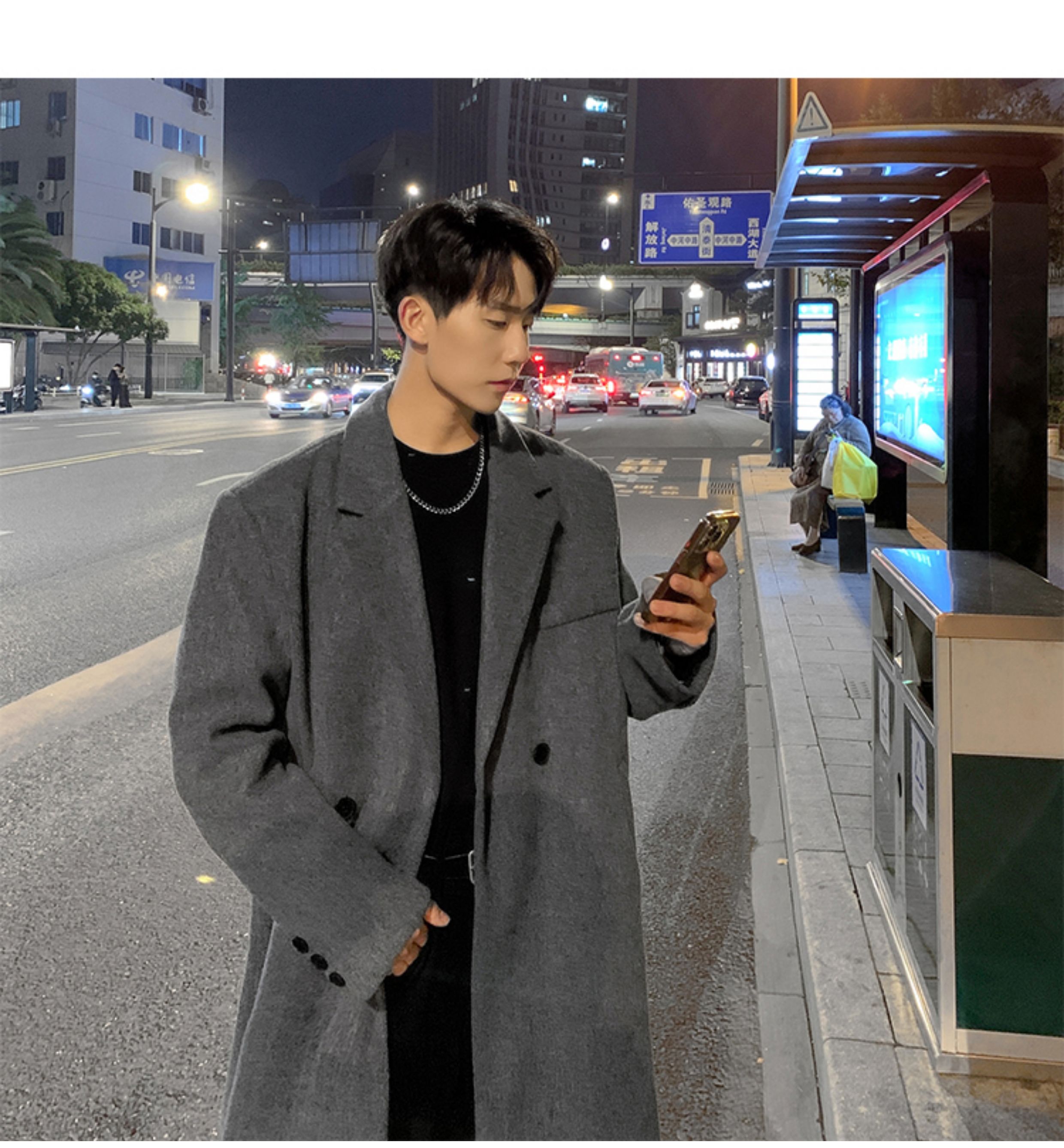 Woolen Coat for Men, Gray, Autumn and Winter, Mid-Length, Thickened, Loose, Over-The-Knee Trench Coat, Korean Style Woolen Suit Jacket