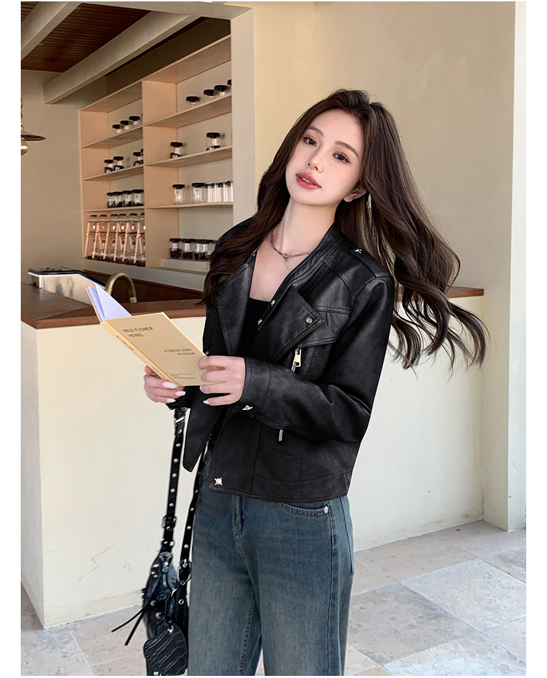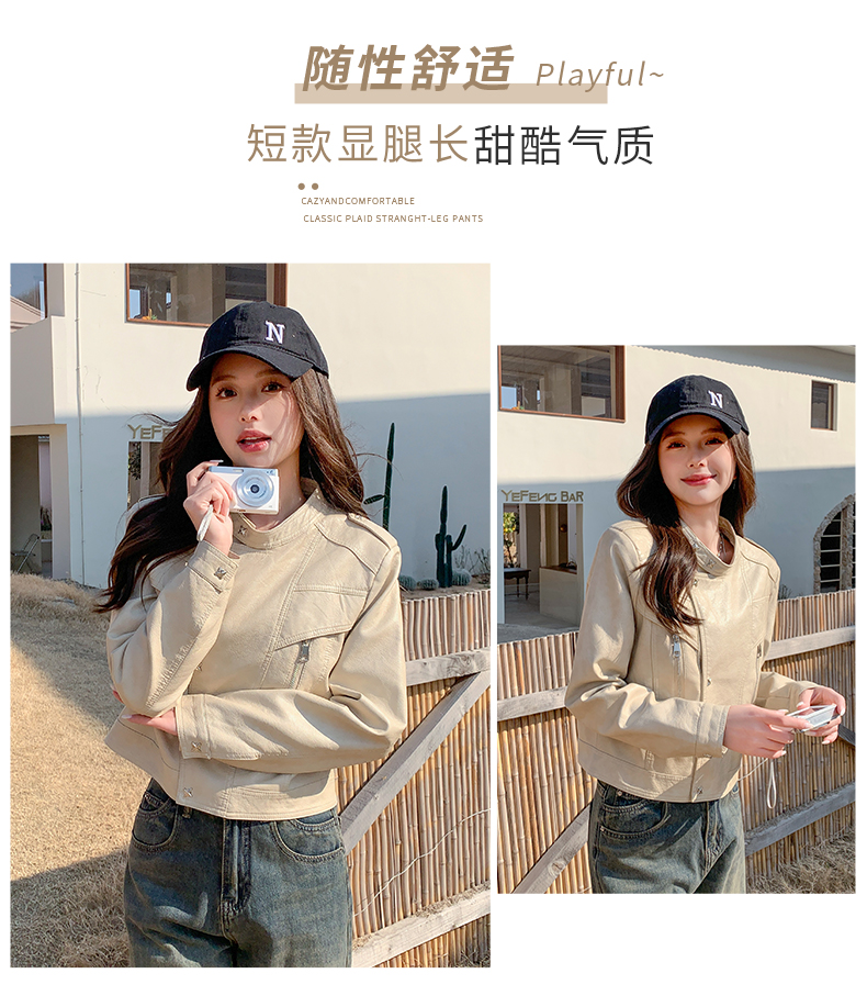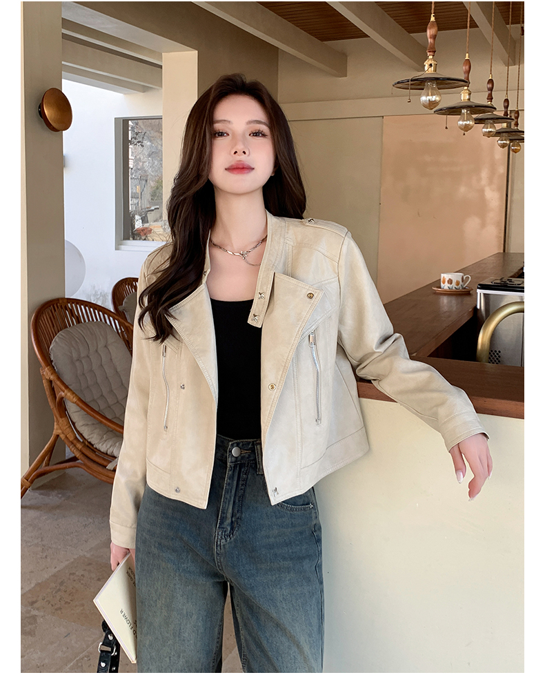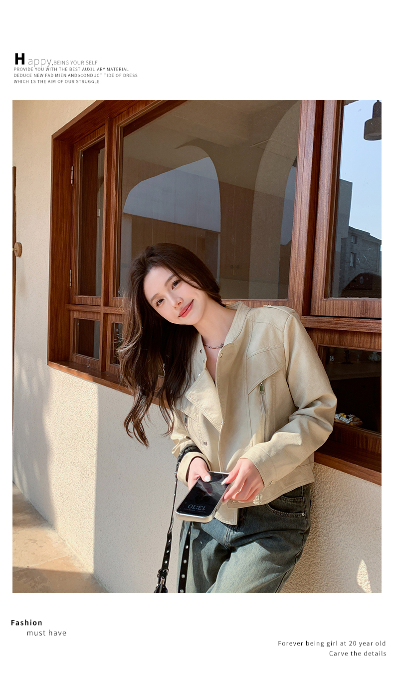 Beige Sweet and Cool Stylish Short Biker Leather Jacket for Women, 2025 Autumn New Style, Petite Stand Collar Jacket