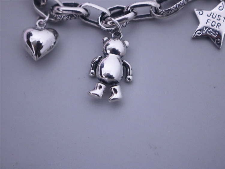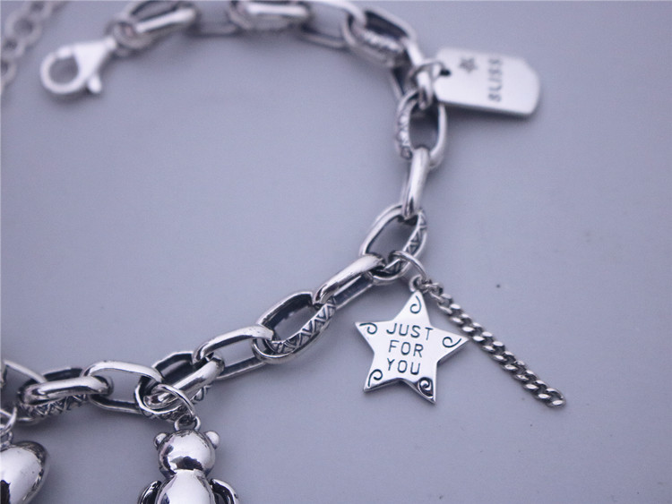 S925 Sterling Silver Korean Style Hip-Hop Bear Five-Pointed Star Heart English Square Plate Vintage Chunky Patchwork Bracelet Thai Silver for Women
