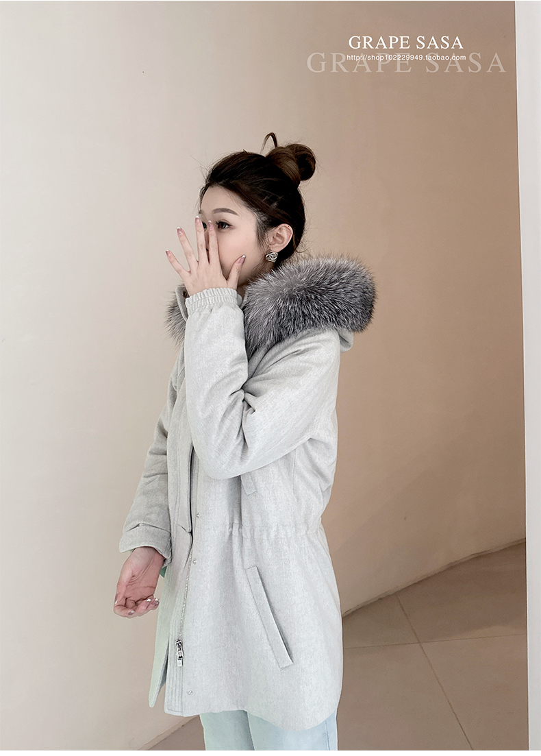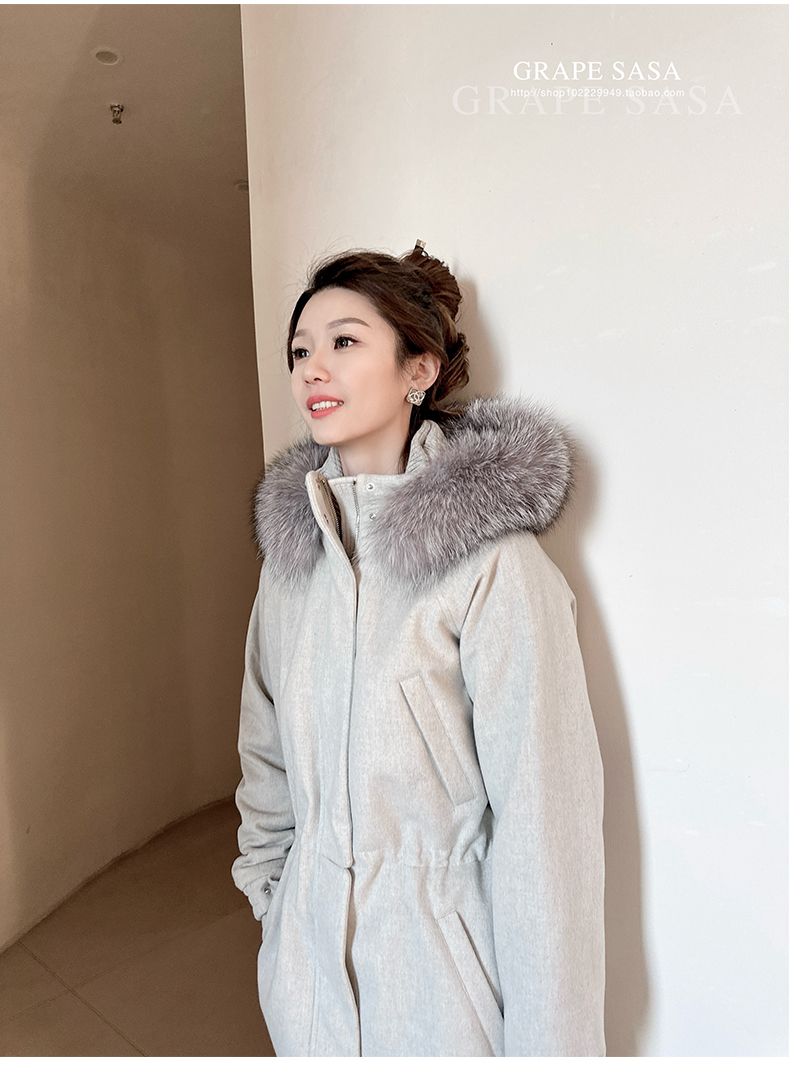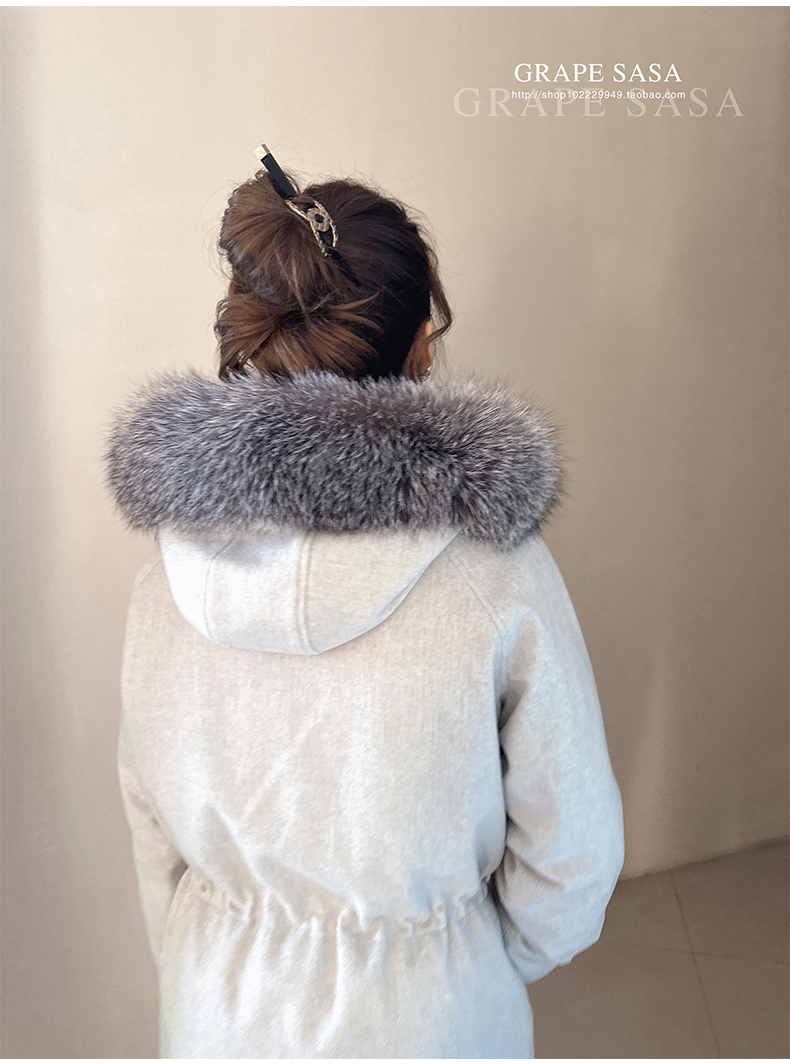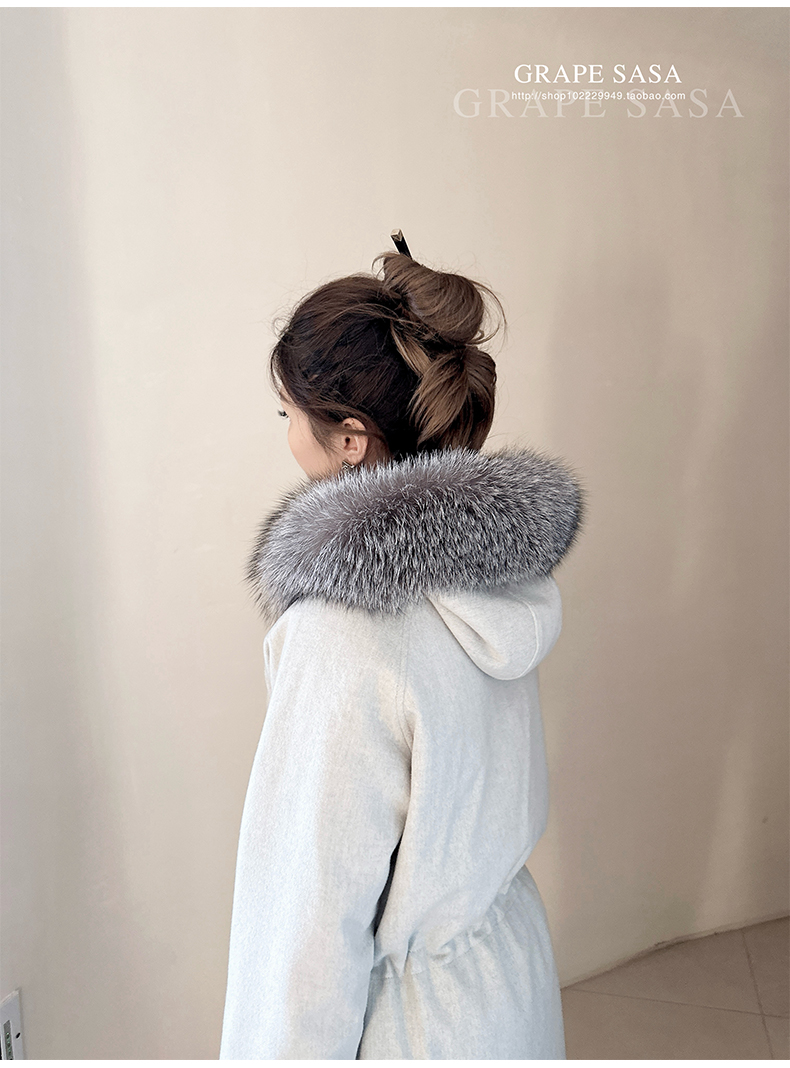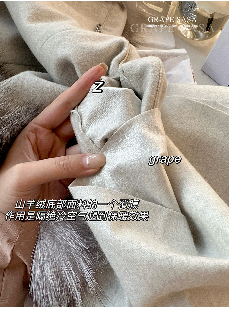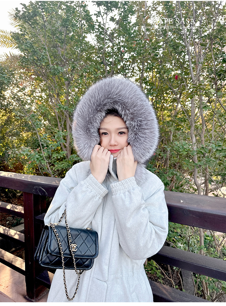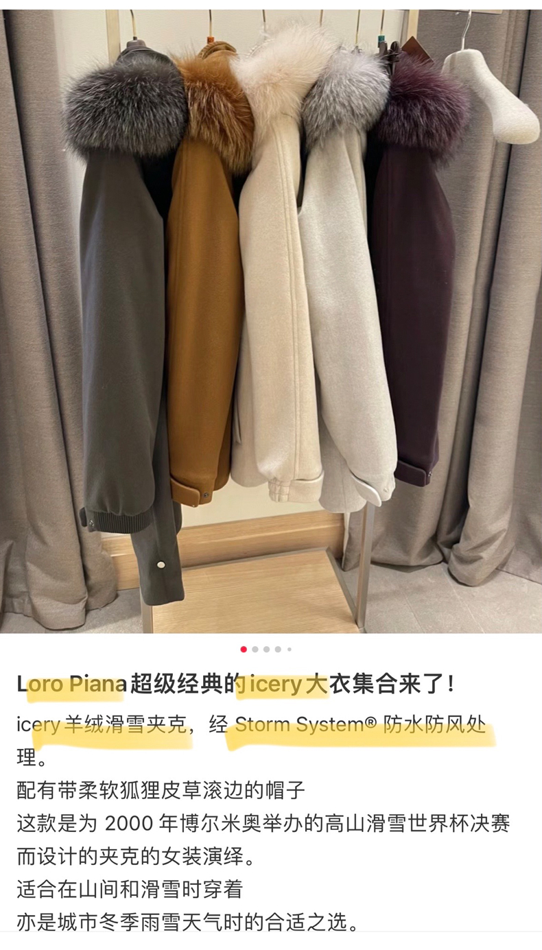 Lp的Icery面料是100%山羊绒(也很耗料)领口针织也是100%山羊绒、帽子又是银蓝狐狸毛。