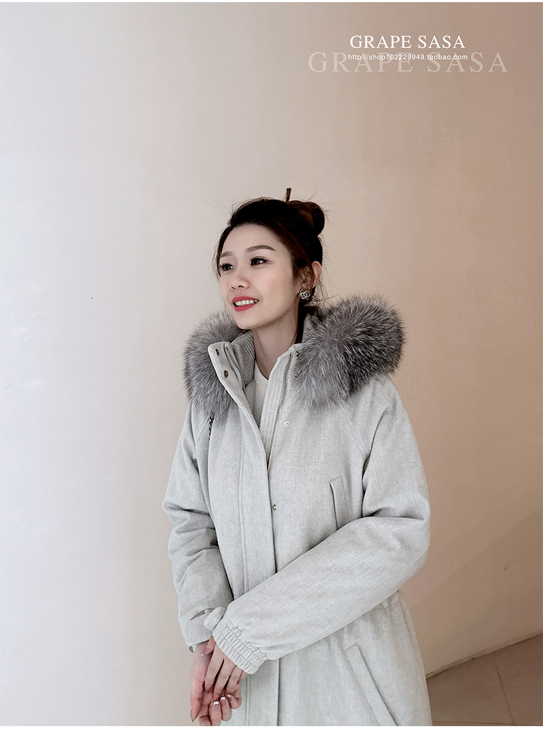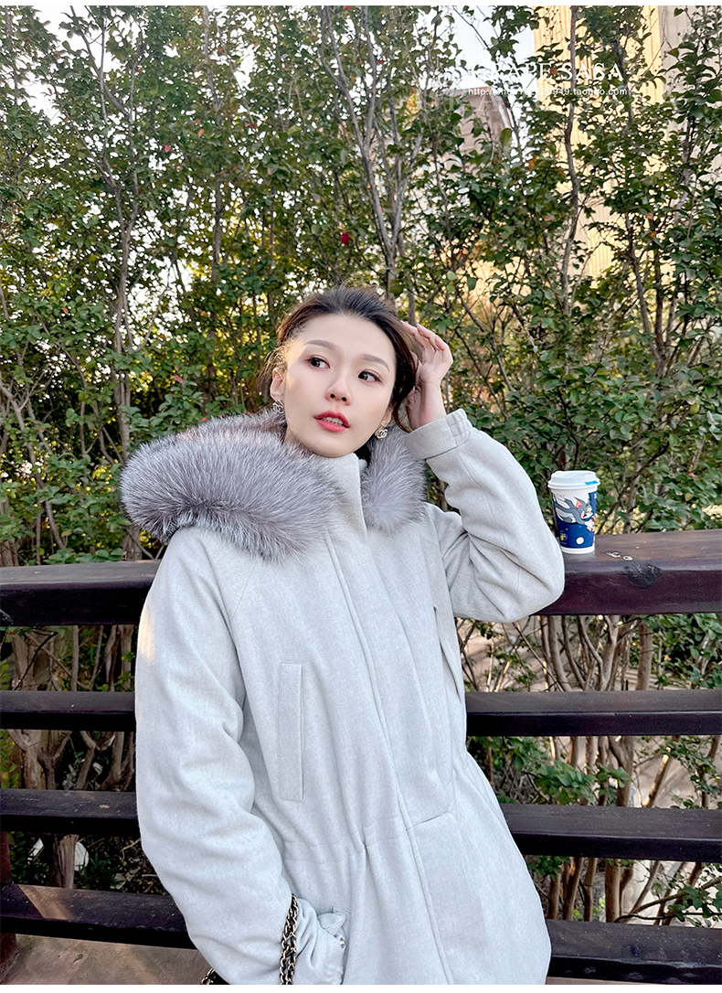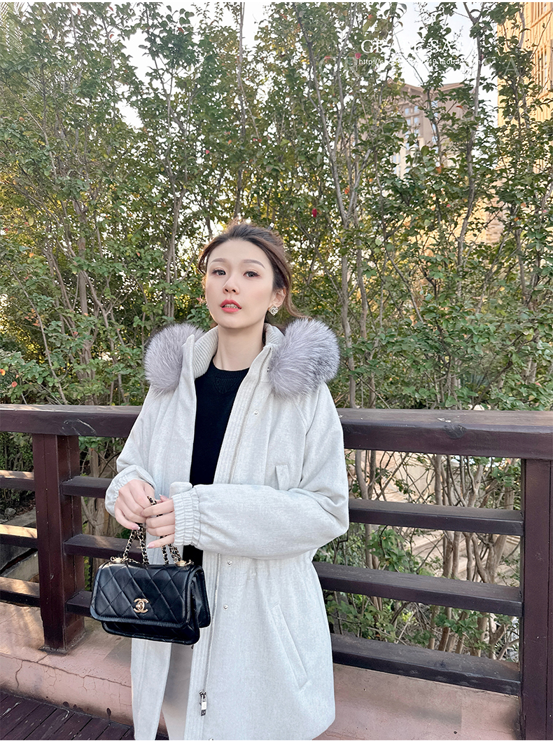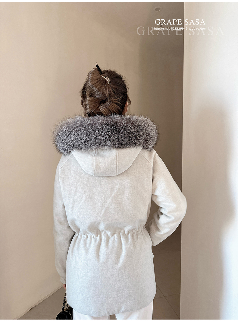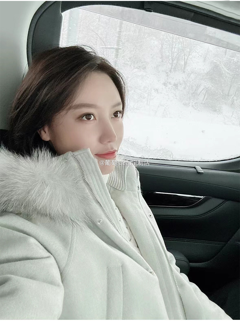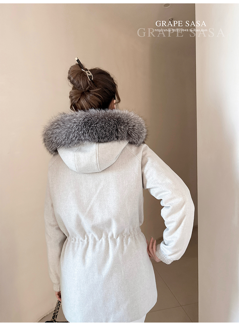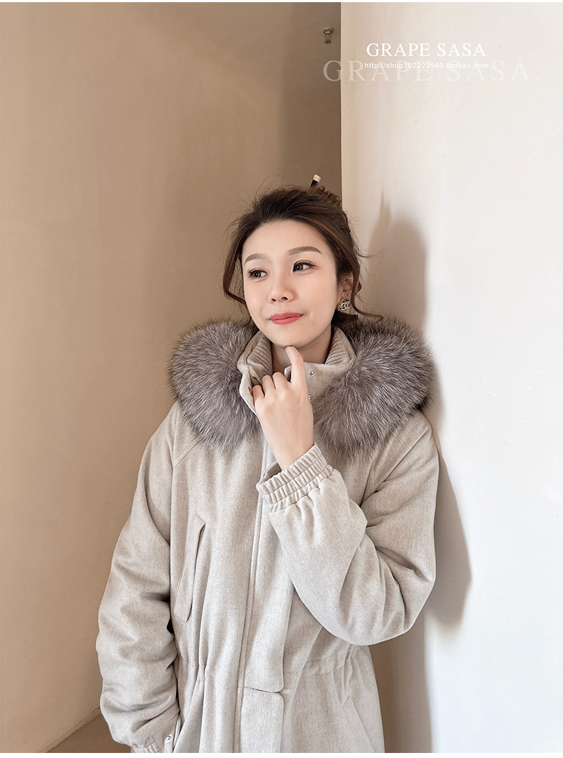 Lp的Icery面料是100%山羊绒(也很耗料)领口针织也是100%山羊绒、帽子又是银蓝狐狸毛。