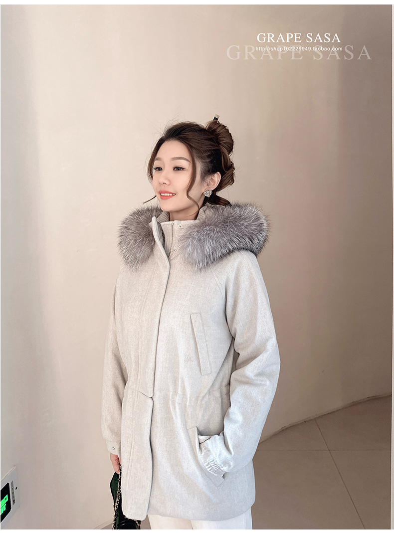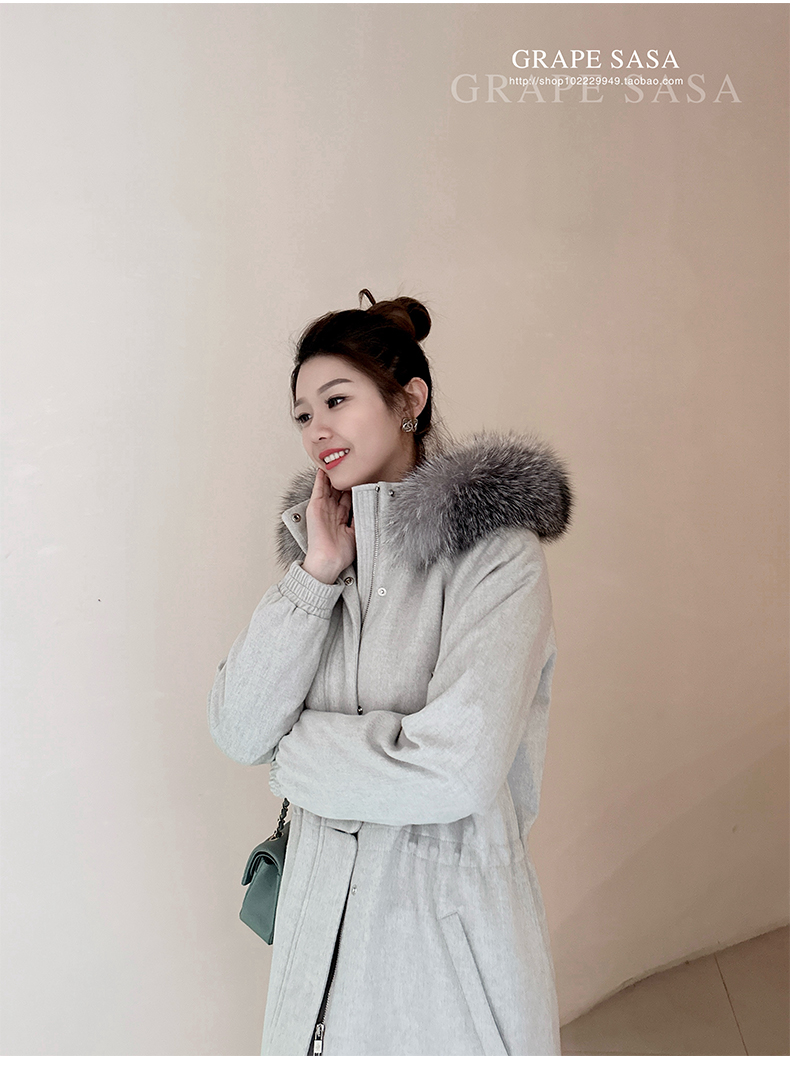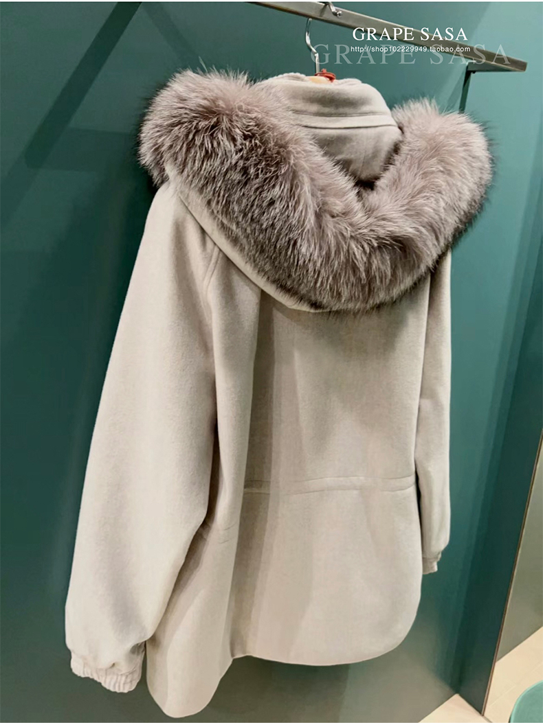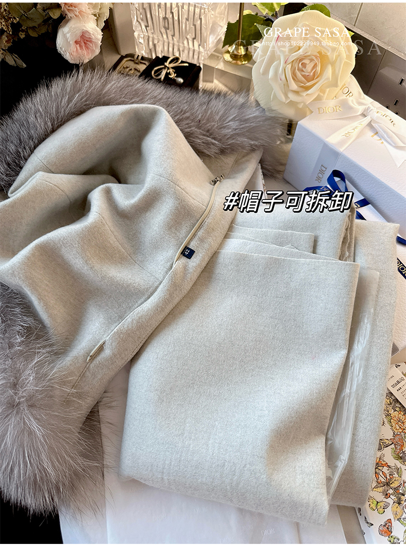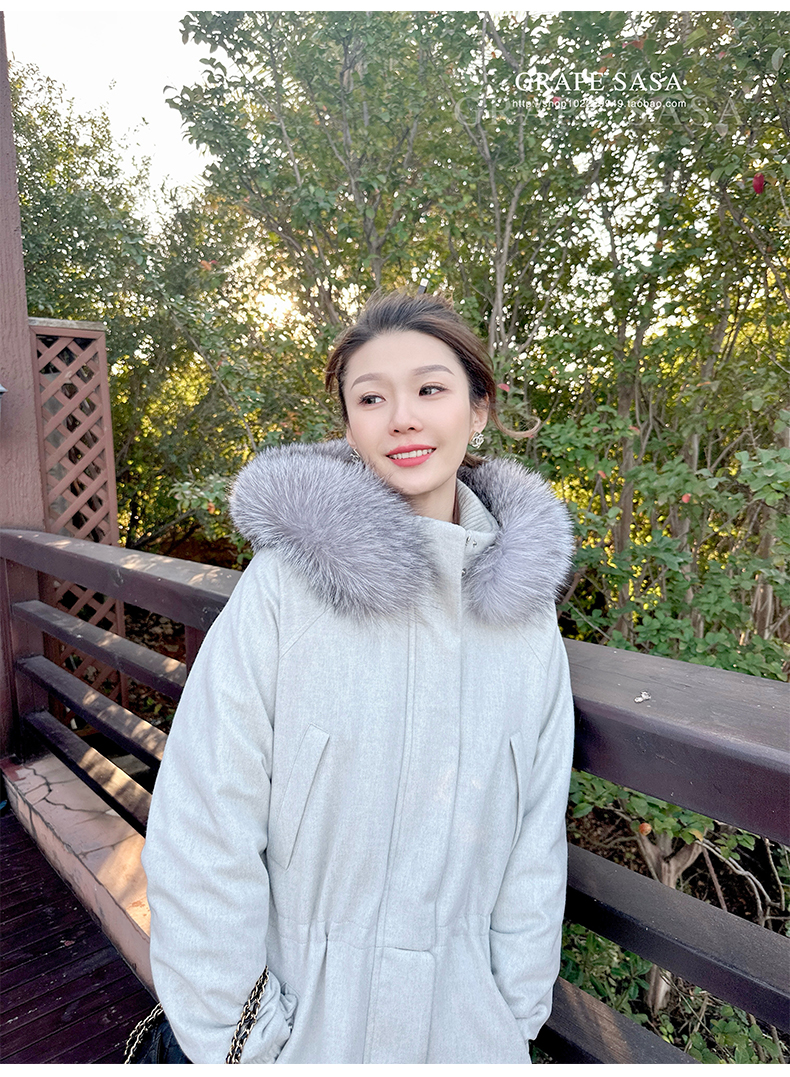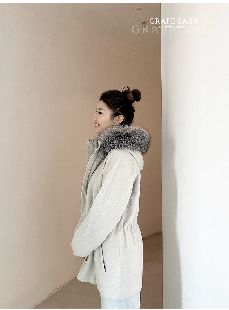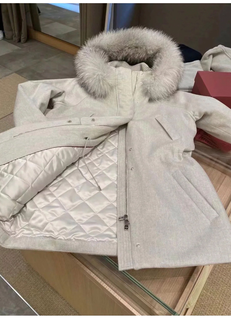 Lp的Icery面料是100%山羊绒(也很耗料)领口针织也是100%山羊绒、帽子又是银蓝狐狸毛。