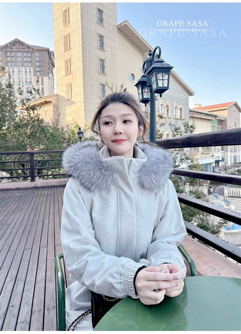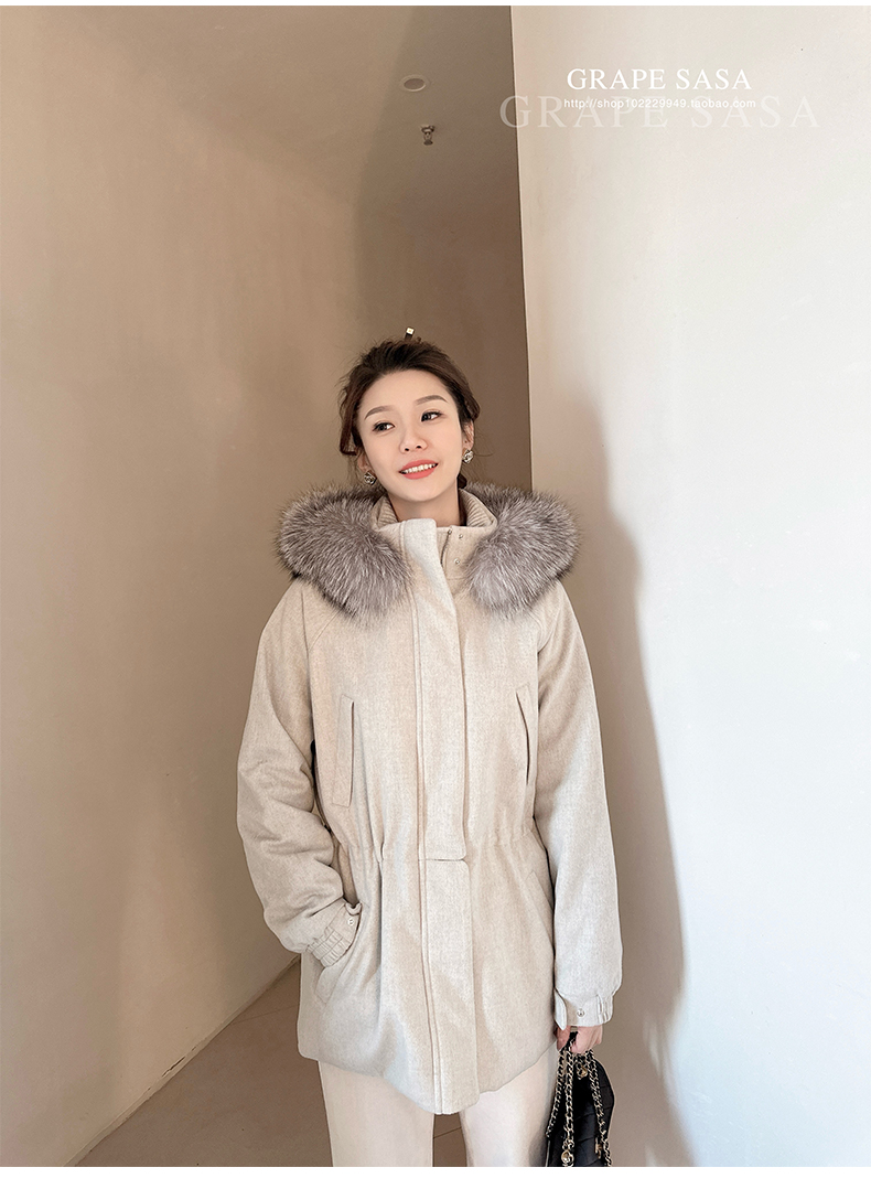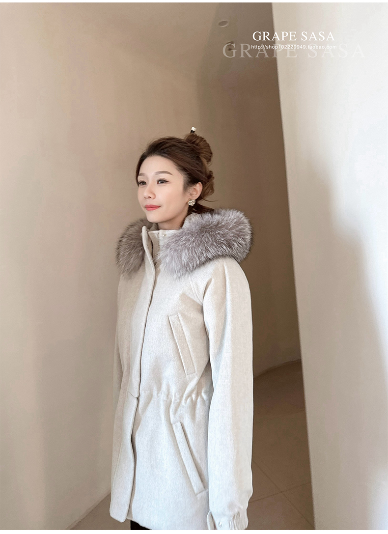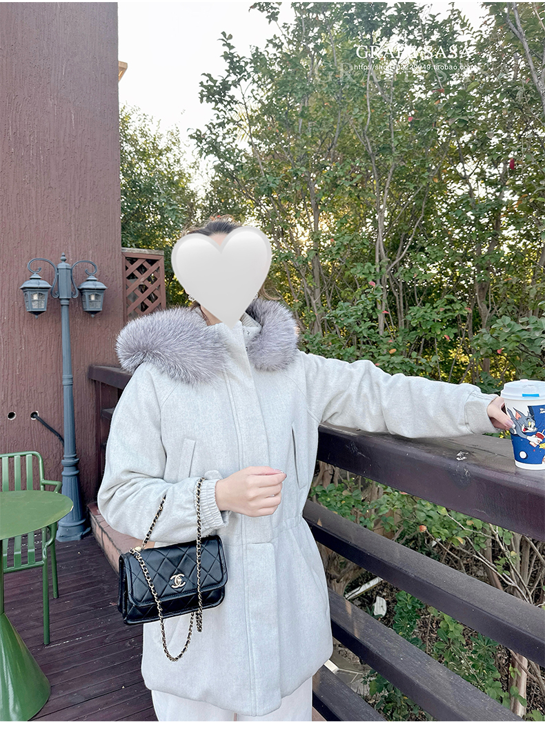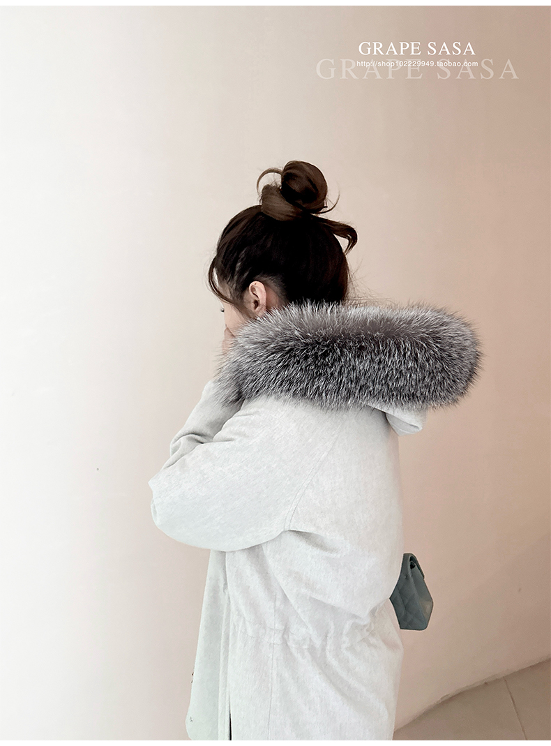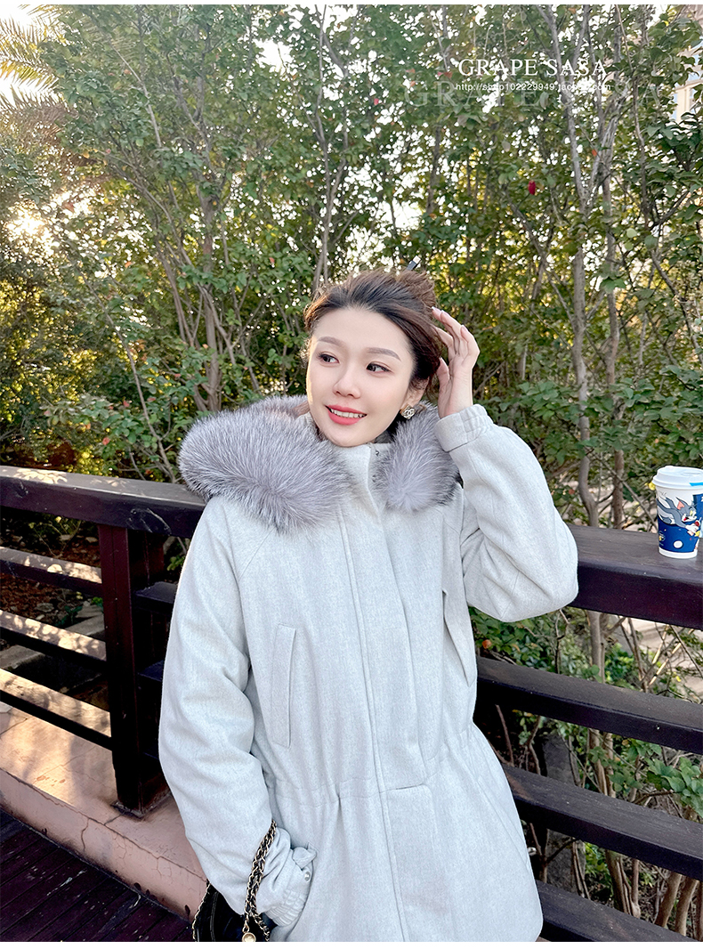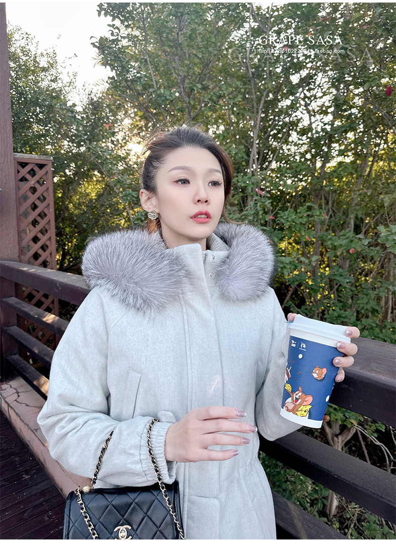 Lp的Icery面料是100%山羊绒(也很耗料)领口针织也是100%山羊绒、帽子又是银蓝狐狸毛。