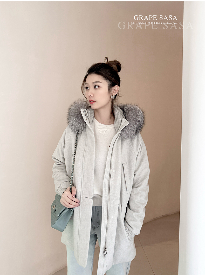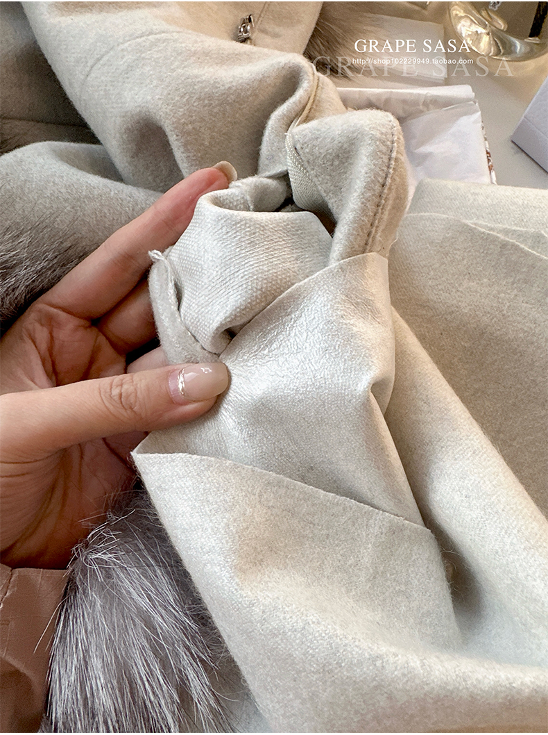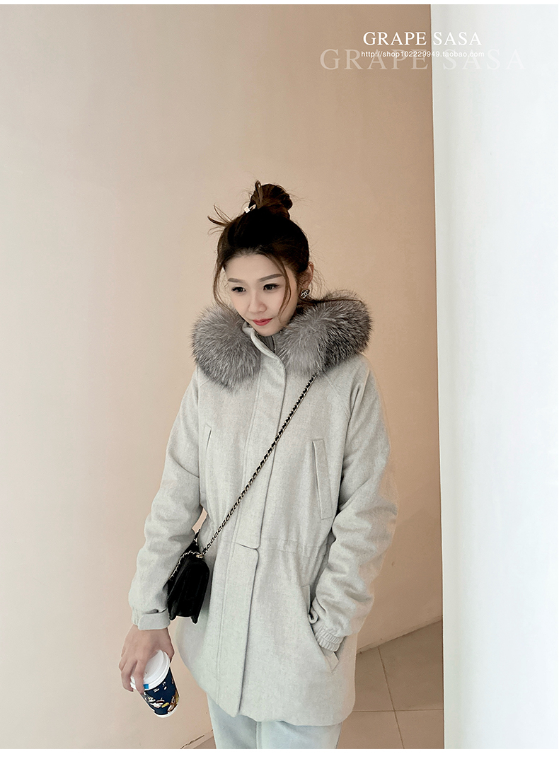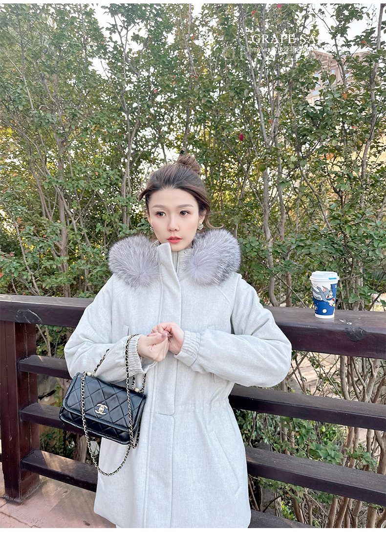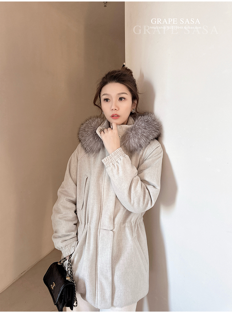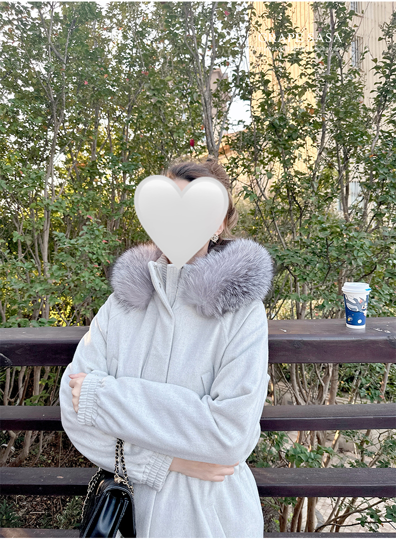 Lp的Icery面料是100%山羊绒(也很耗料)领口针织也是100%山羊绒、帽子又是银蓝狐狸毛。