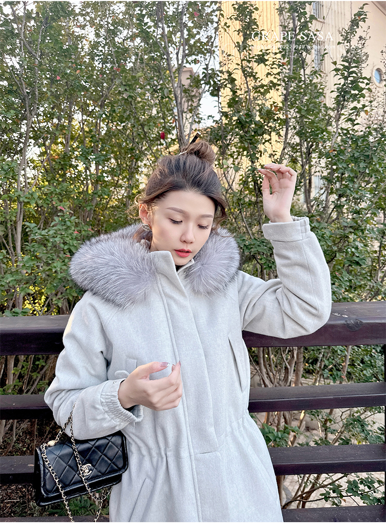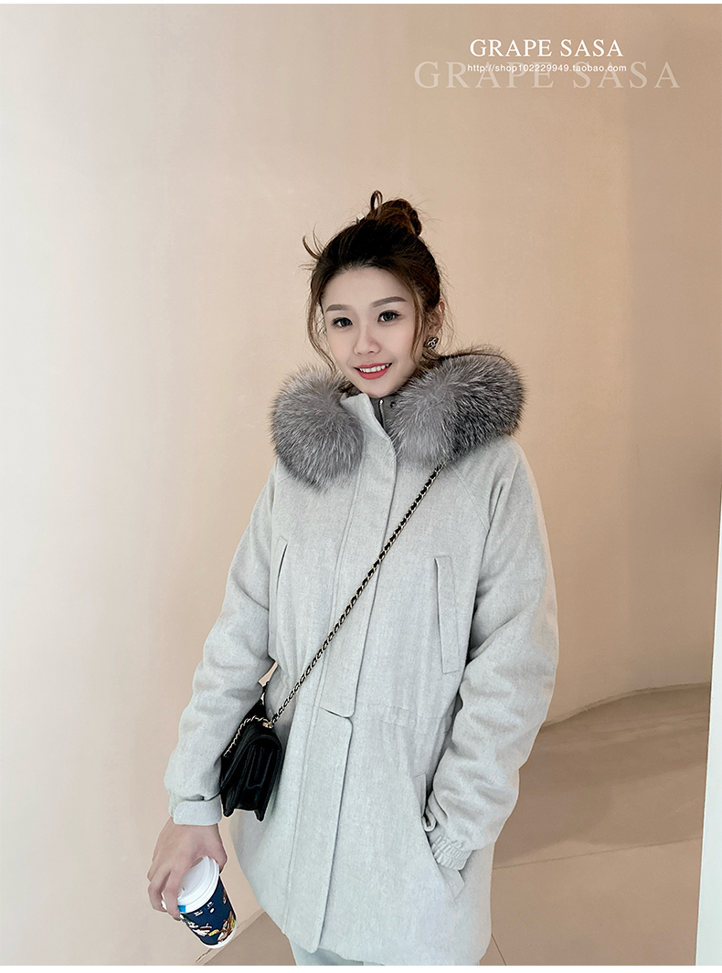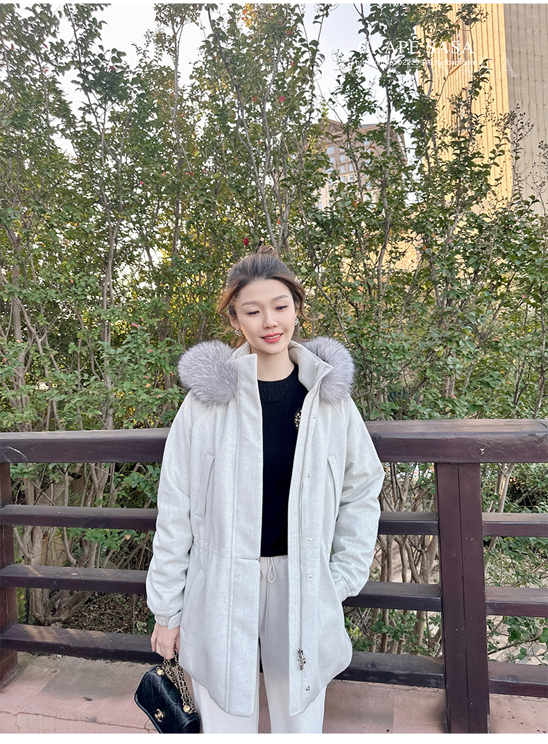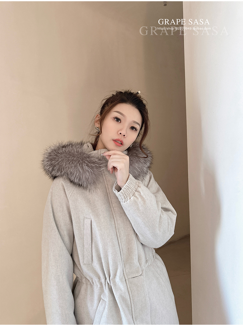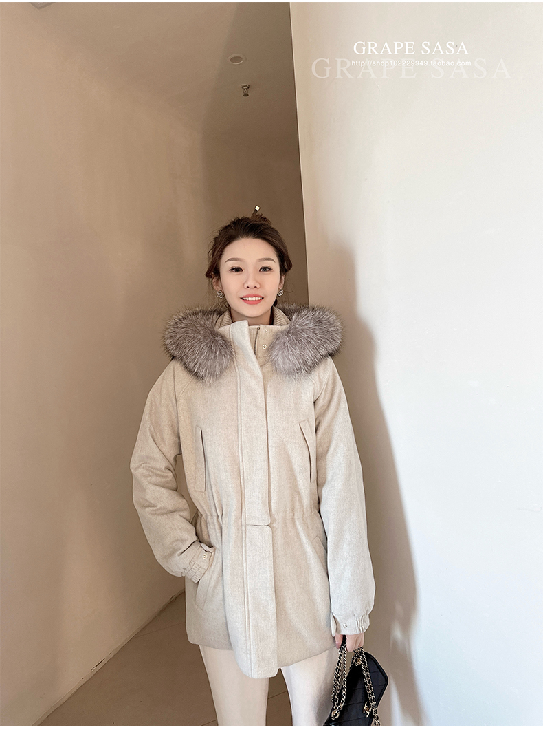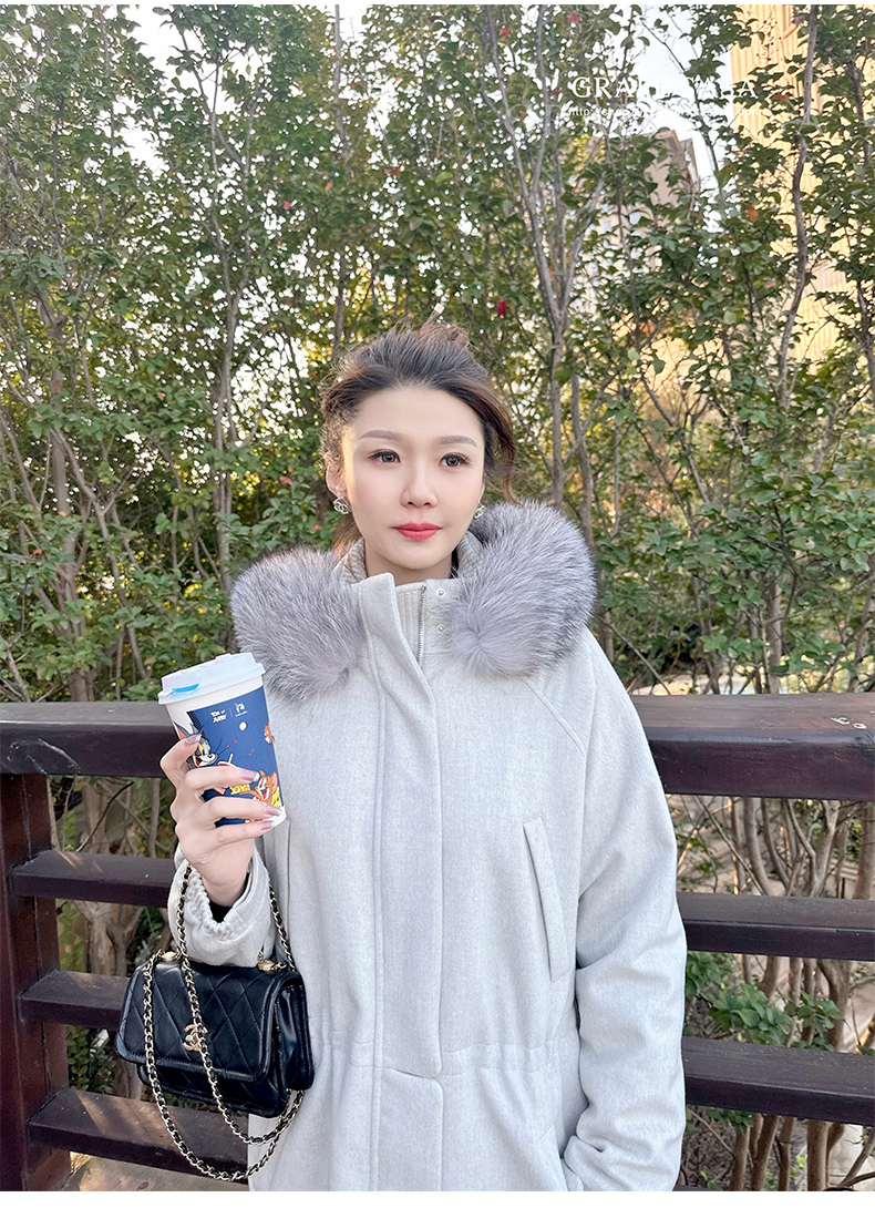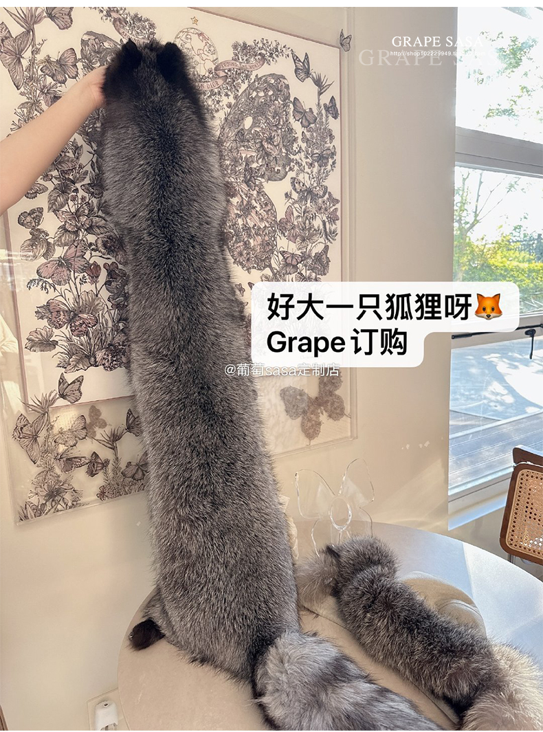 Lp的Icery面料是100%山羊绒(也很耗料)领口针织也是100%山羊绒、帽子又是银蓝狐狸毛。
