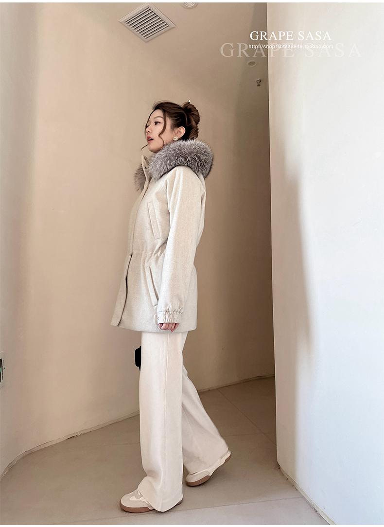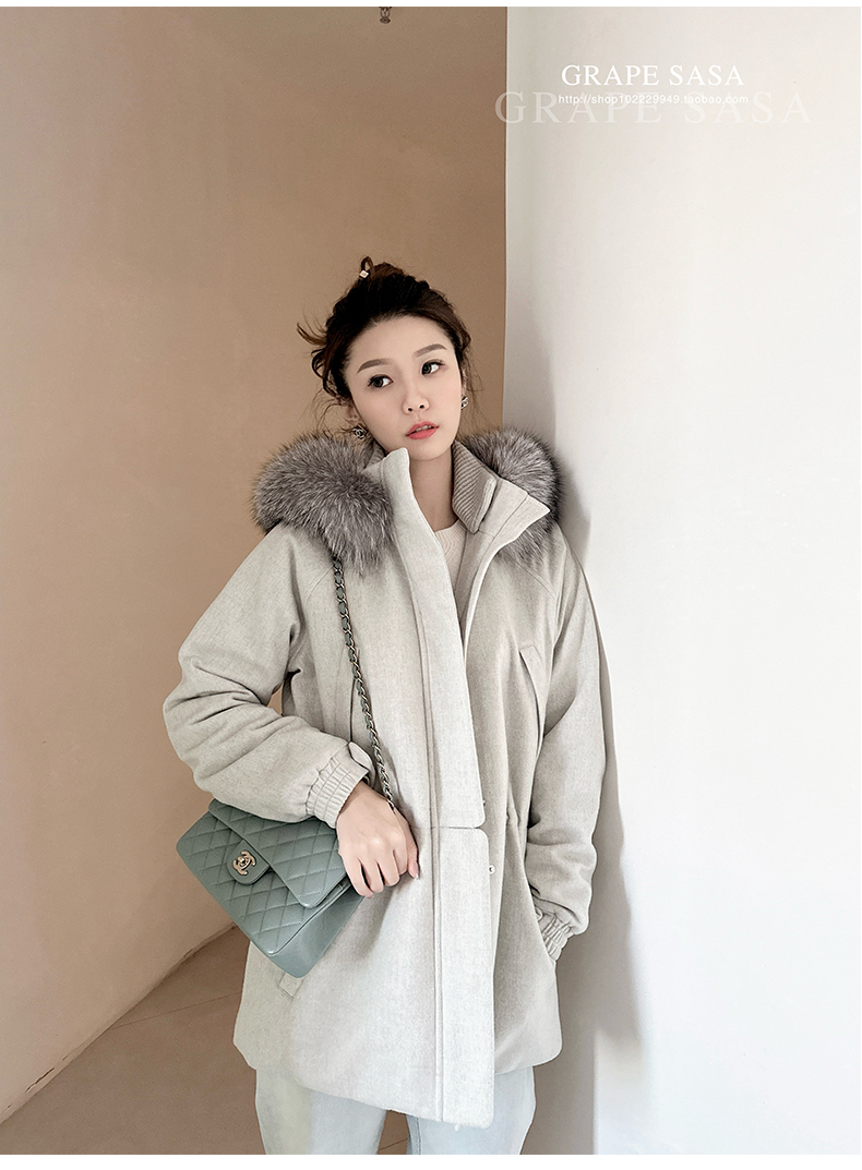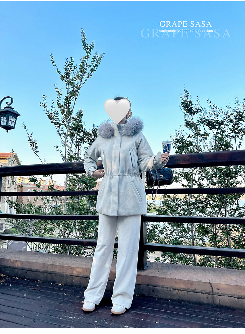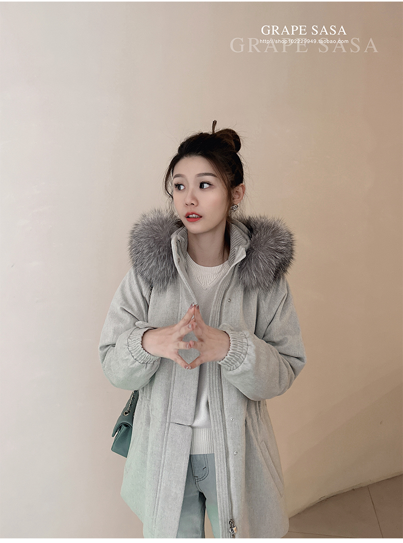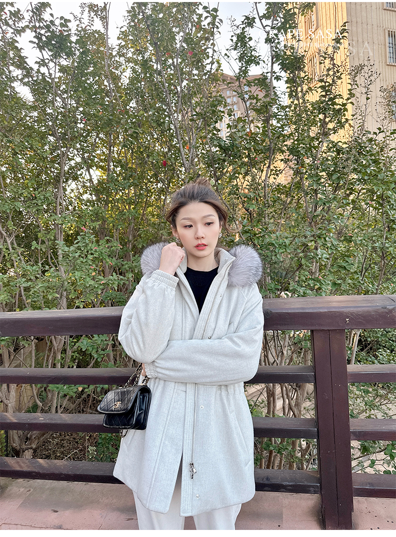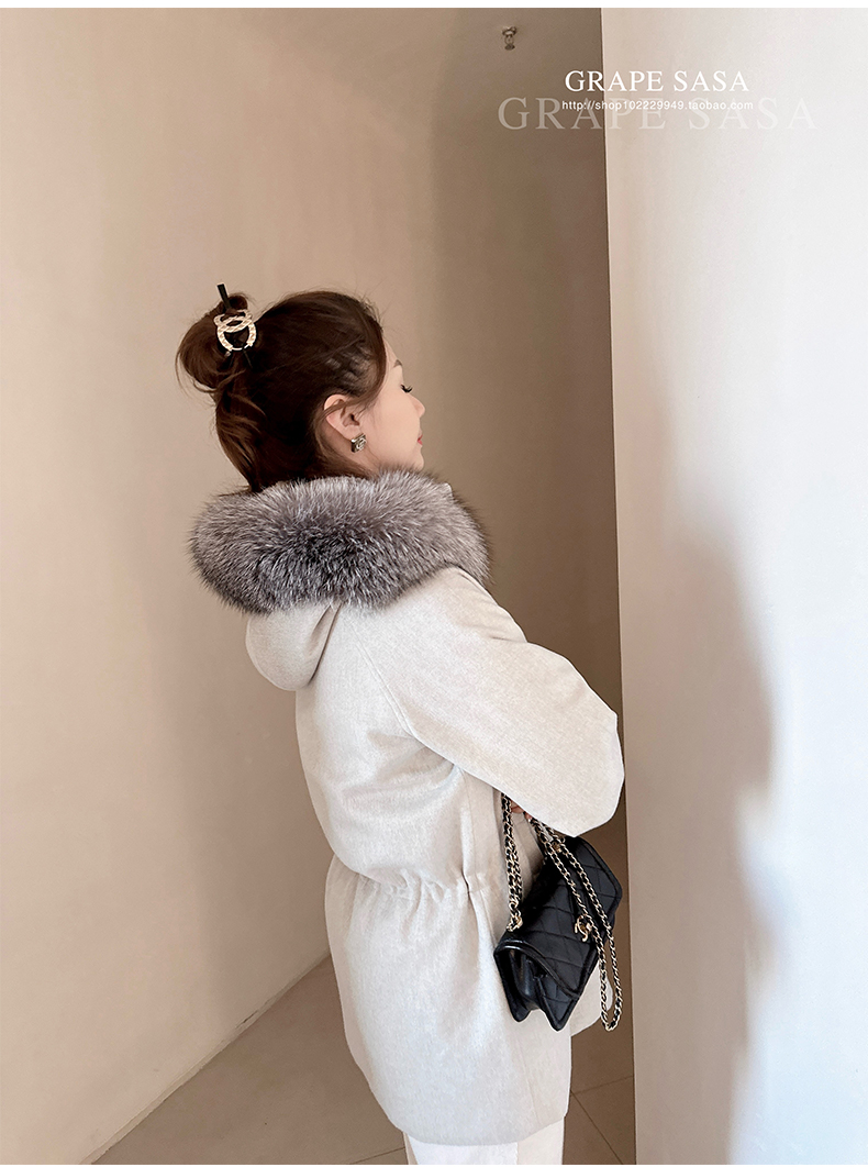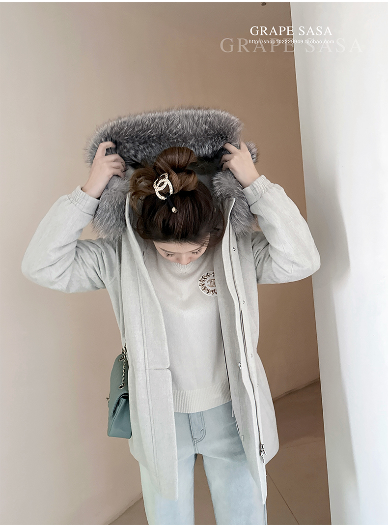 Lp的Icery面料是100%山羊绒(也很耗料)领口针织也是100%山羊绒、帽子又是银蓝狐狸毛。