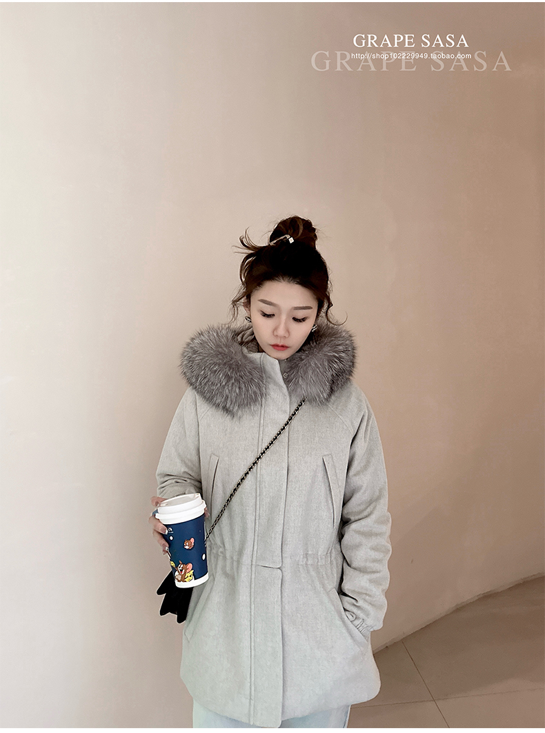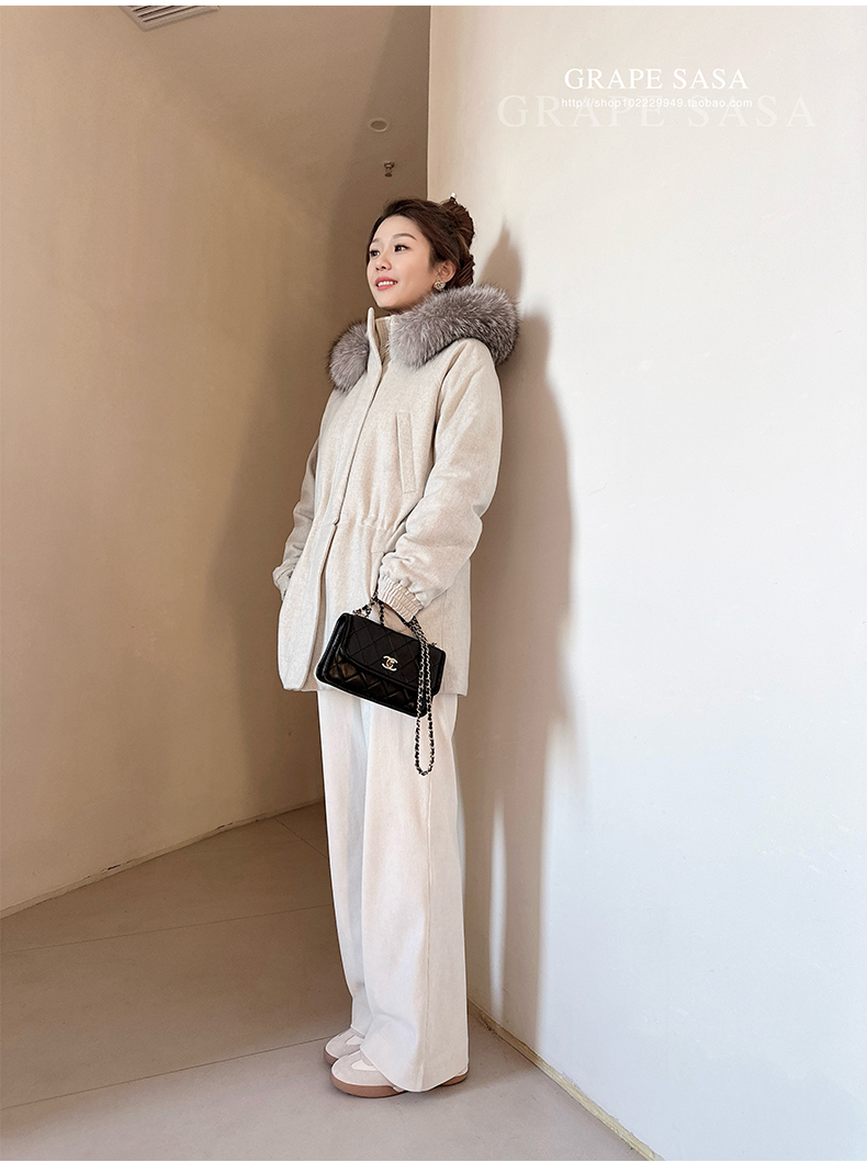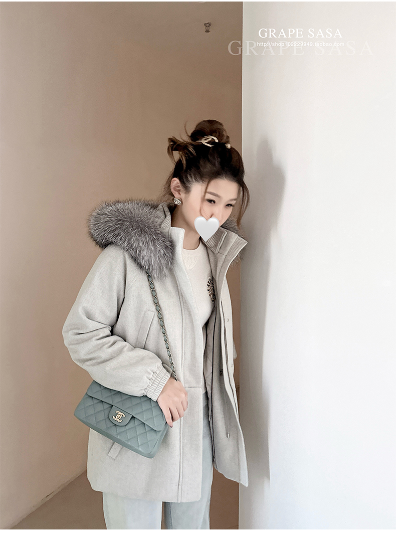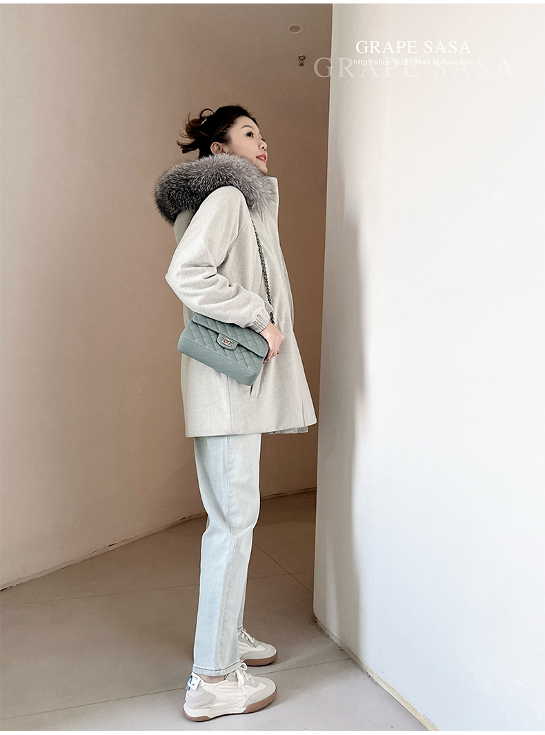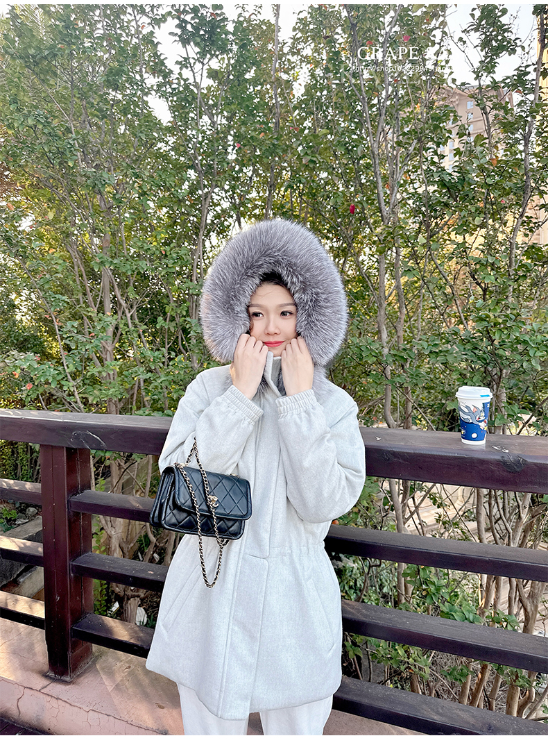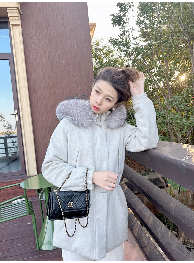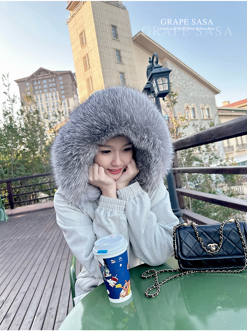 Lp的Icery面料是100%山羊绒(也很耗料)领口针织也是100%山羊绒、帽子又是银蓝狐狸毛。