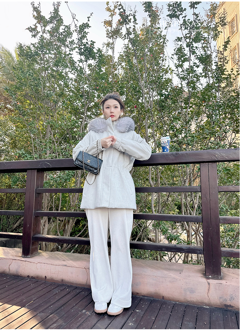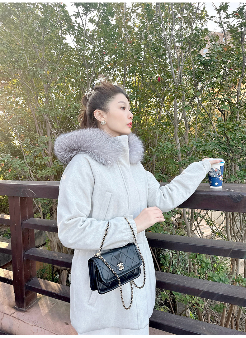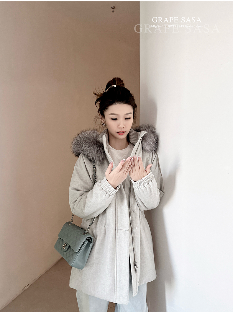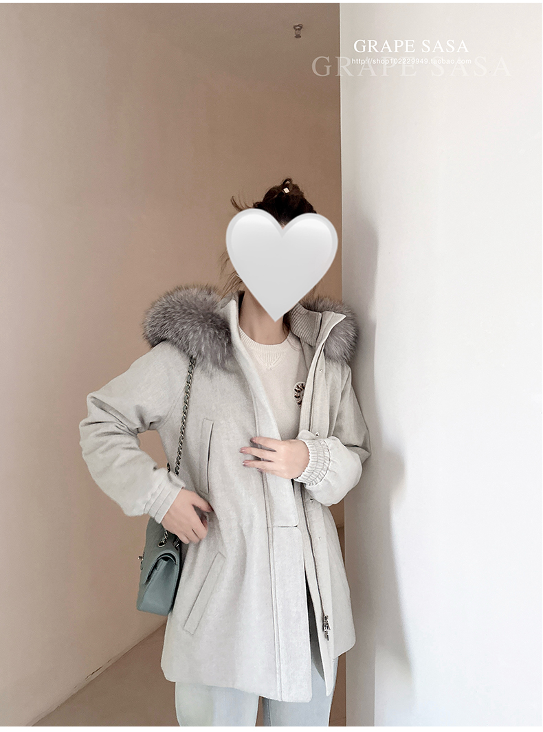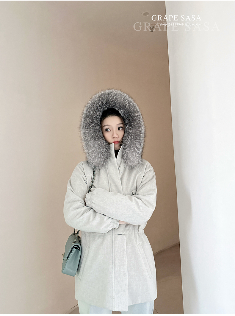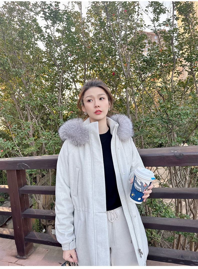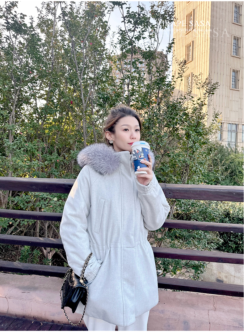 Lp的Icery面料是100%山羊绒(也很耗料)领口针织也是100%山羊绒、帽子又是银蓝狐狸毛。