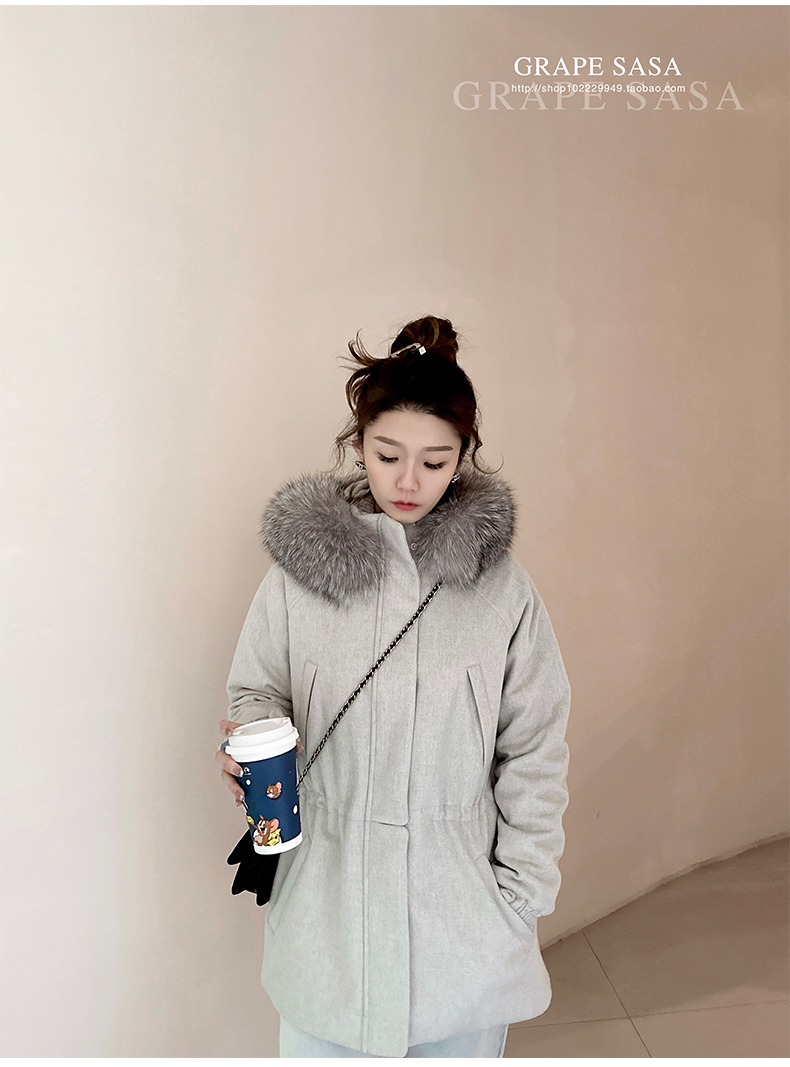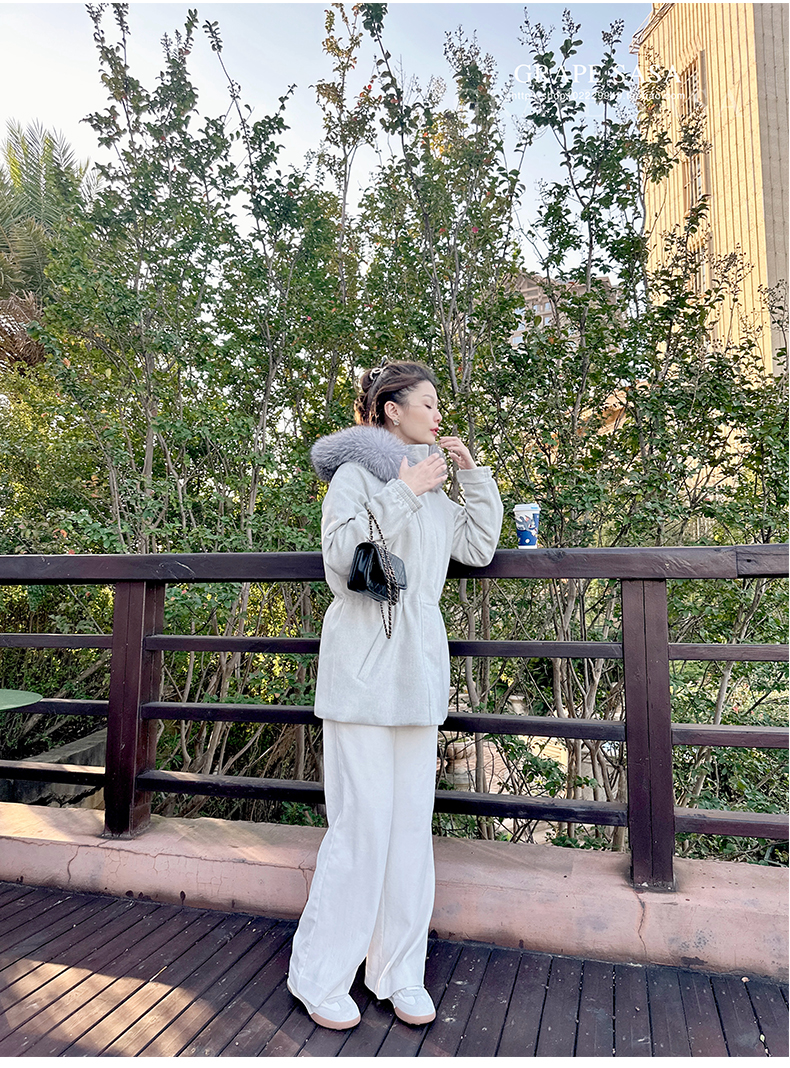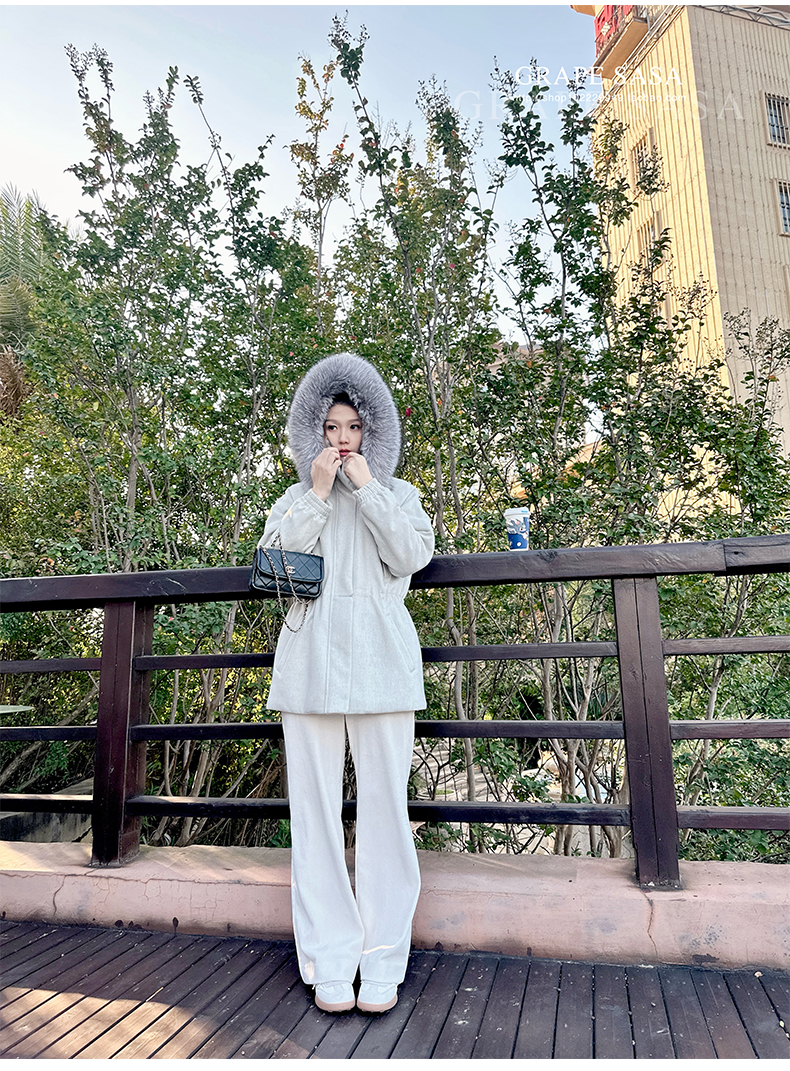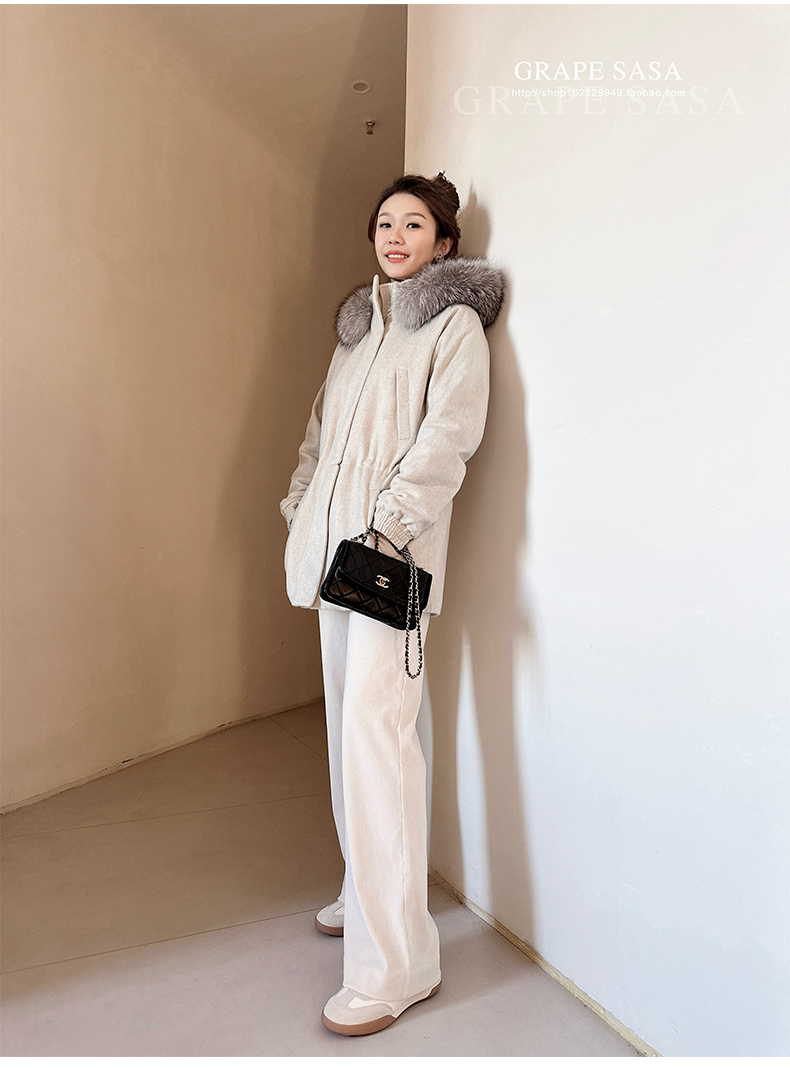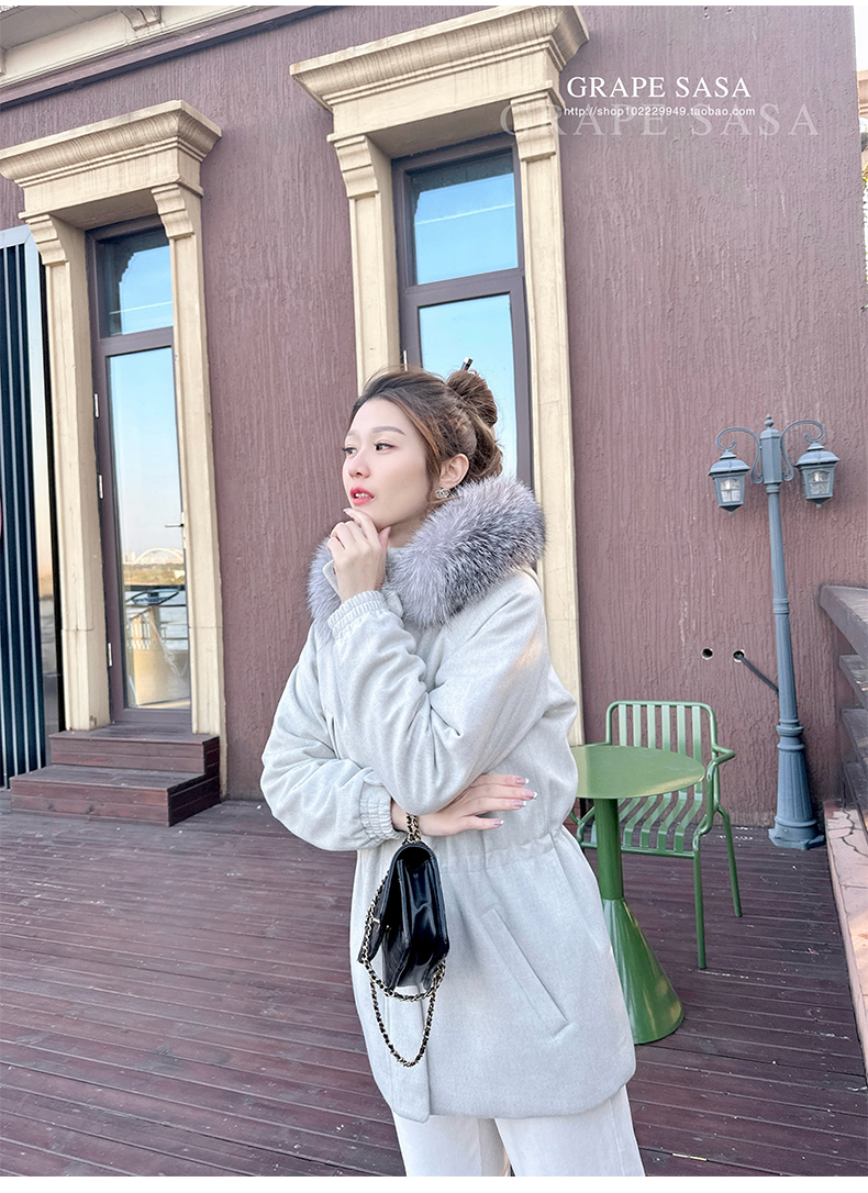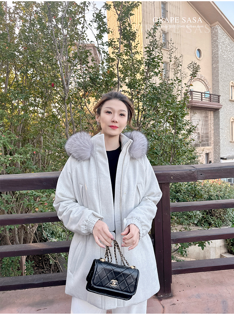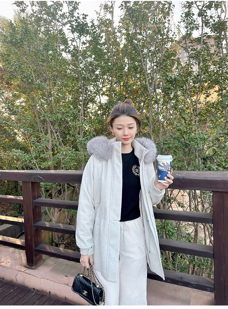 Lp的Icery面料是100%山羊绒(也很耗料)领口针织也是100%山羊绒、帽子又是银蓝狐狸毛。