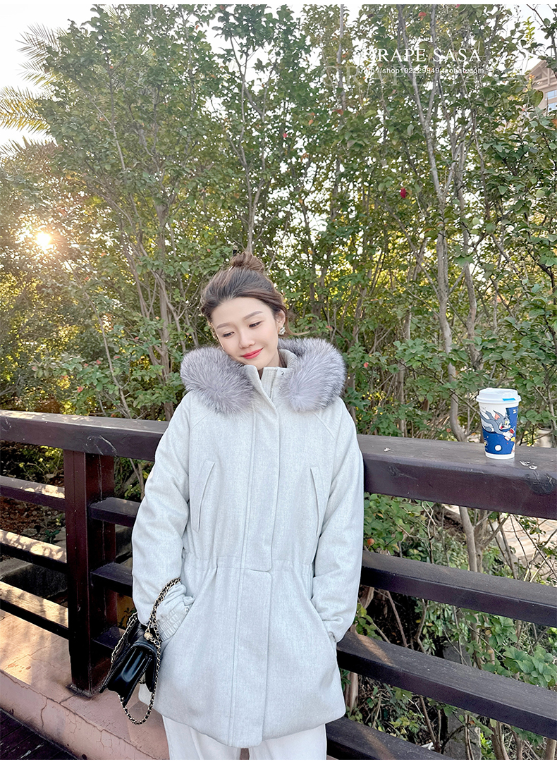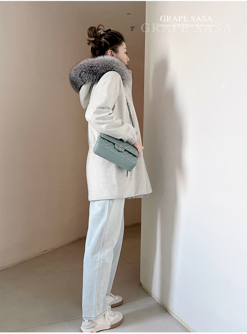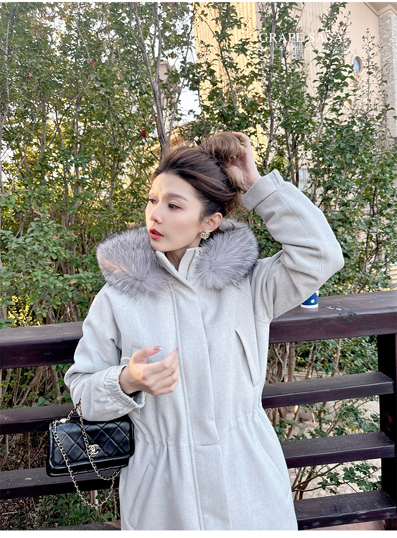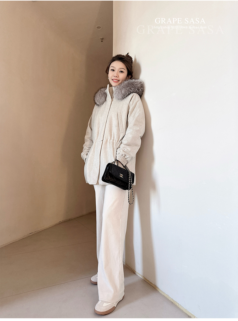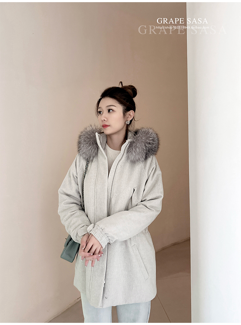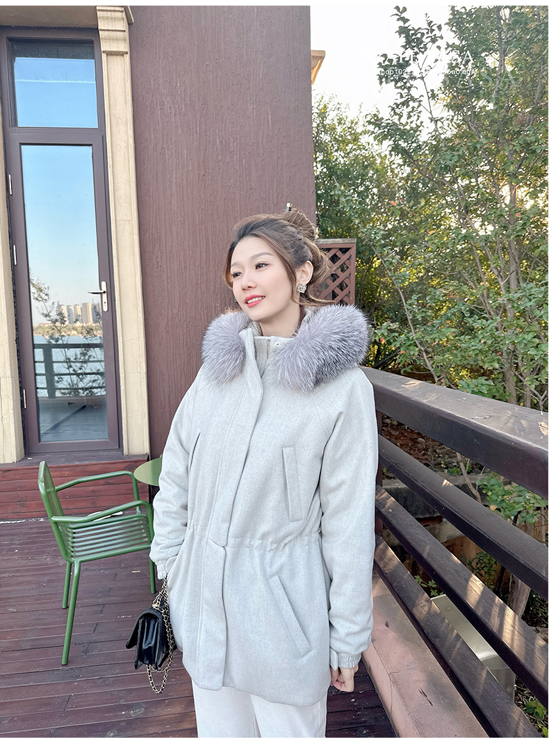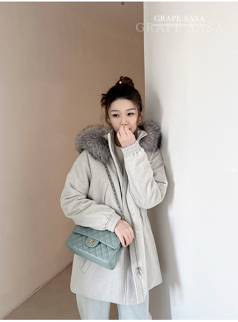 Lp的Icery面料是100%山羊绒(也很耗料)领口针织也是100%山羊绒、帽子又是银蓝狐狸毛。