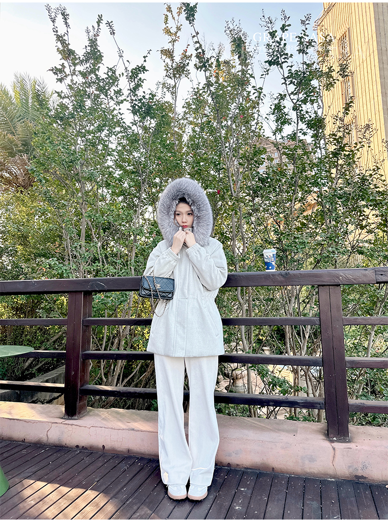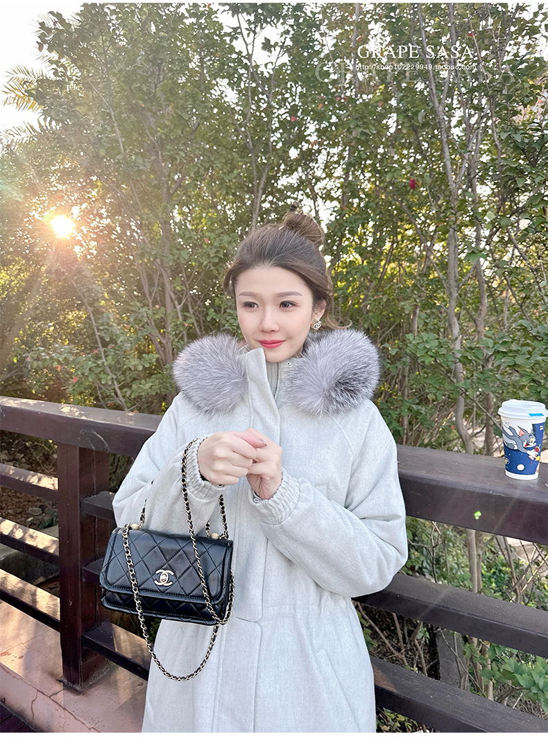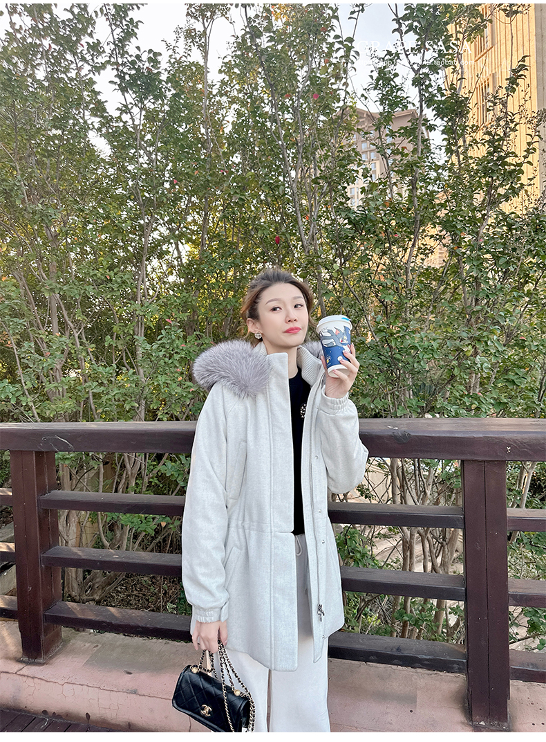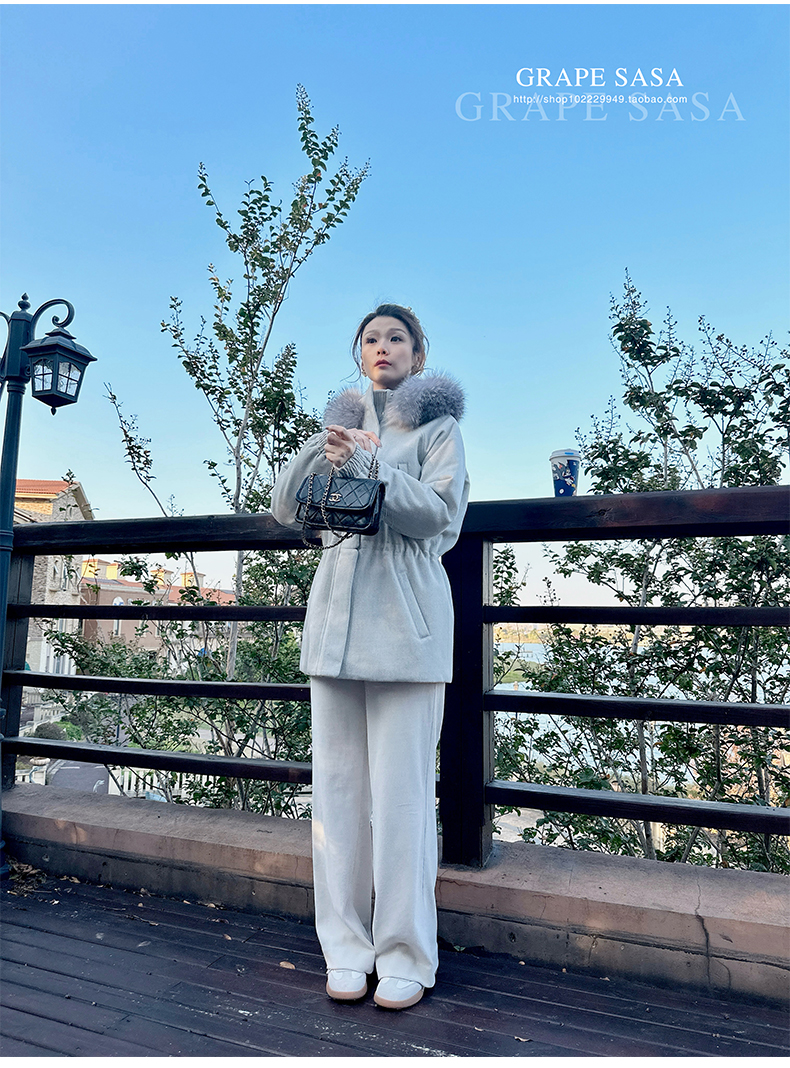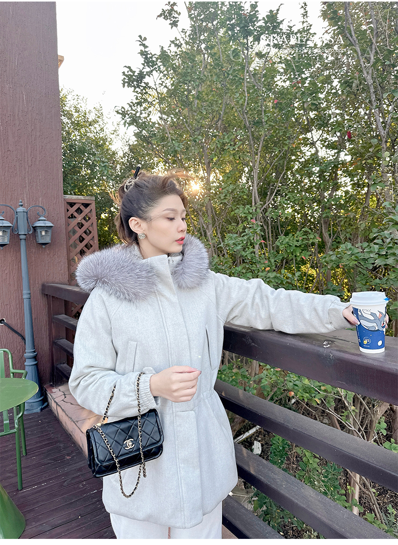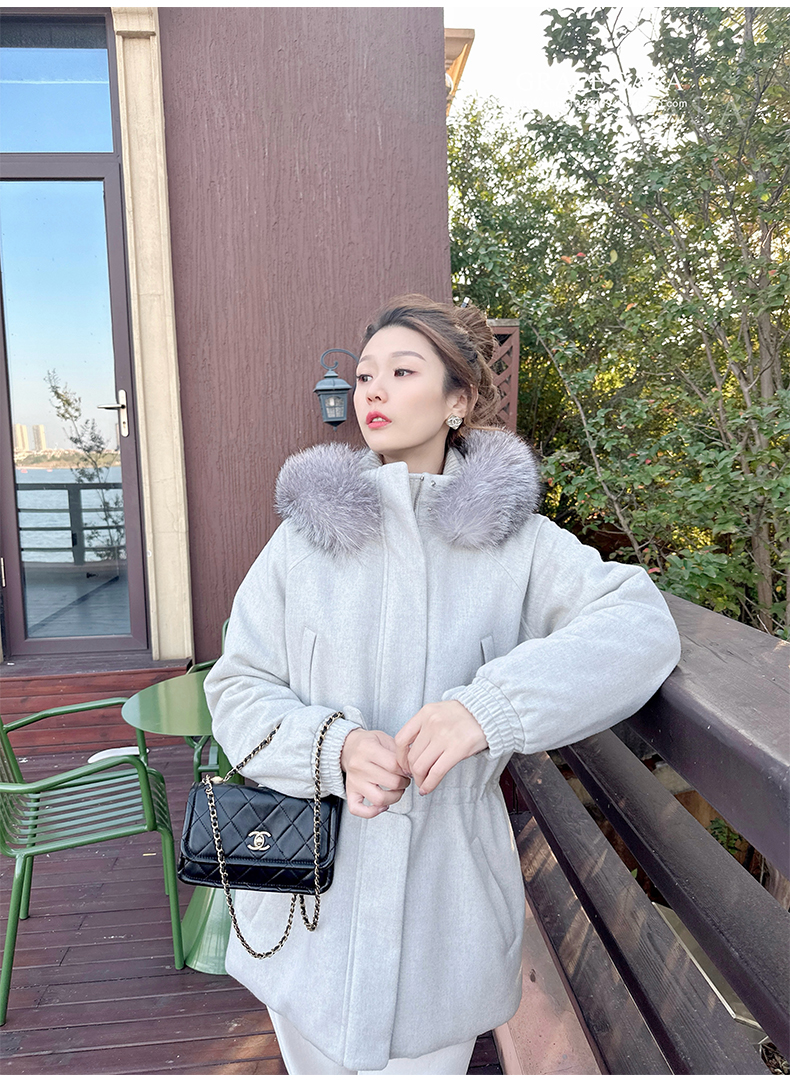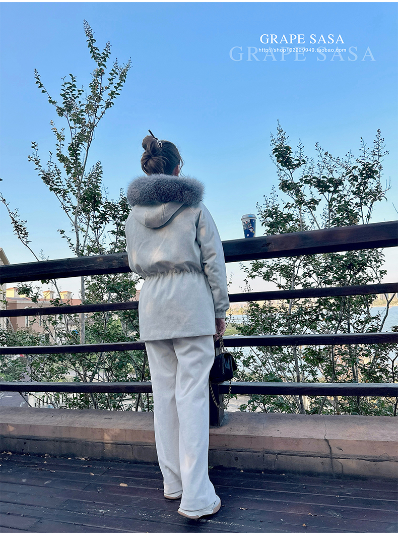 Lp的Icery面料是100%山羊绒(也很耗料)领口针织也是100%山羊绒、帽子又是银蓝狐狸毛。