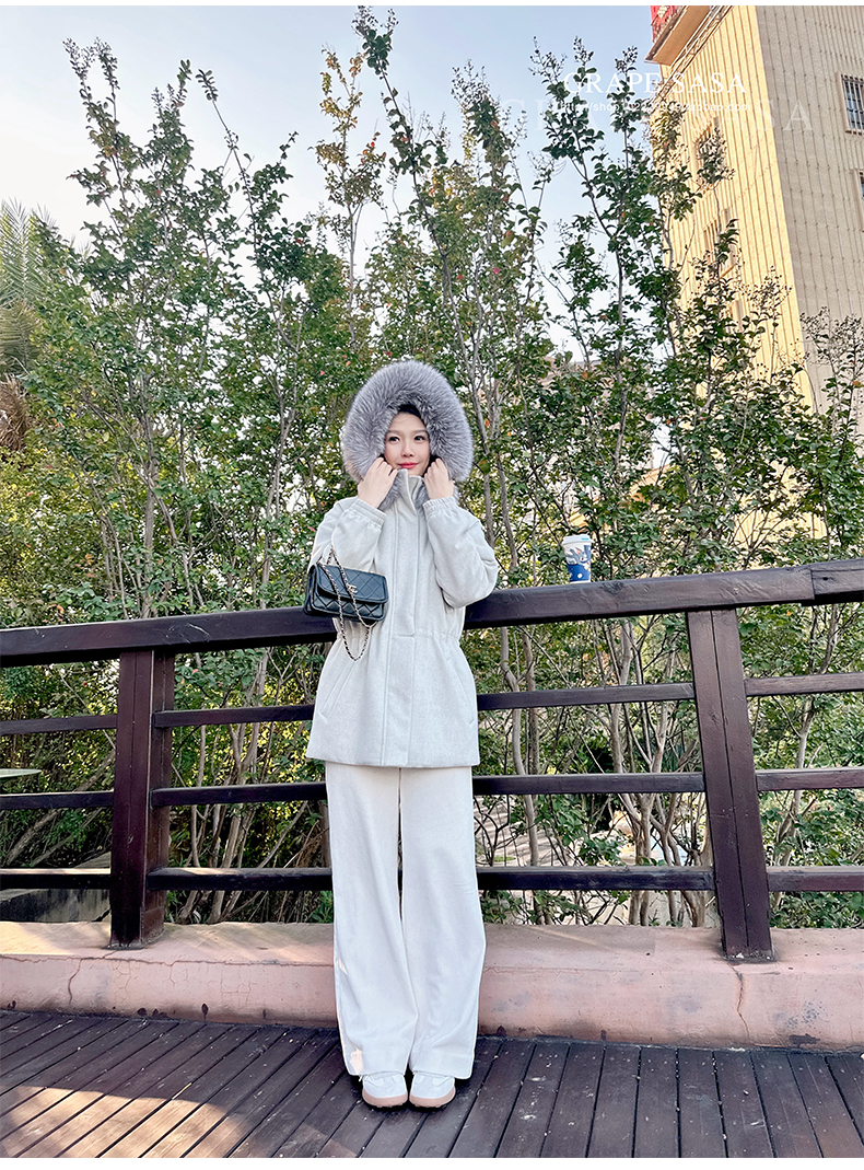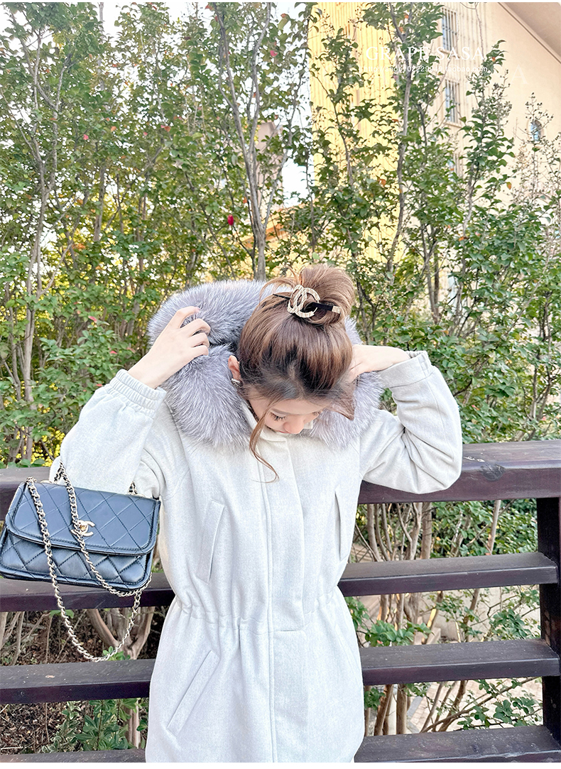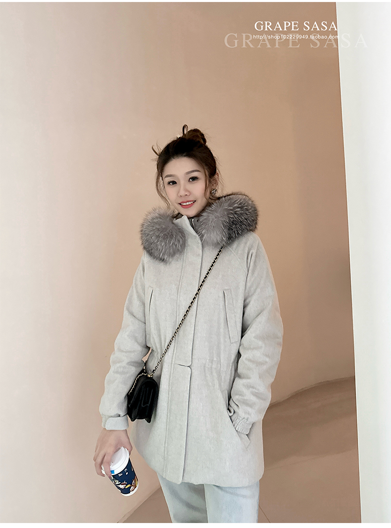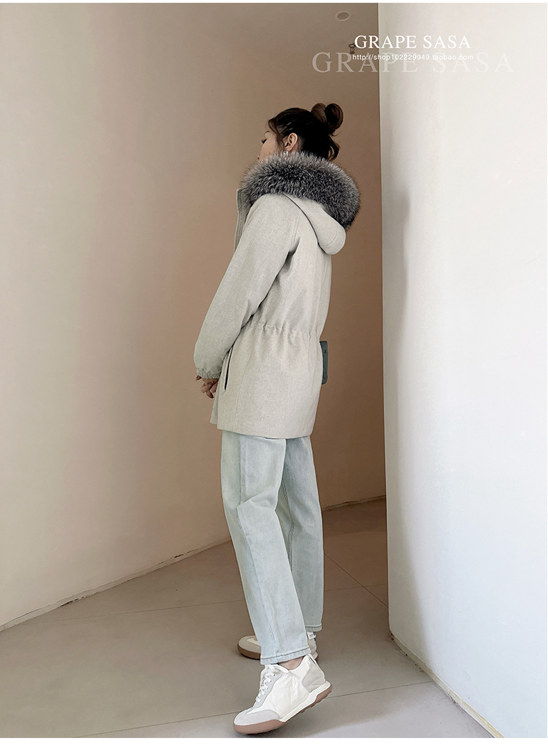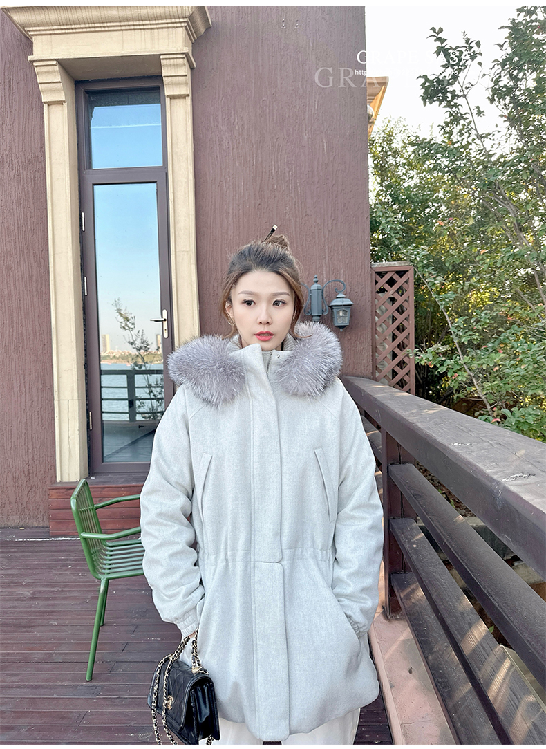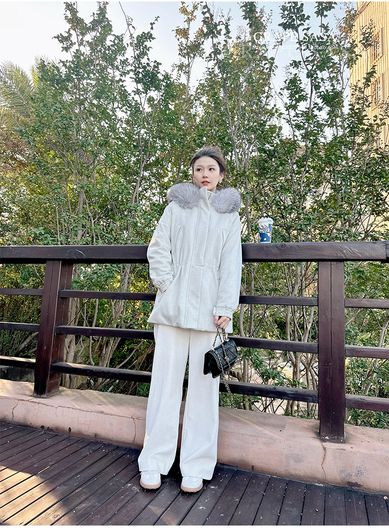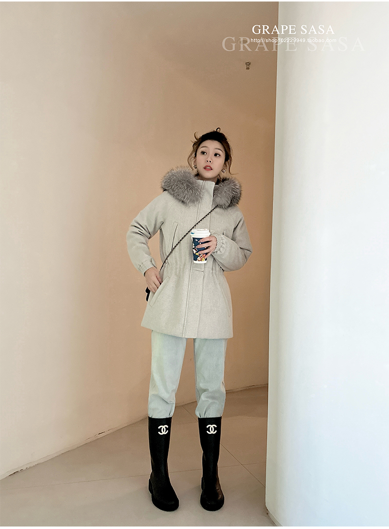 Lp的Icery面料是100%山羊绒(也很耗料)领口针织也是100%山羊绒、帽子又是银蓝狐狸毛。