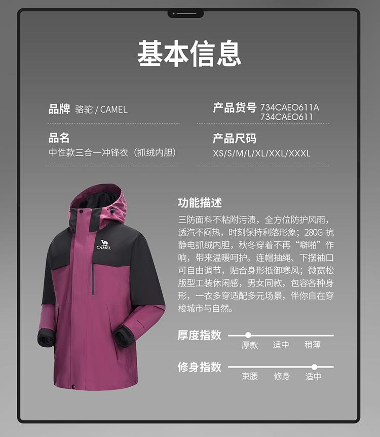 3514系列含有AD12263514X/AD12263514D/AD22263513X/AD22263513A5/AD22263513B5是情侣款三合一抓绒内胆;AD12263514A/AD12263514B,AD22263513A/AD12263514Y/AD22263513Y是情侣款三合一羽绒内胆,皆为同款同品质,因批次不同,可能出现轻微色差,仓库随机发货,骆驼粉丝们介意慎拍!