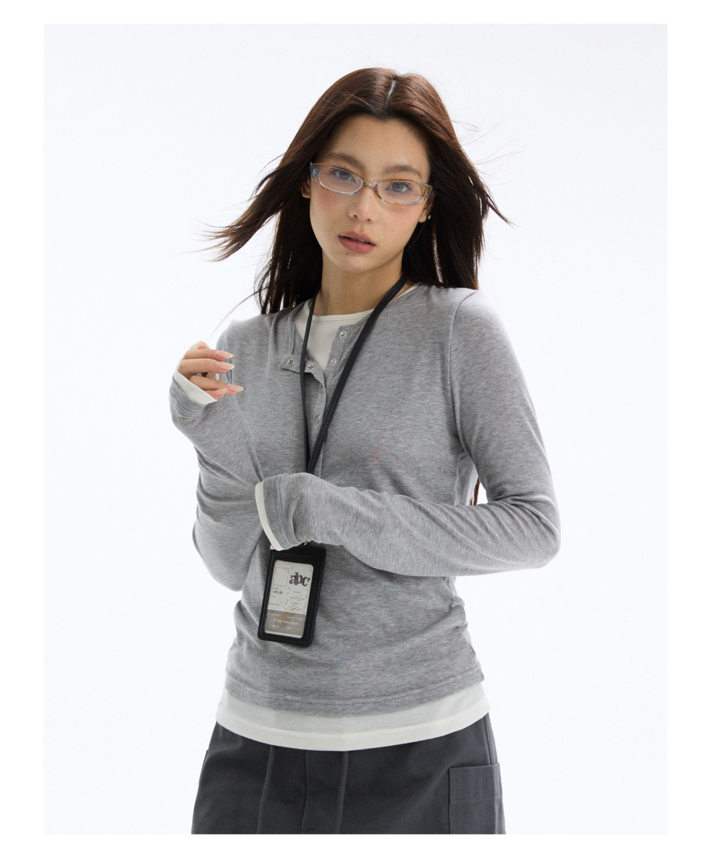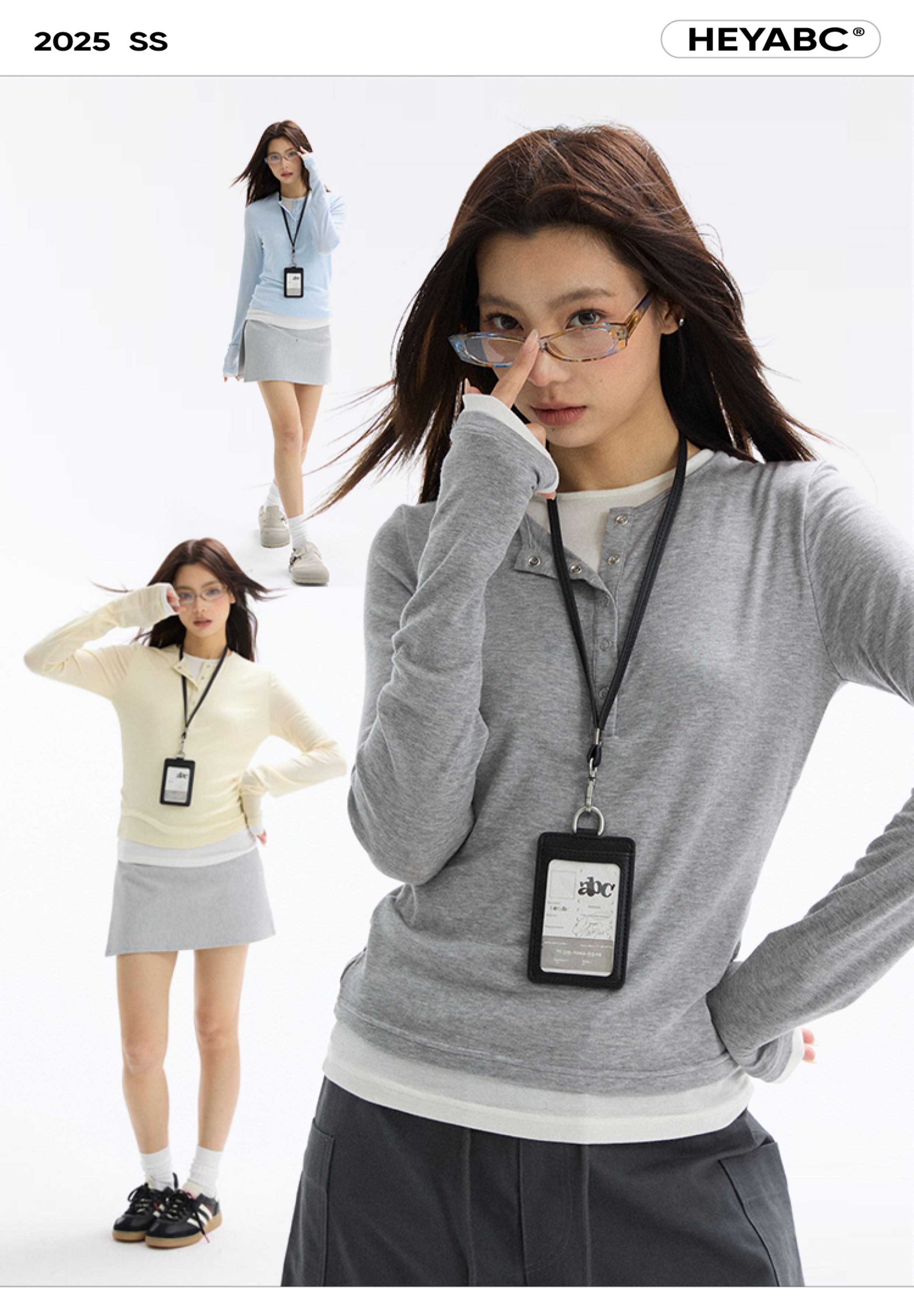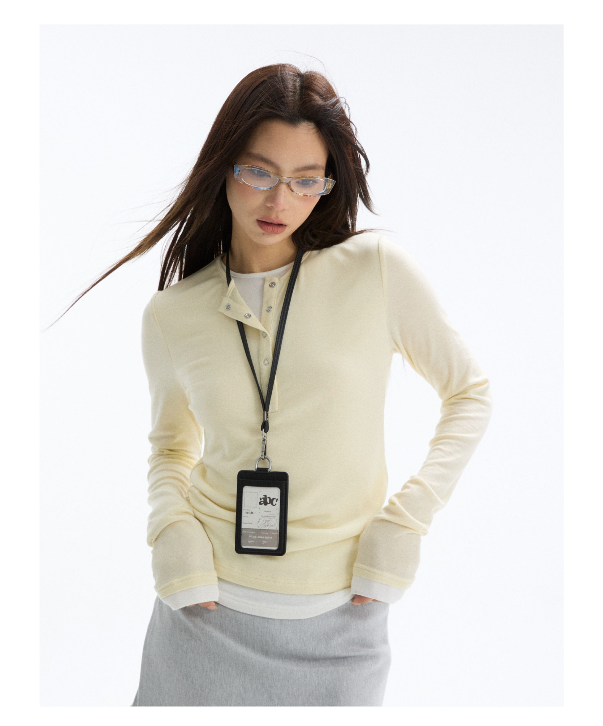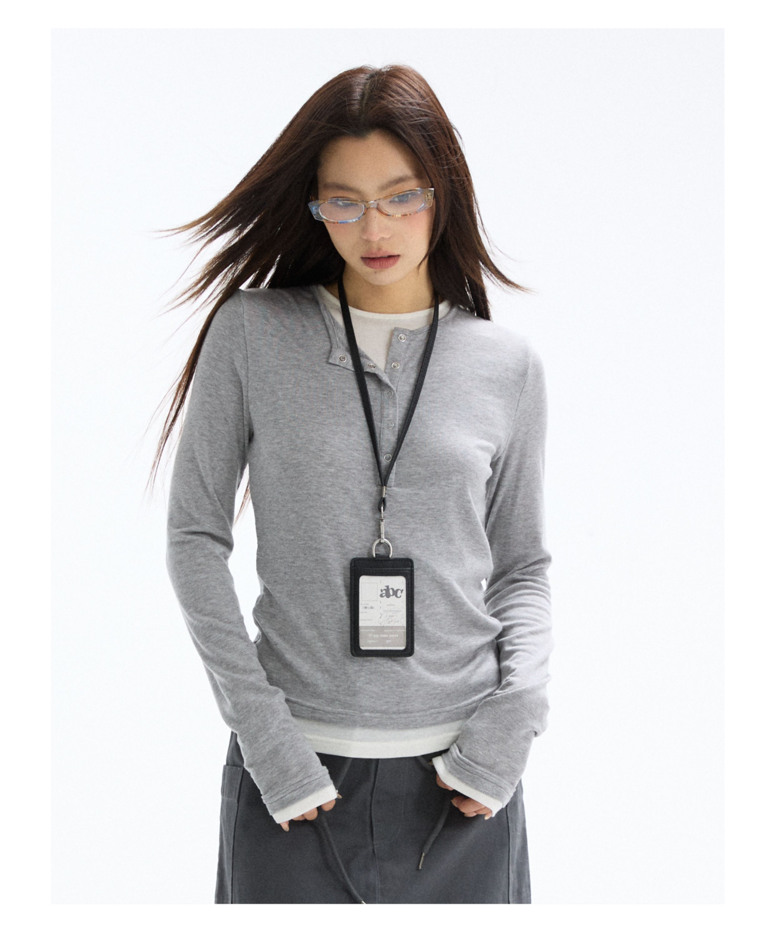 Heyabc Henry Collar Tencel Wool Base Layer Soft Faux Two-Piece Button-Up Top Women's Slim-Fit Long-Sleeve T-Shirt