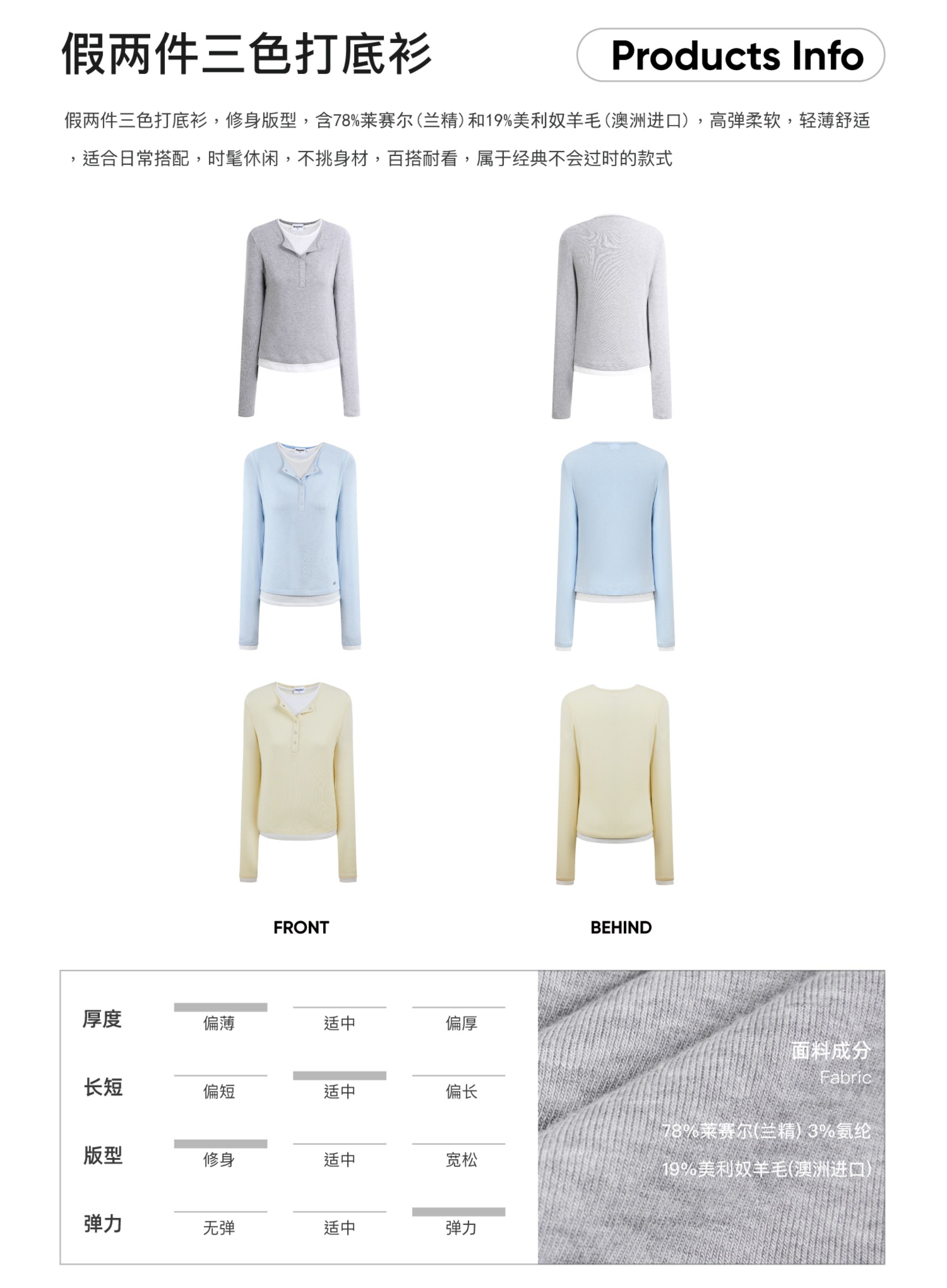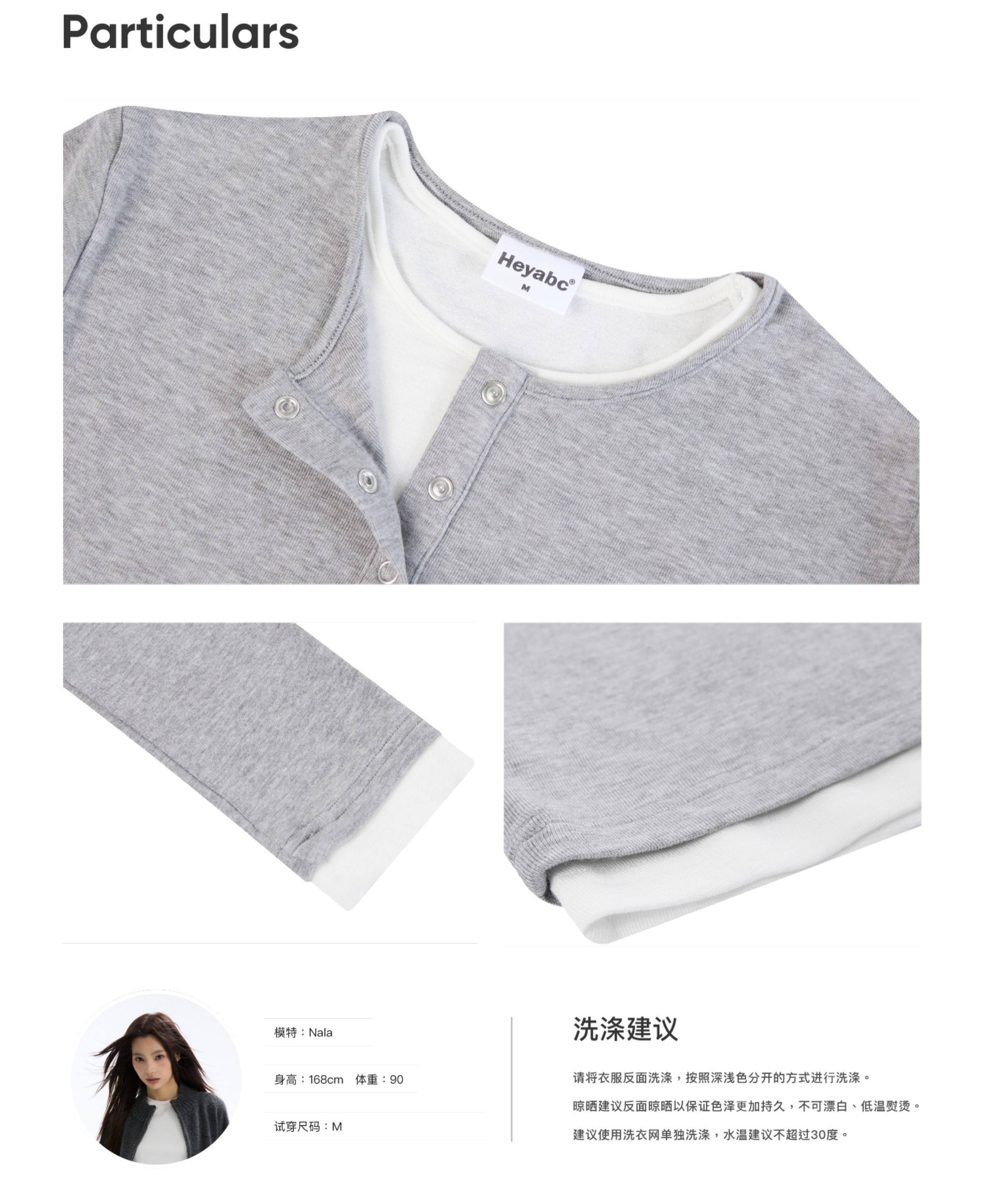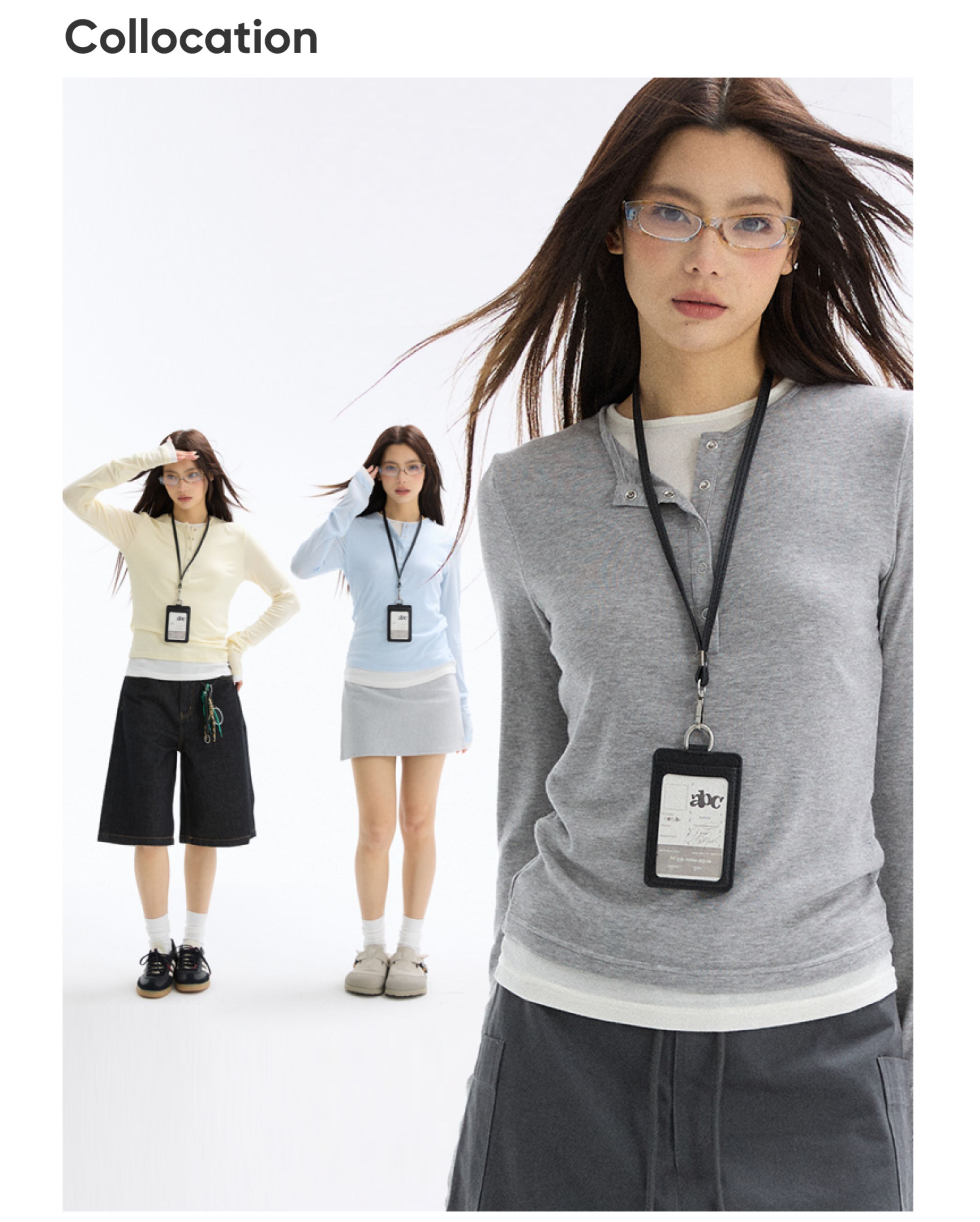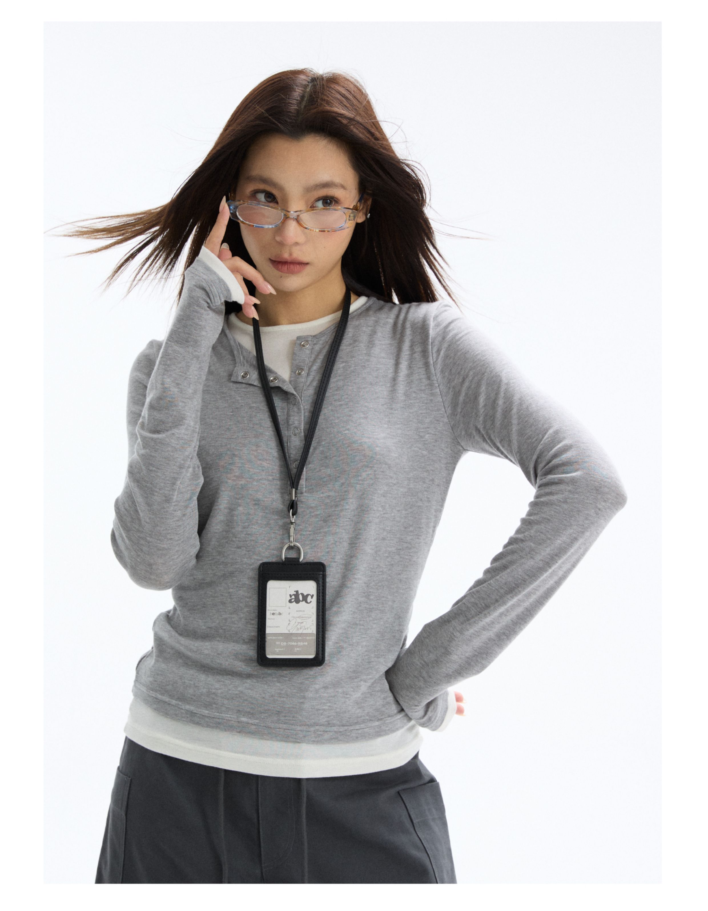Heyabc Henry Collar Tencel Wool Base Layer Soft Faux Two-Piece Button-Up Top Women's Slim-Fit Long-Sleeve T-Shirt