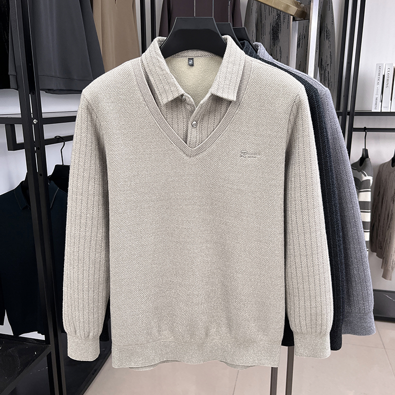 Romon Winter Two-Piece Sweater for Middle-Aged and Elderly Men, Polo Shirt with Long Sleeves, Fleece-Lined, Thickened, Warm Base Layer Shirt