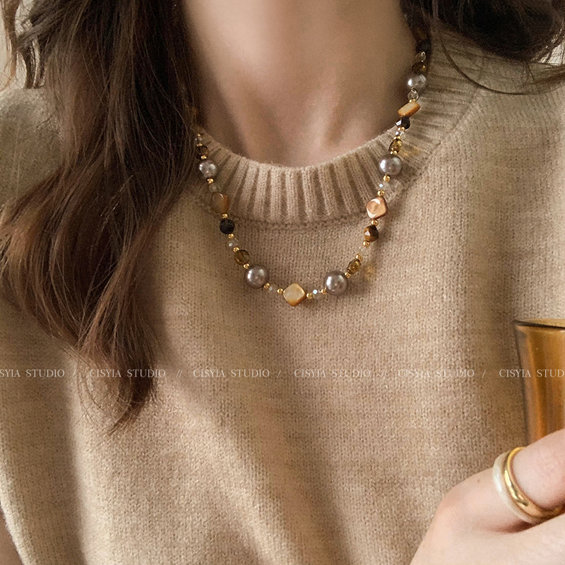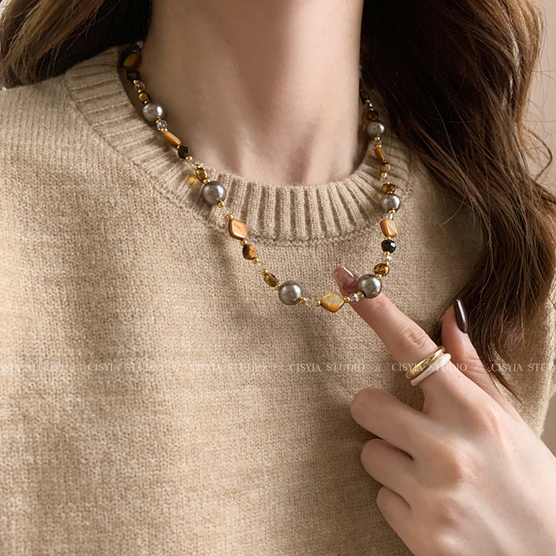 Tiger's Eye Stone Beaded Sweater Chain for Women, Spring Vintage Style, Gentle and Niche, High-End Light Luxury Necklace Accessory