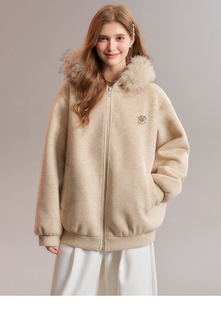 Qdqd Original Hooded Fur Collar Woolen Coat with Cotton Padding, Thickened and Warm for Autumn and Winter, Zip-Up Sweatshirt Jacket