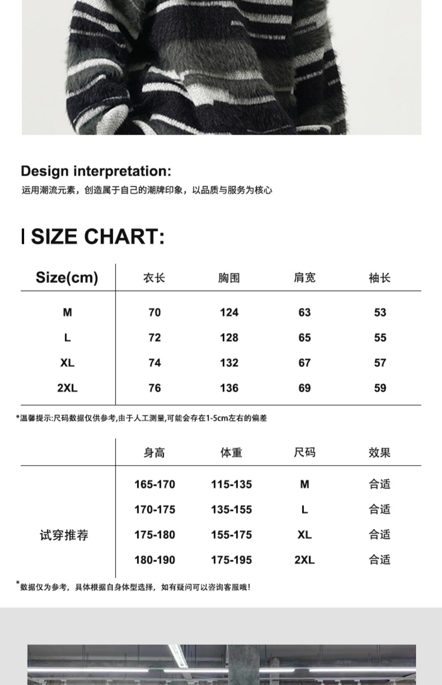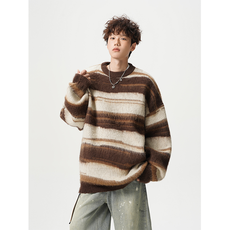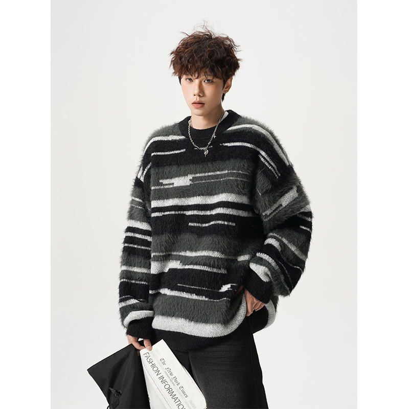 Mohair Round Neck Sweater for Men and Women, Autumn and Winter Casual Color-Block Striped Knitwear, Loose and Relaxed Couple's Base Shirt