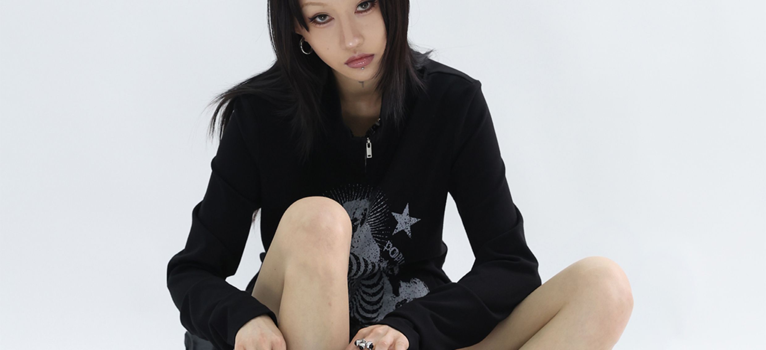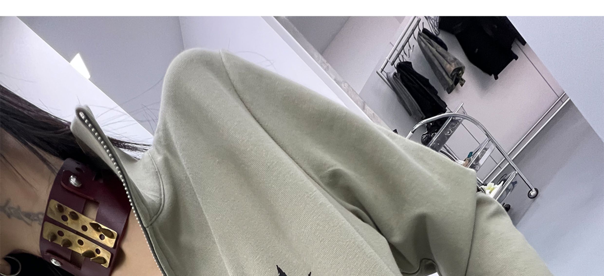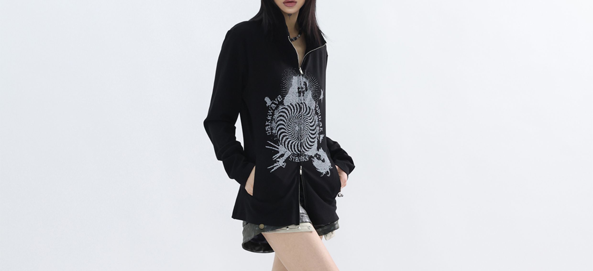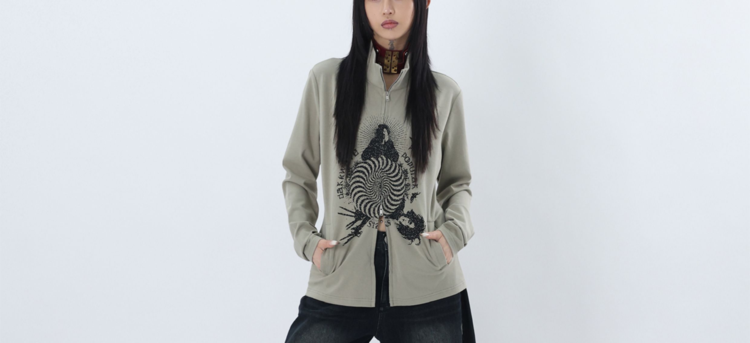 Meiya Fuzzykon Spring and Autumn Cotton Waist-Cinching Slightly Loose Punk Double-Zipper Printed Long-Sleeve Top Jacket
