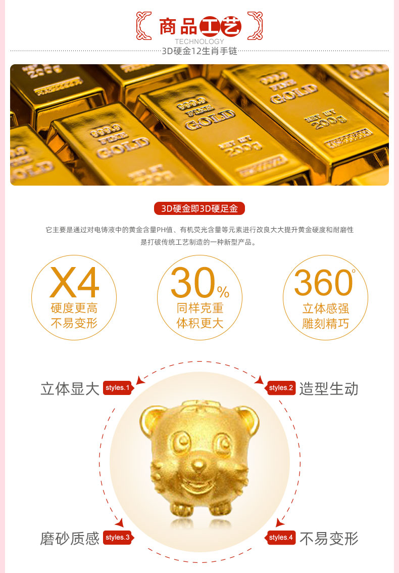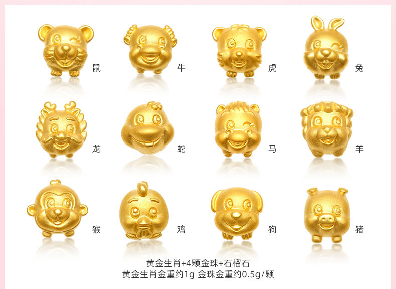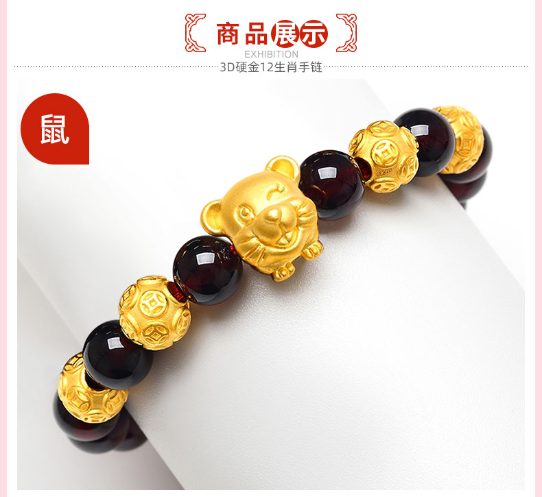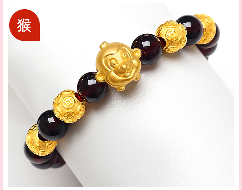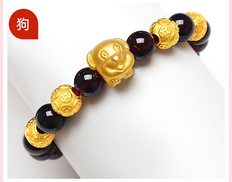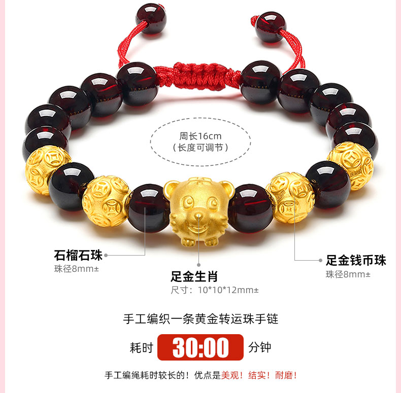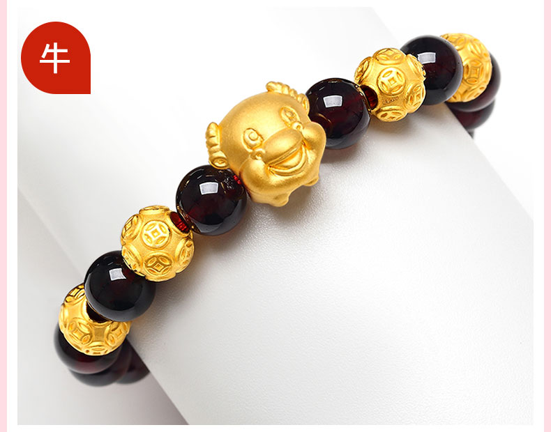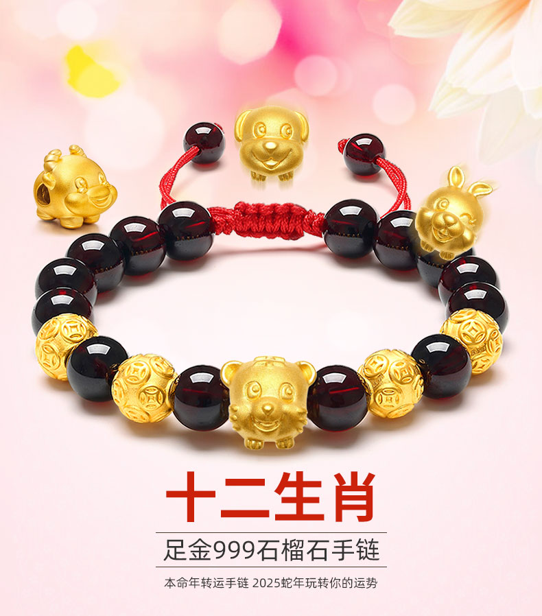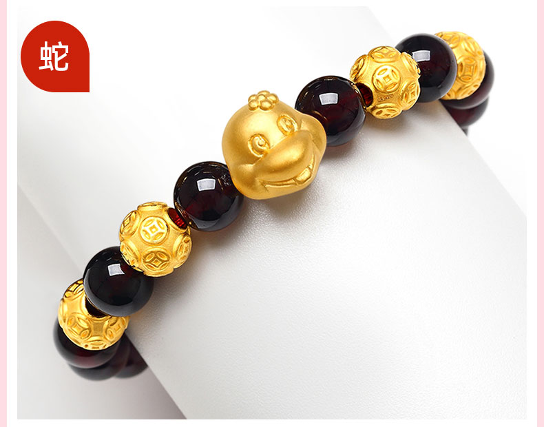 12 Zodiac Gold Bracelet for Women, Pure Gold 999 Zodiac Snake Garnet Fortune Bead, Zodiac Year Snake Bracelet