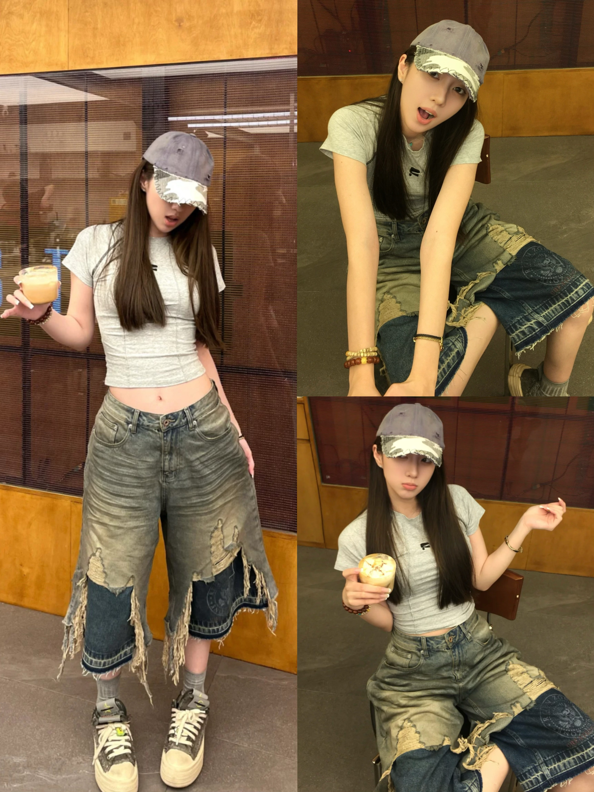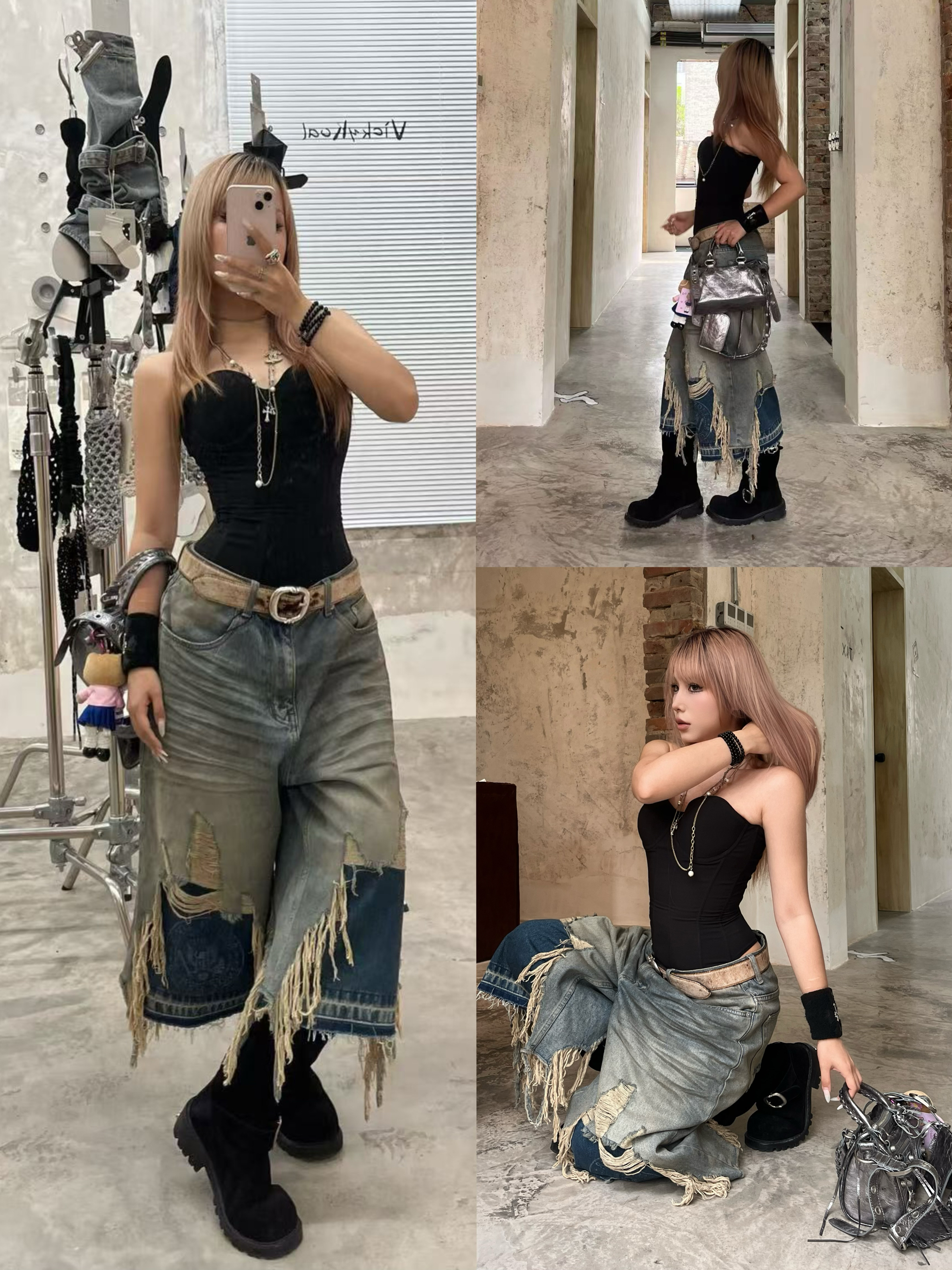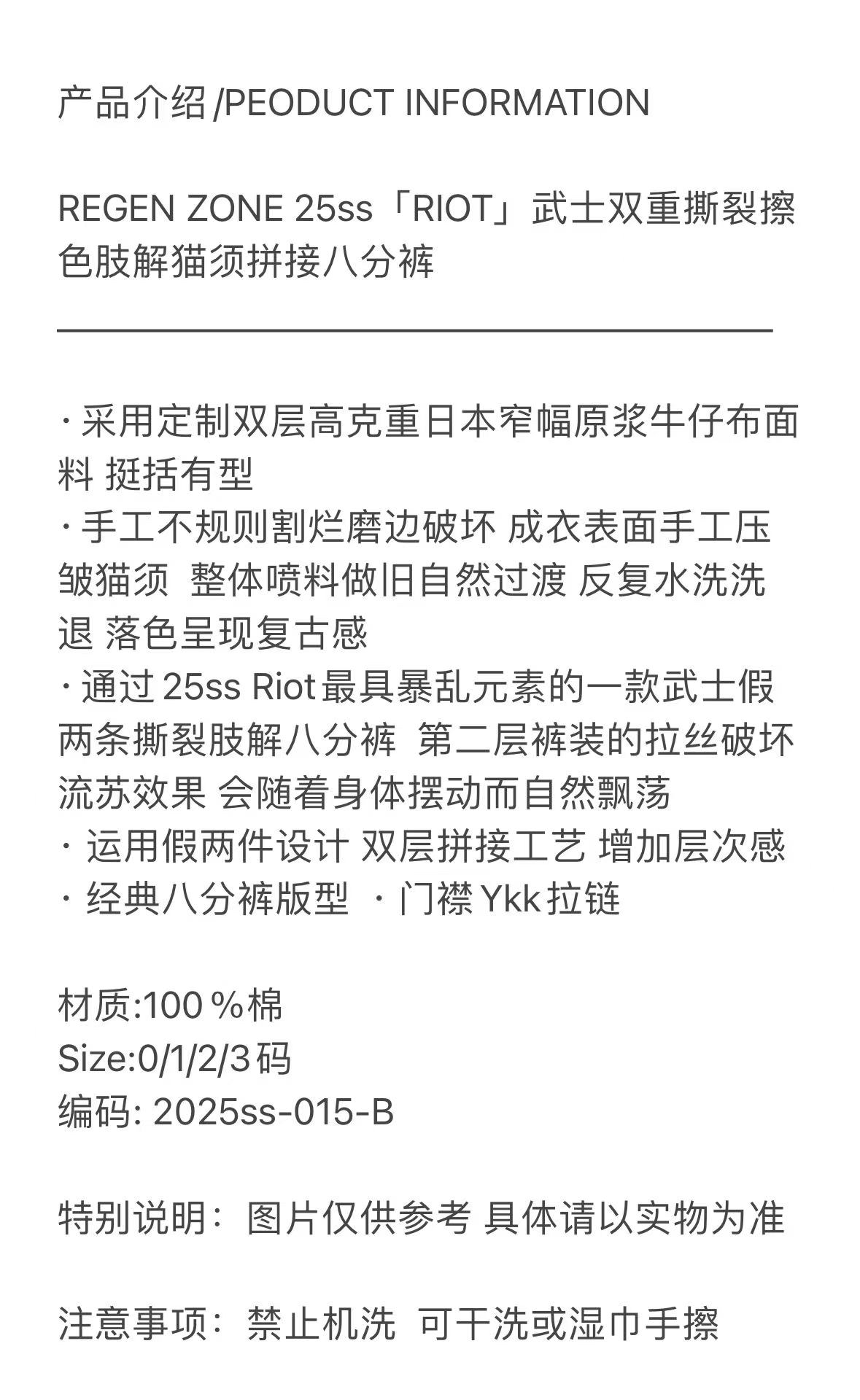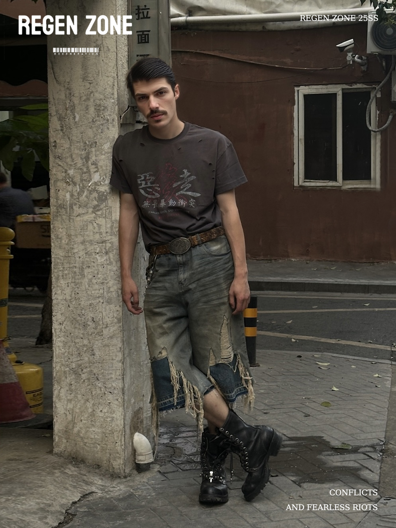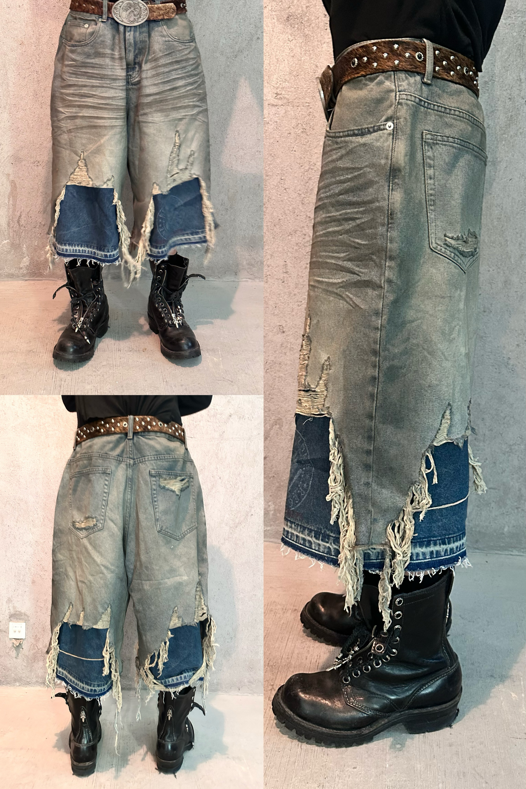 Regen Zone 25Ss「Riot」Samurai Double-Tear Distressed Color-Blocked Whiskered Patchwork Cropped Pants