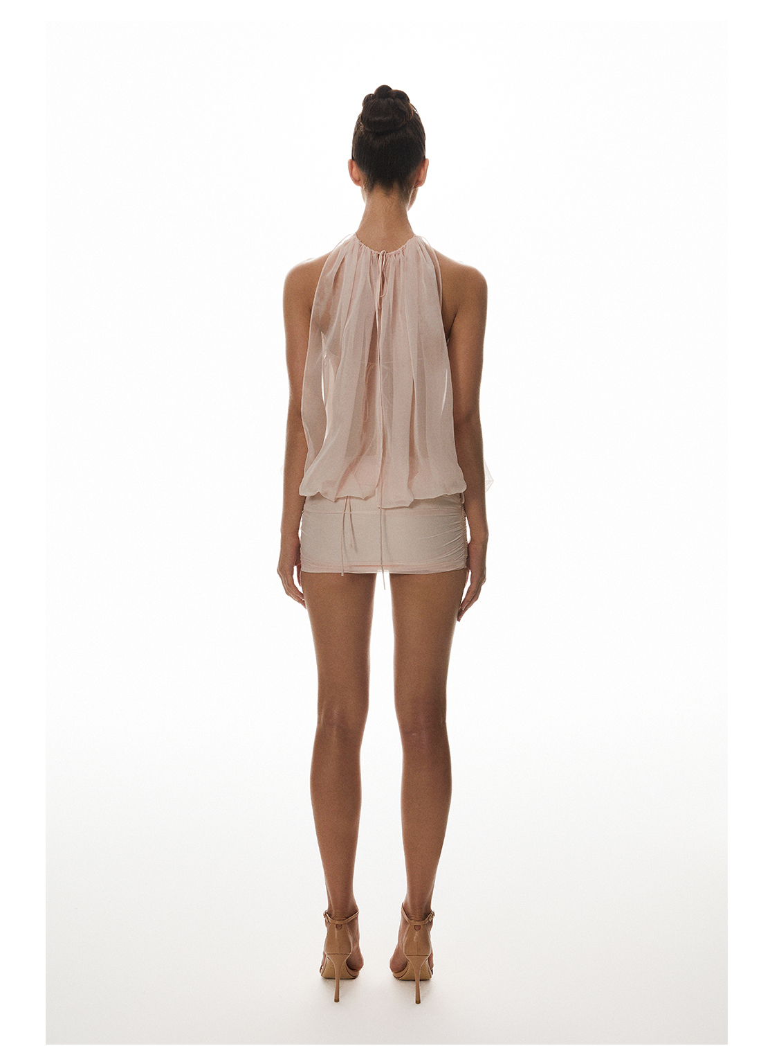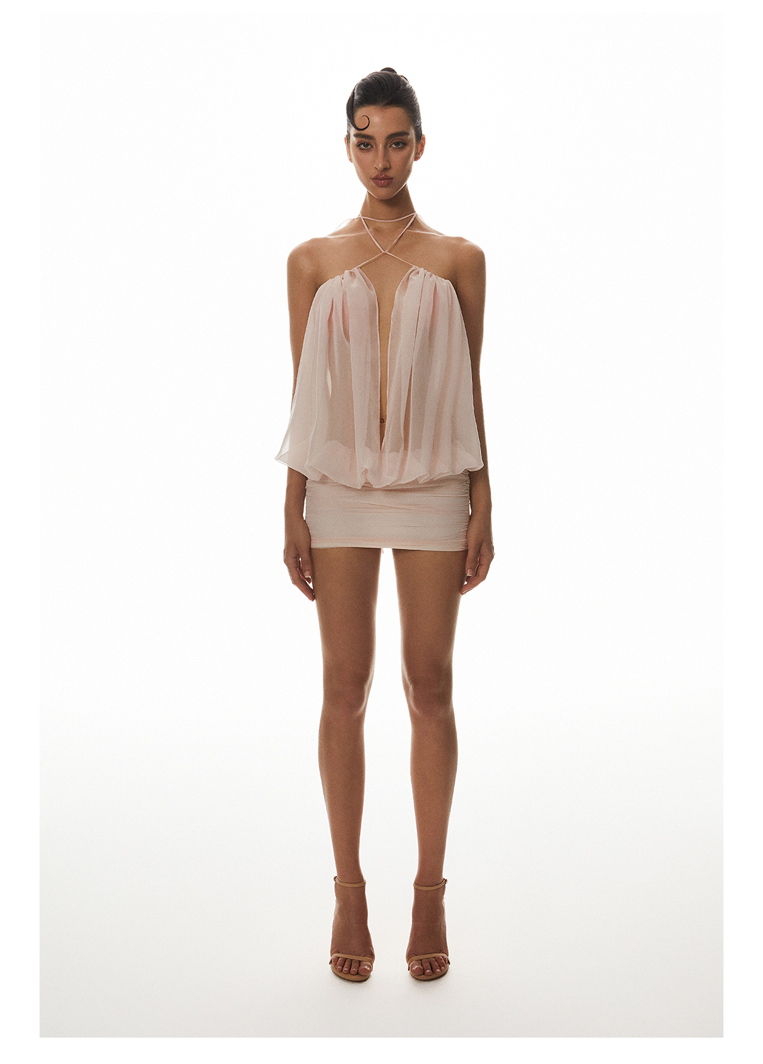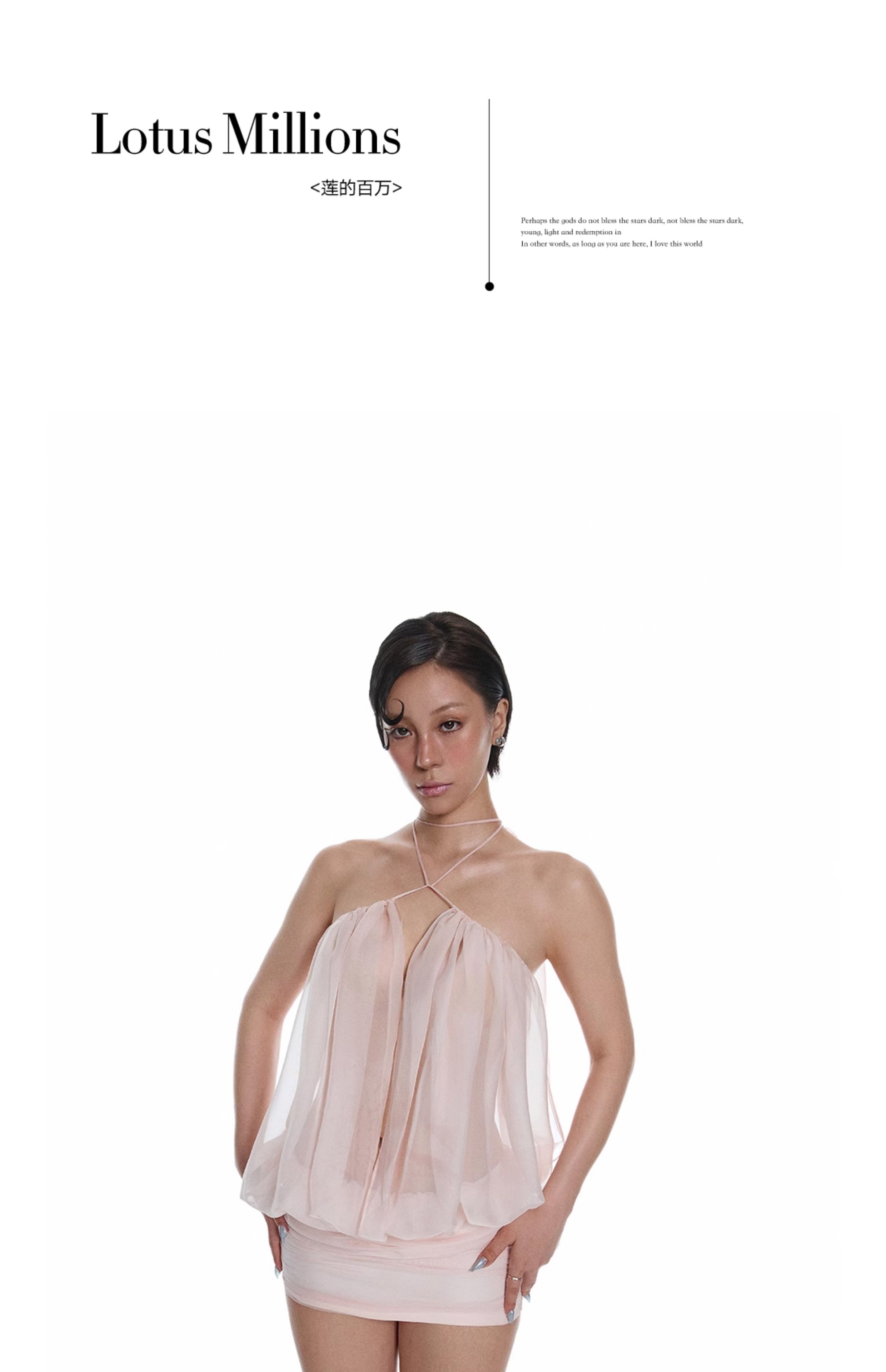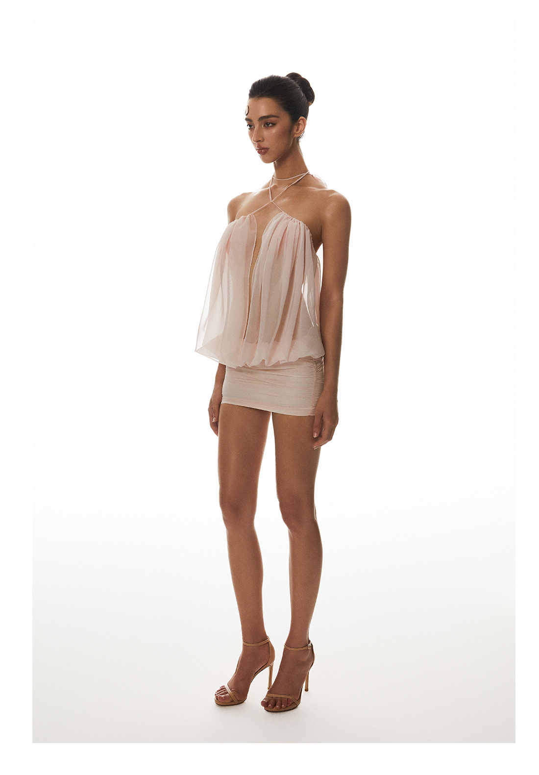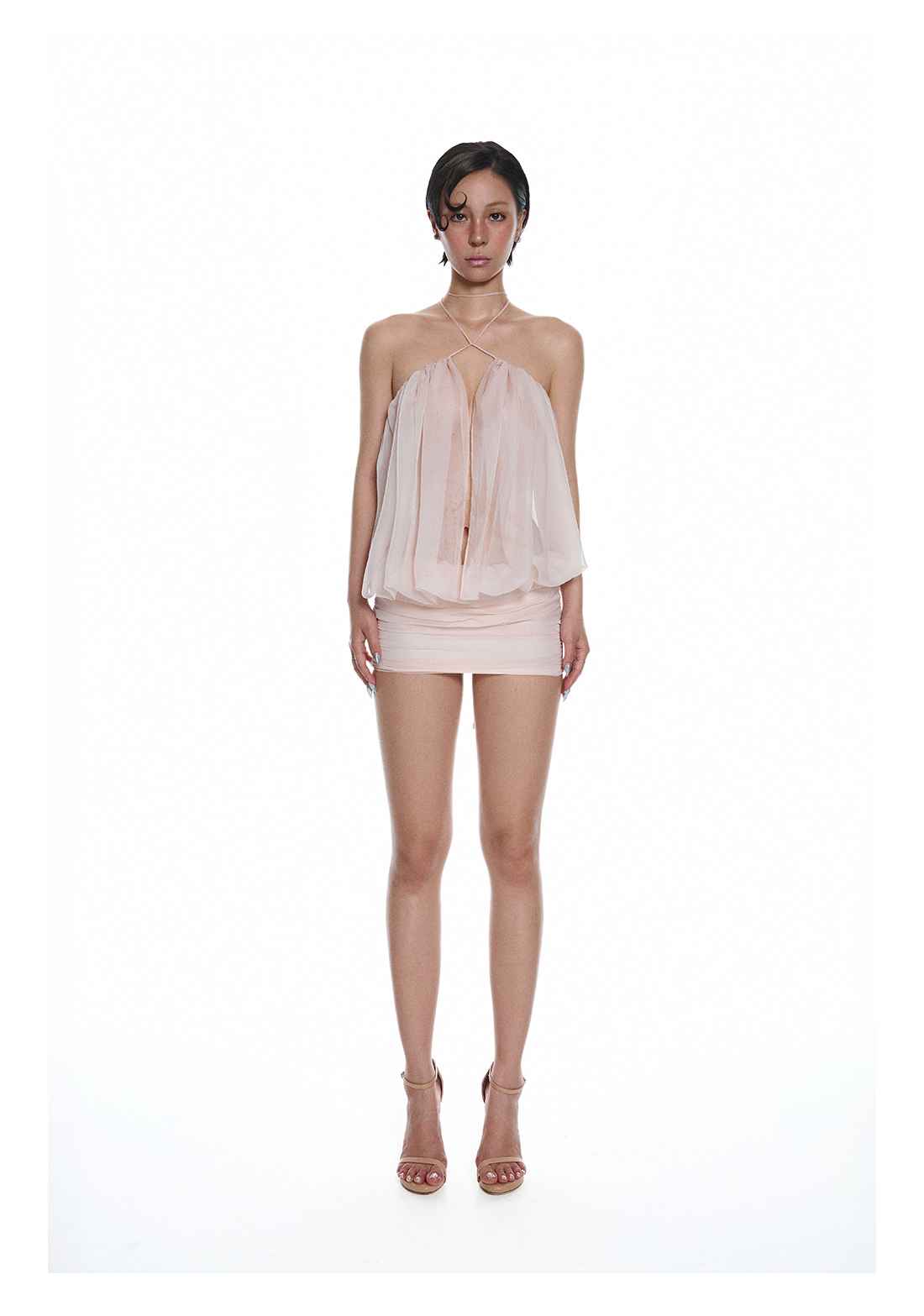 Lotus's Million Pure Desire Girl Sexy Sheer Nude Pink Halter Dress (Comes with Nude Invisible Bra)
