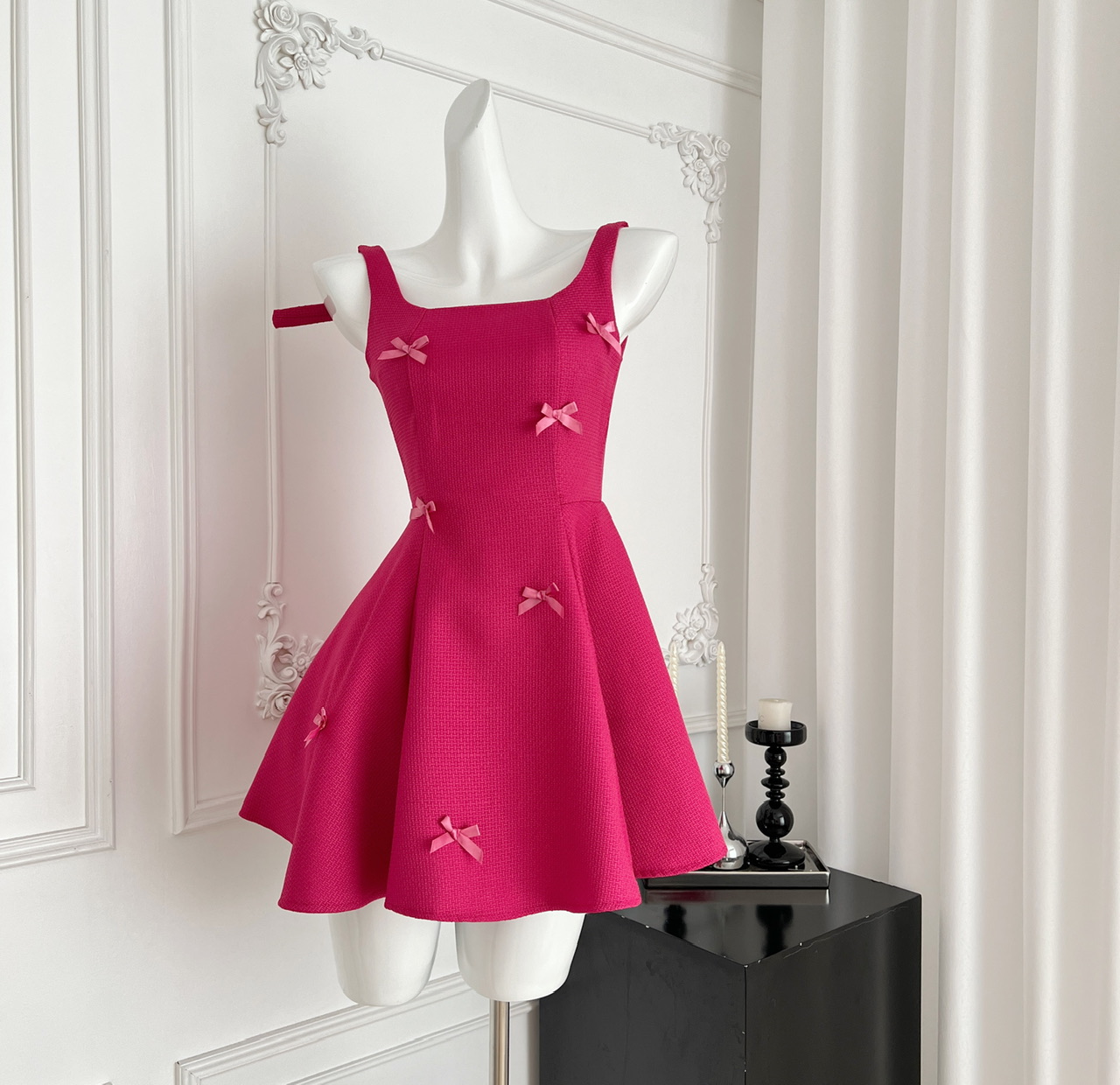 Rose Pink Bow Square-Neck Suspender Dress for Women, Summer Pure and Alluring Style Dress, High-End and Elegant A-Line Short Skirt